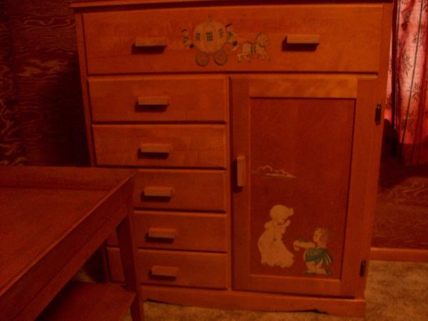 Storkline wardrobe dresser with Cinderella hand-painted characters. Crib rails