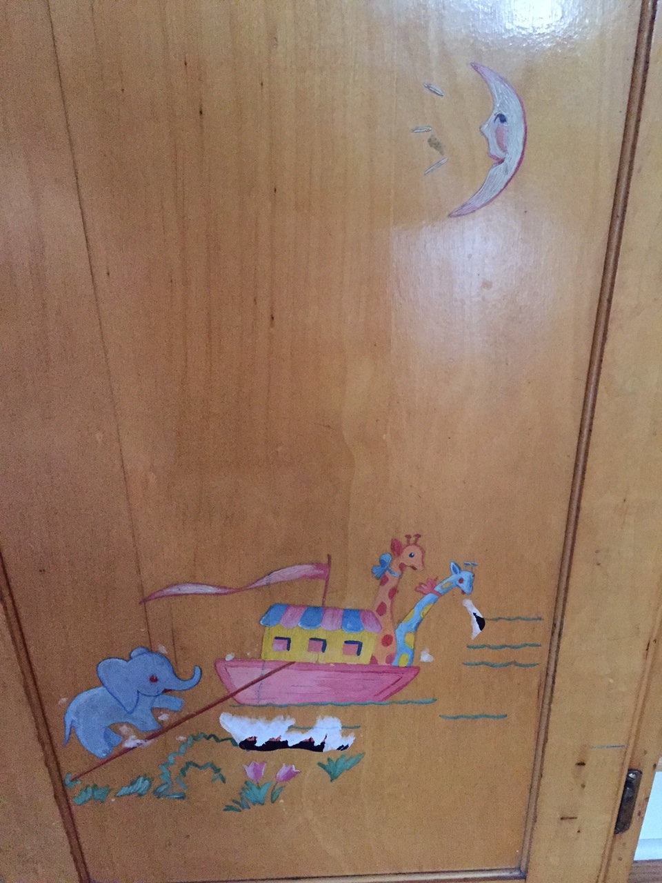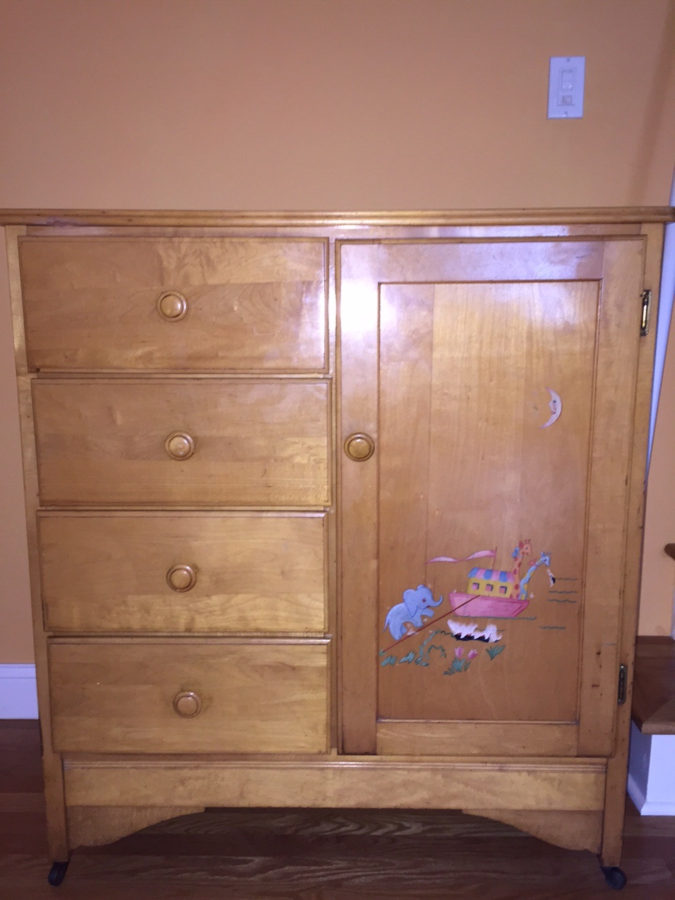 This is a Storkline Dresser of Chicago, Ill. I believe it is from the early 1950s. There is a side cabinet with a sliding rod for hanging baby clothes and 4 drawers, plus little wheels at the bottom for easy moving. The painting on the front looks like it's Noah's Ark with a Man in the Moon at the top of it. It is of solid wood of a blonde color. The top of the dresser has a couple of marks on it, possibly from an old sticker and can possibly be removed with the right cleanser. Otherwise, it's in excellent condition. Would like an idea of its value as I'm looking to sell this piece. It has been in the family for many years.