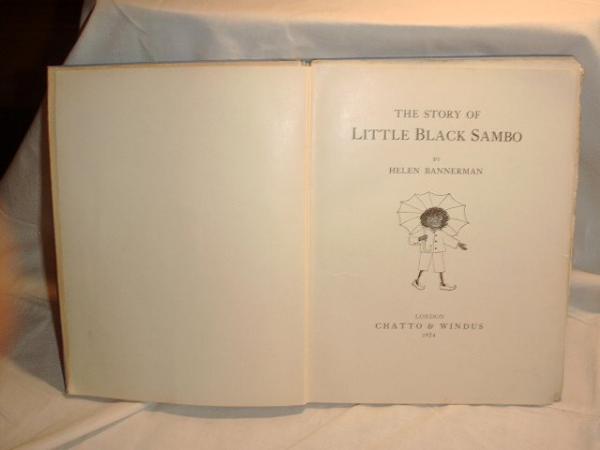 lt blue hardcover book with black etching of little black sambo holding an umbrella, London, Chatto & Windus, 1924