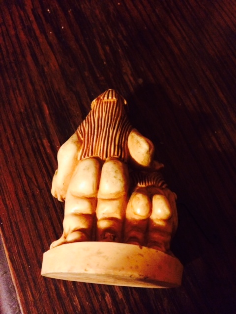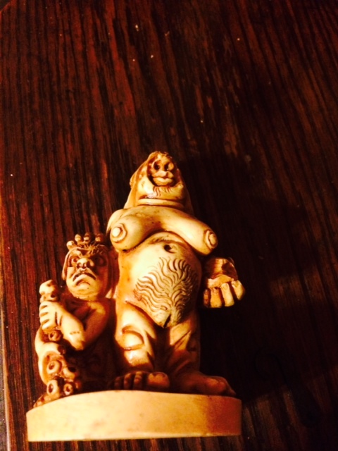 Had a hard time placing this in a category. I bought this "thing" at a thrift store in Germany in the early 80's.I'm not sure if it made out of bakelite or alabaster.I know when you shine it up it is highly gloss.It depits a caveman/woman dragging a cavechild with a biiten apple in her hand.It also depicts her very large sexual organs and lips. On the back of her foot is engraved with the initials LT. That's all I know about this statue. Thanks for any info