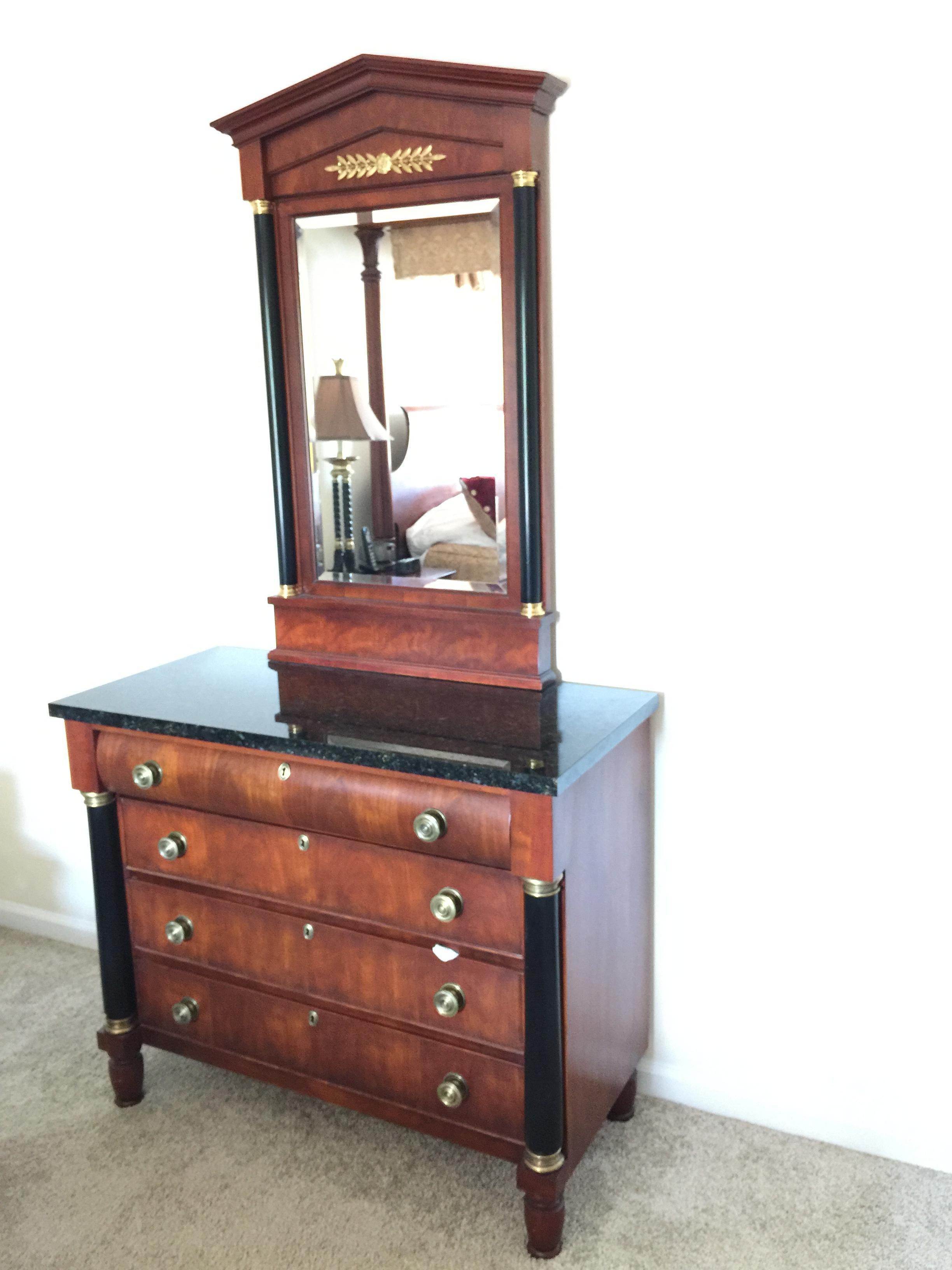 A Chest of Drawers and Mirror with an onyx marble top is the perfect addition to the bedroom set.