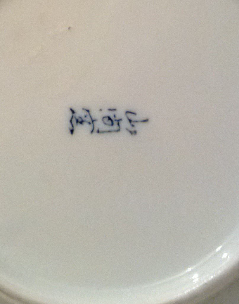 Strawberry plate, has textured berries and writing on the back that I can not identify.