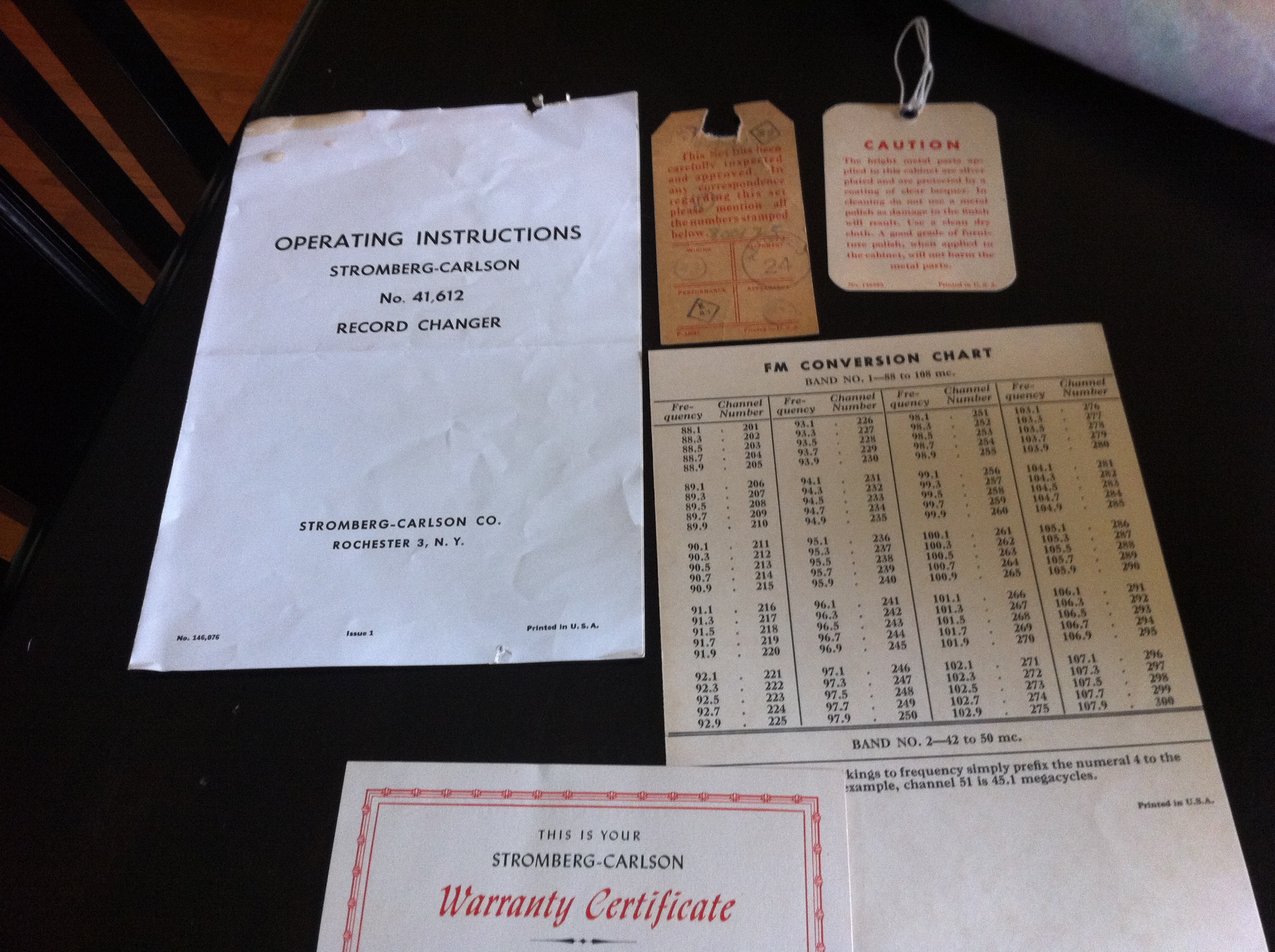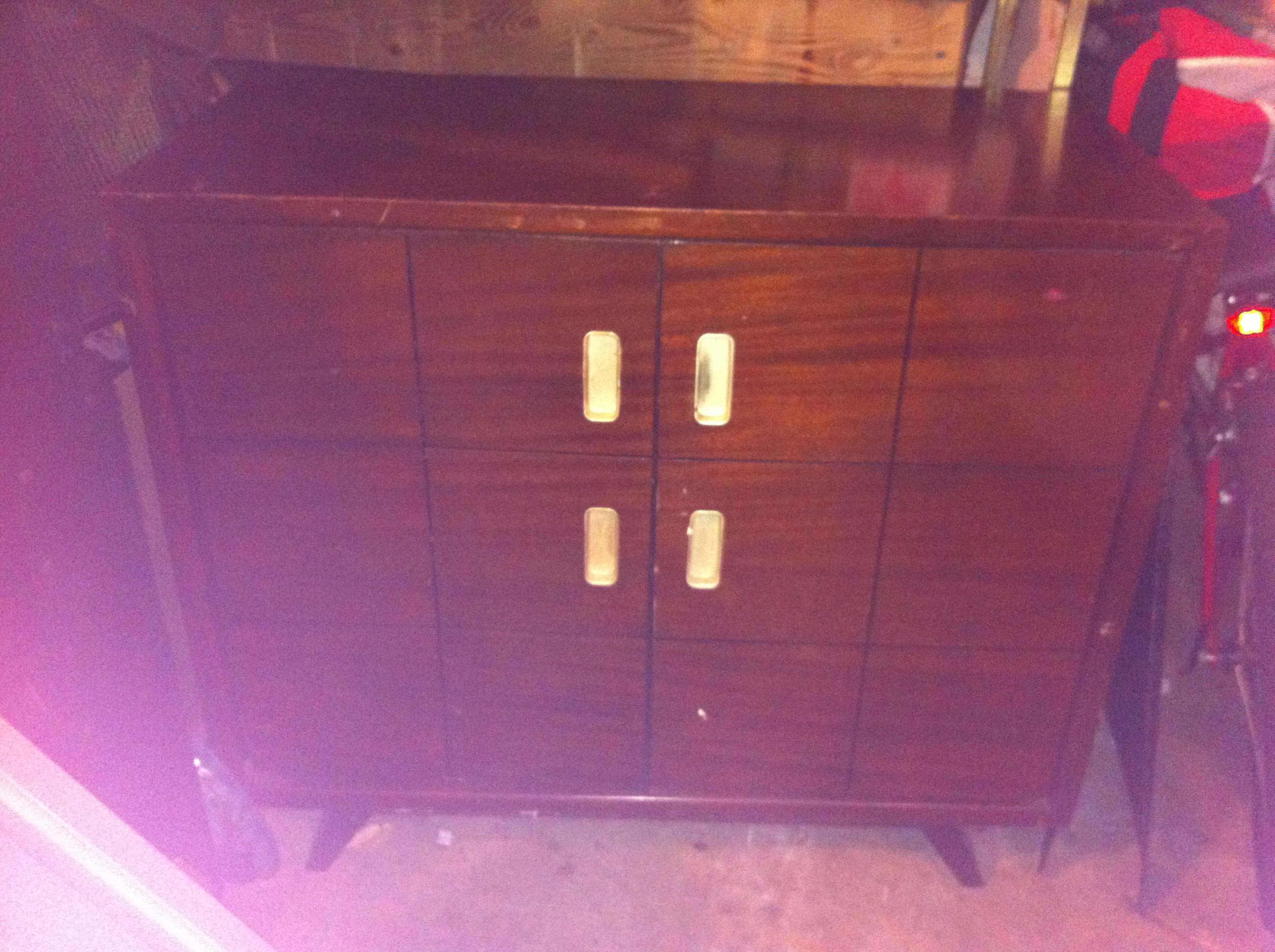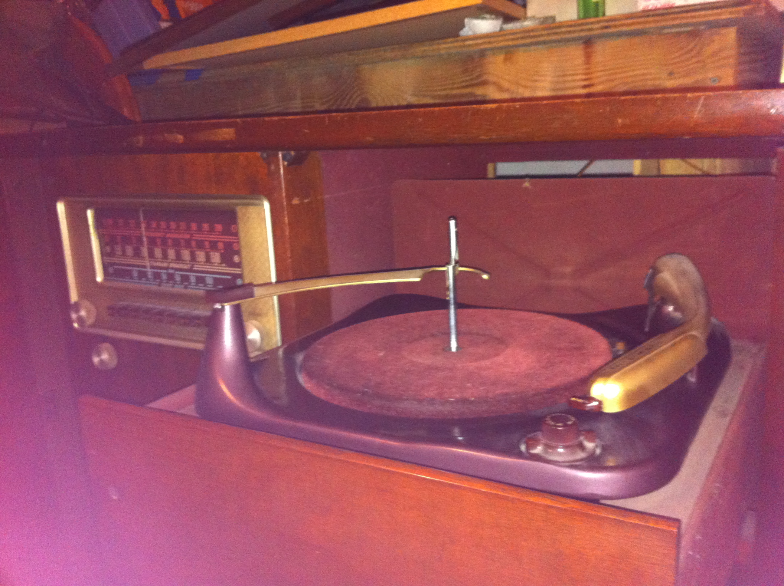 Radio and record player console - I think console is mahogany. Cabinet opens from front and is in good condition. I have original manual and other paperwork. See pictures.