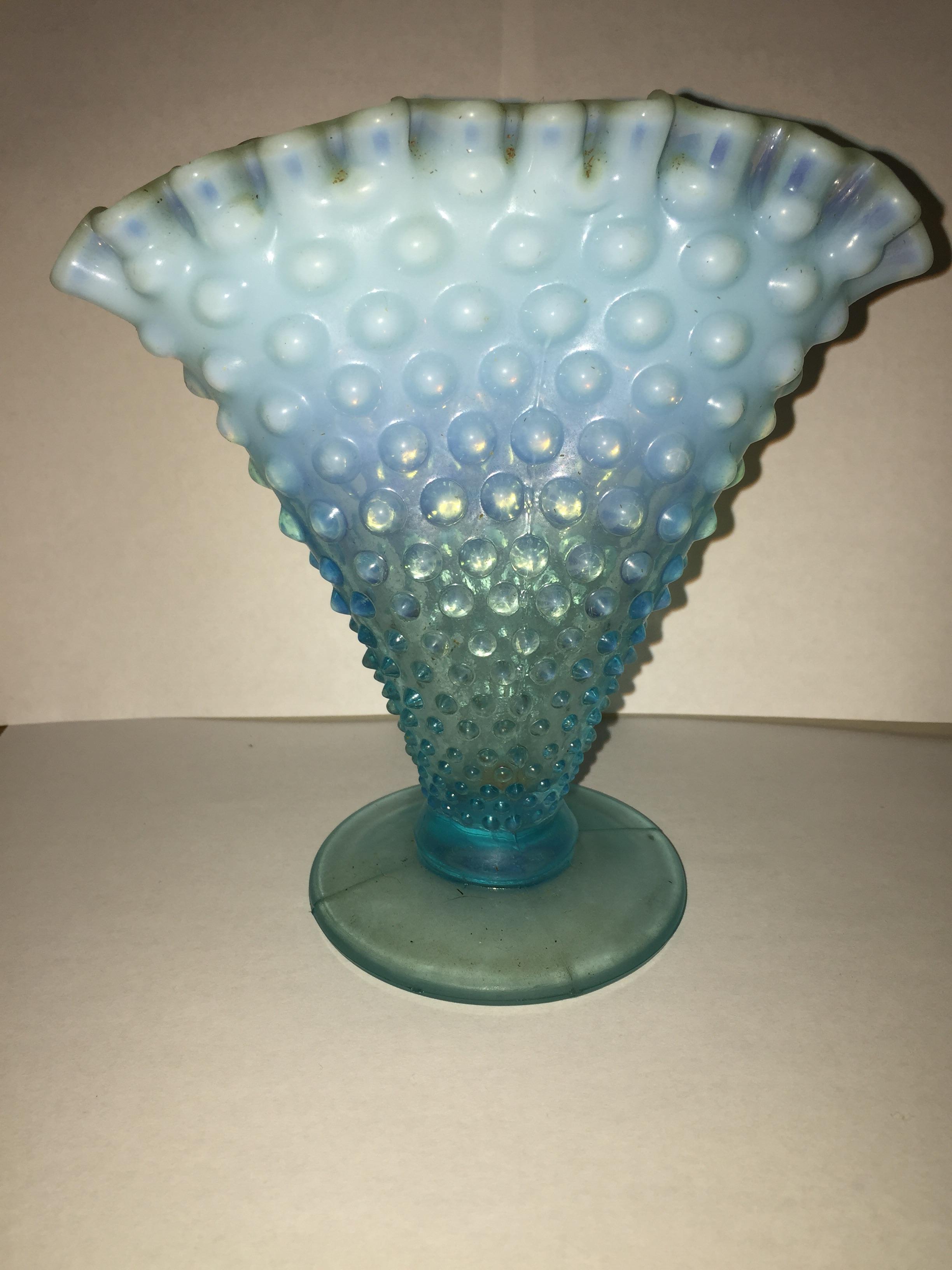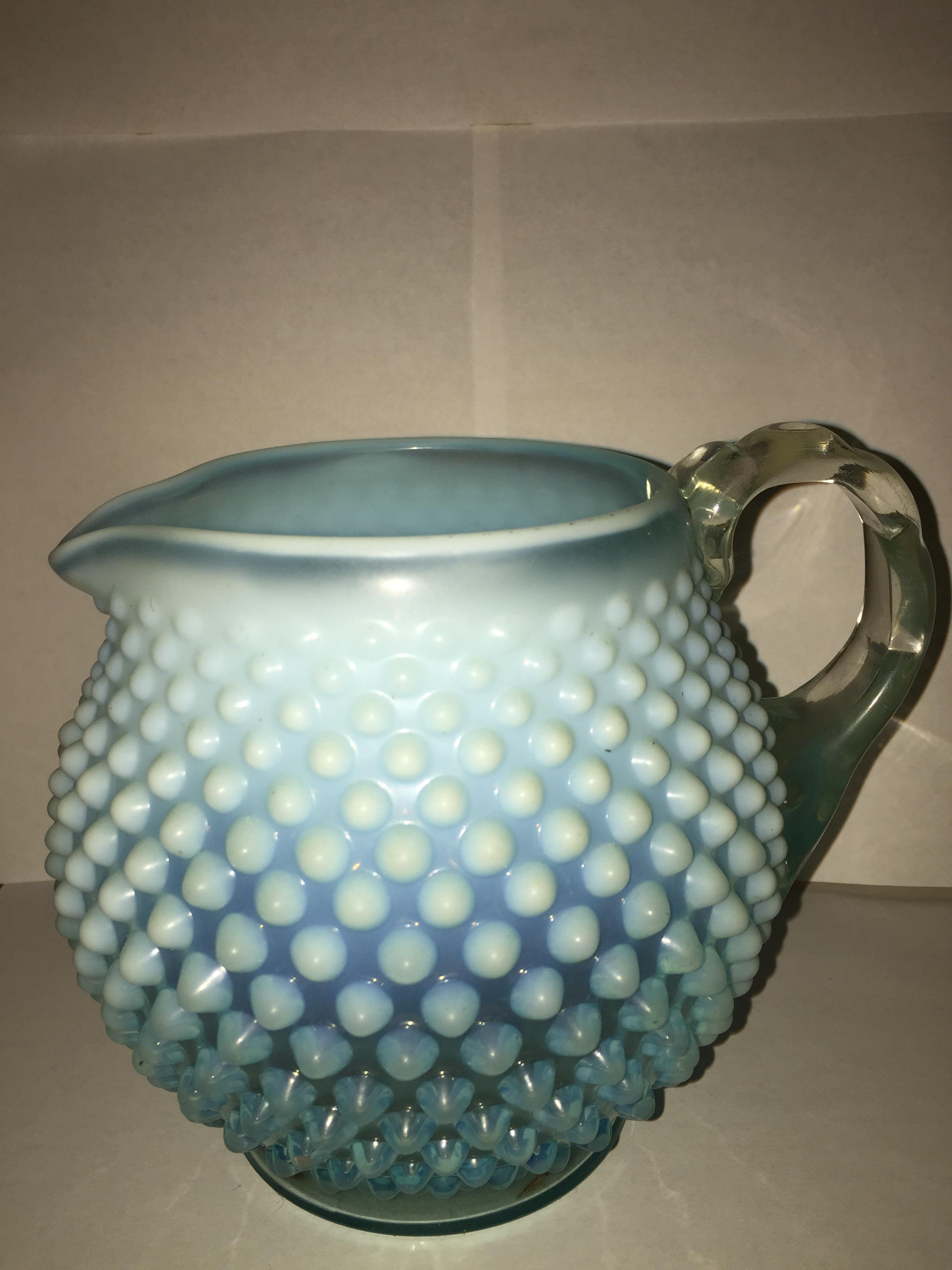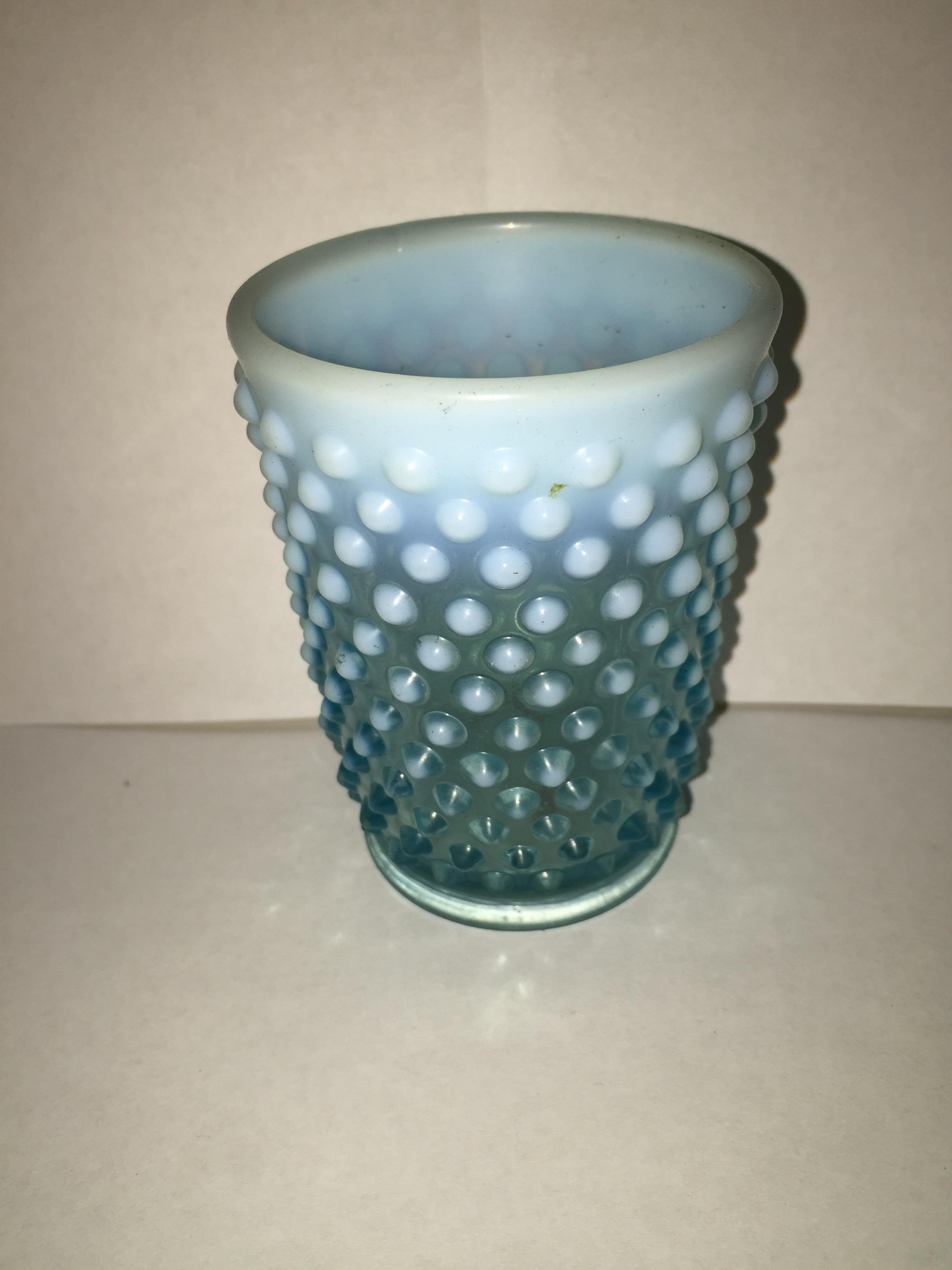 Blue glassware which transitions upward from transparent to translucent, and which is covered with little hemisphere-like studs.