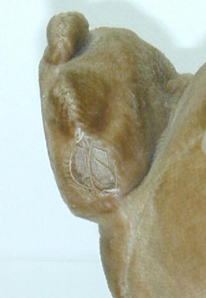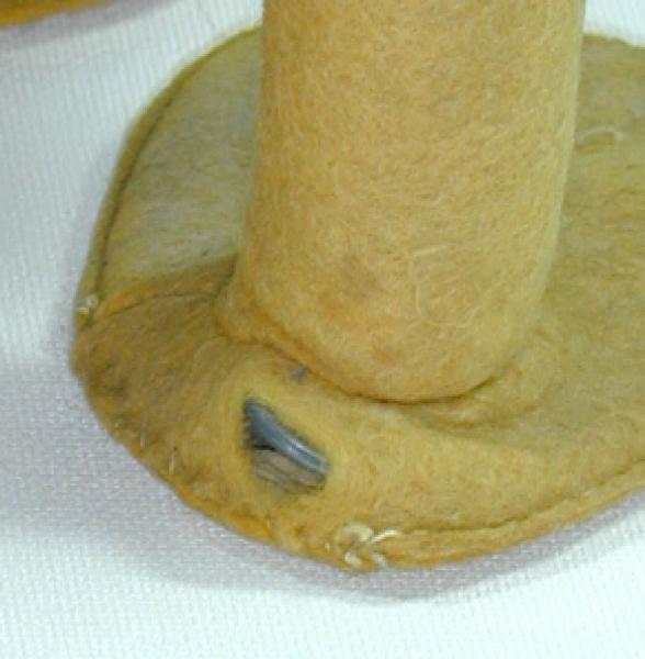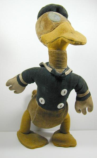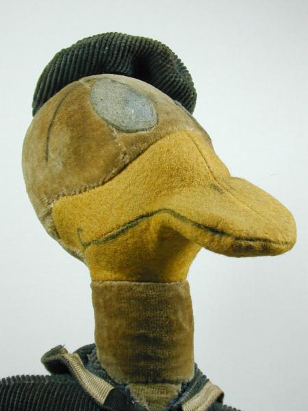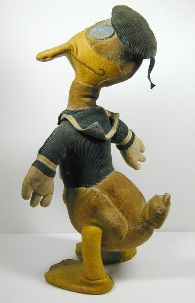 This stuffed Donald Duck doll is very dirty, missing a button, has a split seam in tail, and the wire is poking through on a foot. But it seems to have a good, solid foundation and might be restored nicely. It is made of different fabrics over a wire frame, which appear to be velvet on the bottom and head, felt on the feet, legs, and bill, and perhaps chenille for the jacket and cap. There is also a a hard disc shape in the tail, like it might have been a squeaky toy at some point. The smile and eyebrows and nostrils appear to have been painted on, rather amateurishly. Maybe they weren't on the original?