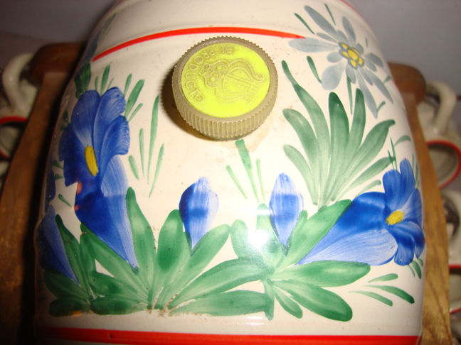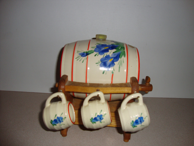 hand painted.  Might sell it to right buyer.  The yellow cap on top of the "keg" is plastic and has a picture of what may be a harp? or some kind of royality symbol.  The cap also says "el producto"