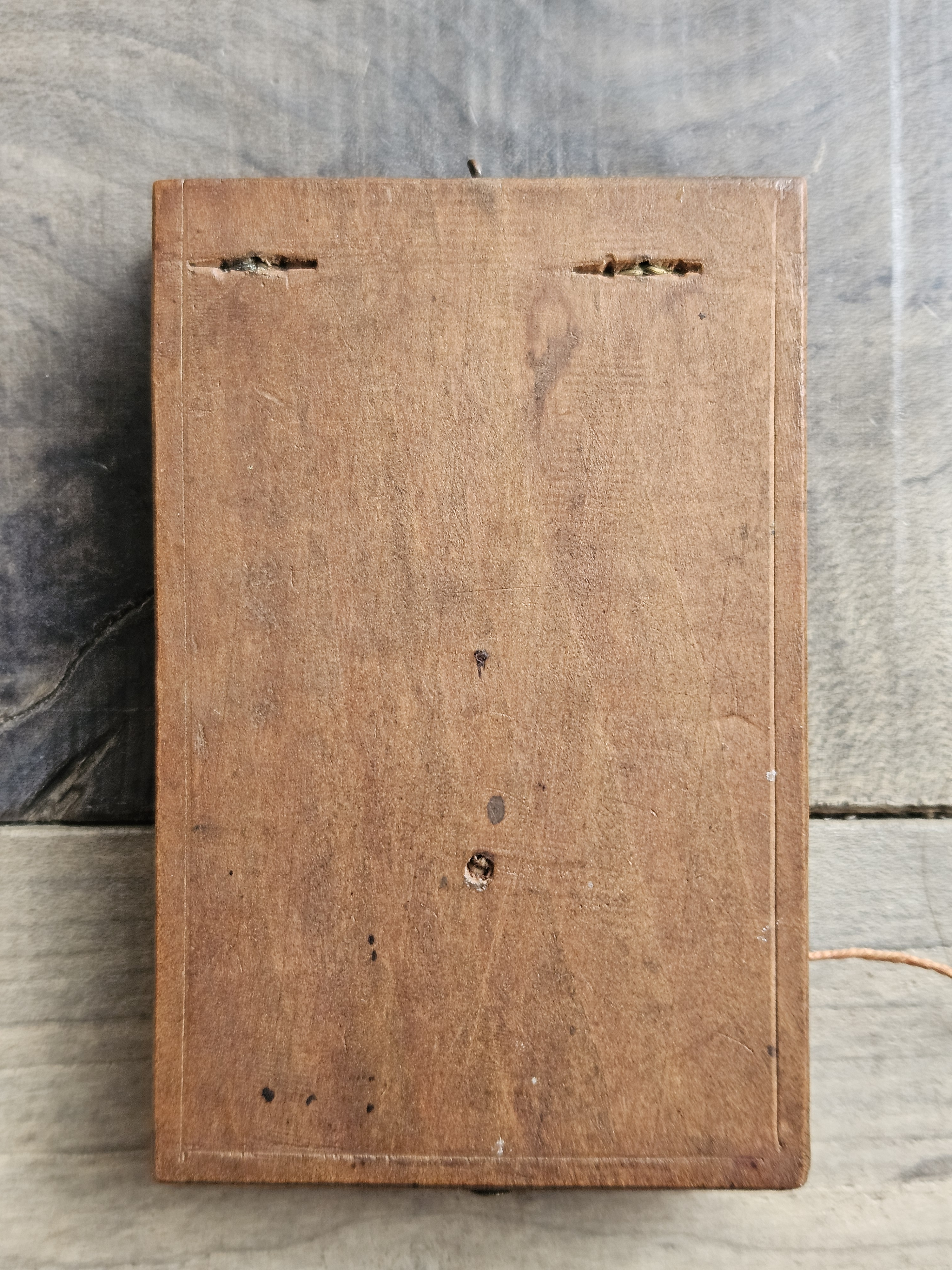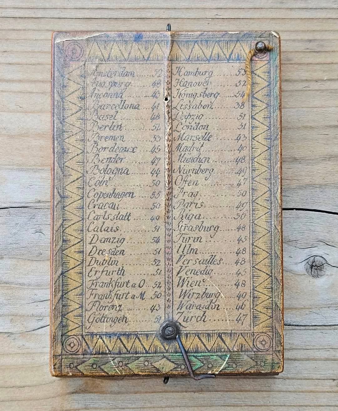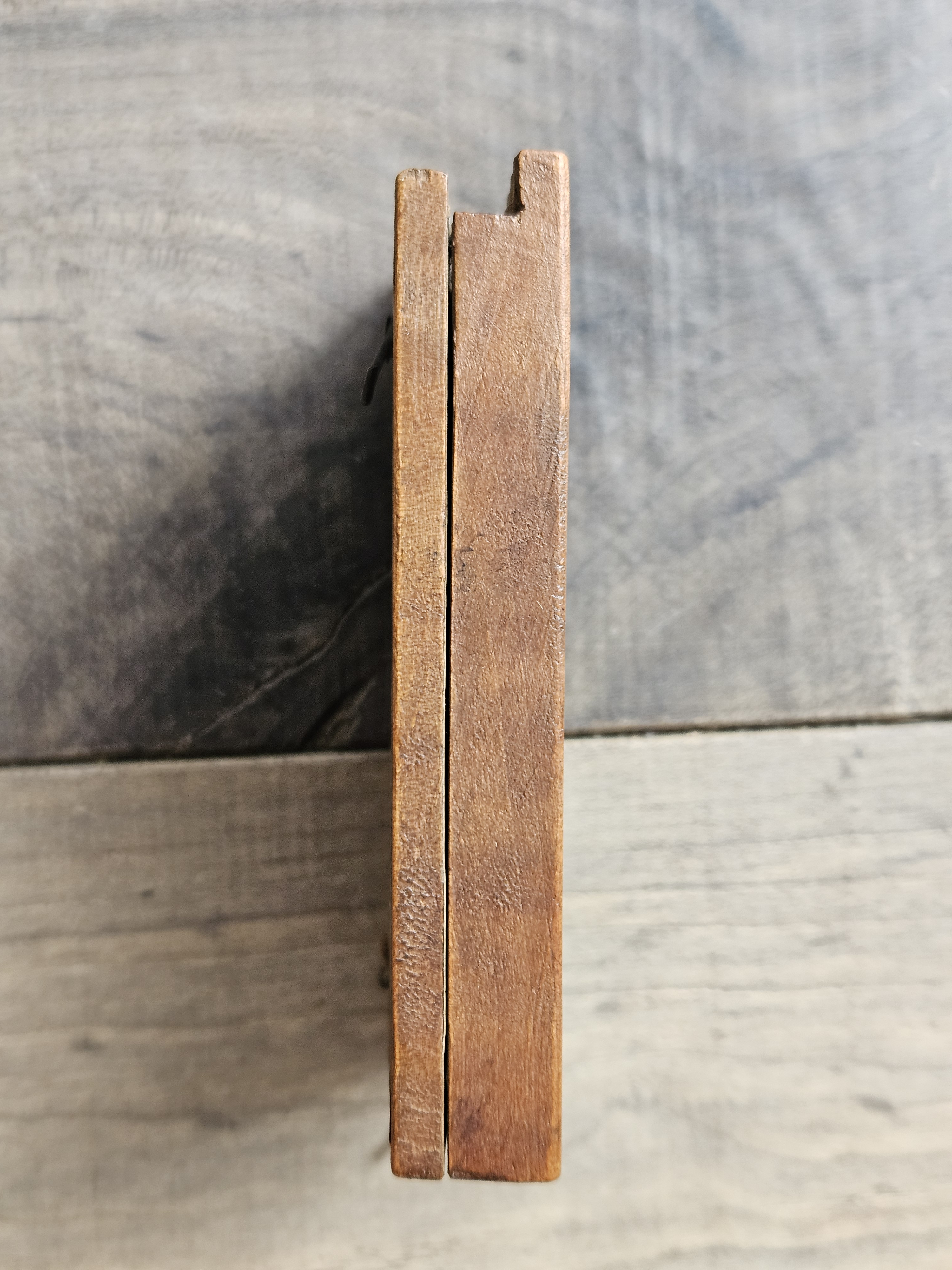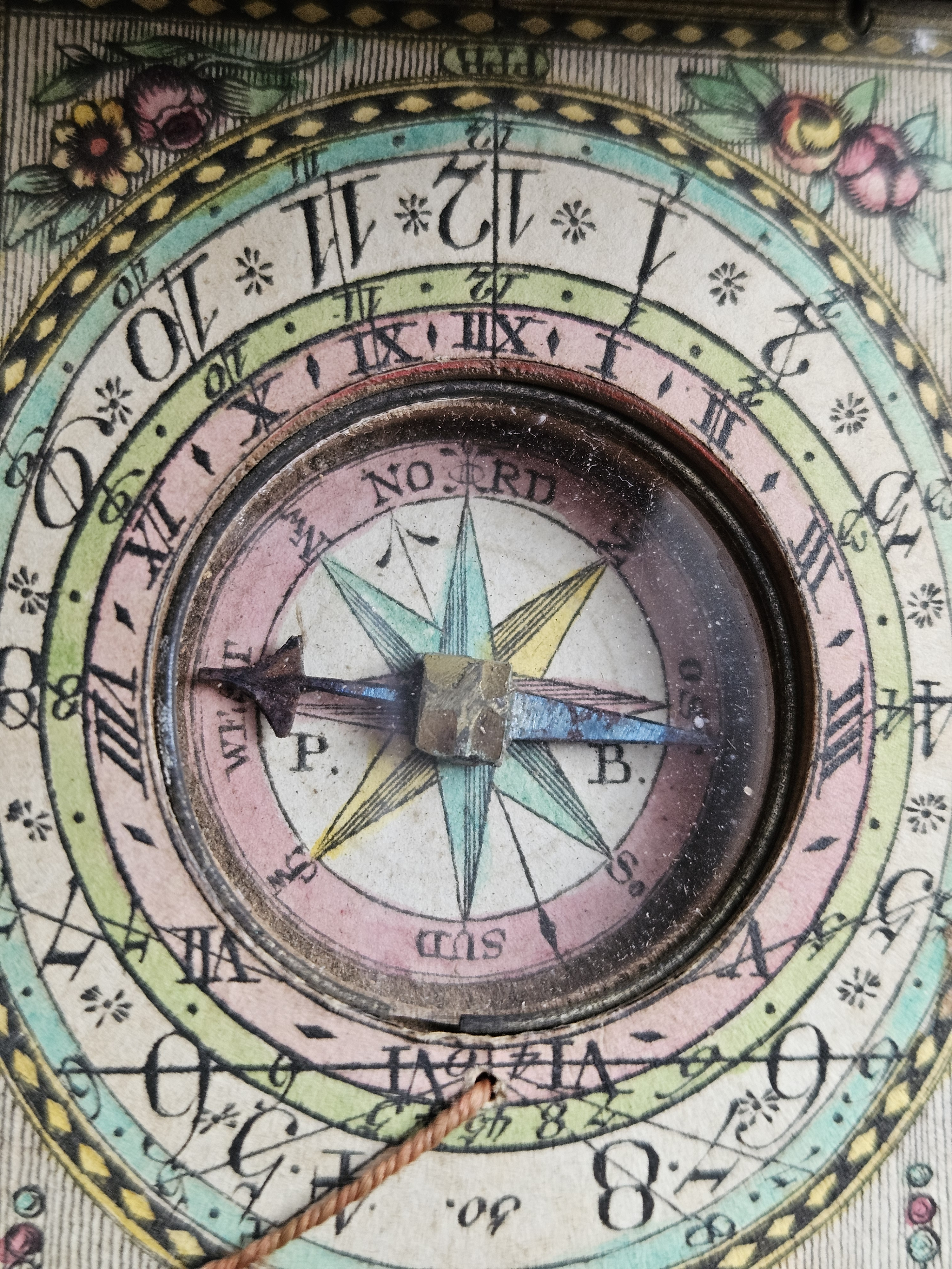 Physical Description: This sundial compass is a compact, rectangular device made primarily of wood and paper. The exterior features intricate floral designs and a compass rose, with a glass cover over the compass mechanism. The dimensions are approximately 4.5 inches long, 3 inches wide, and 1 inch thick when closed. The compass needle is functional but shows signs of rust, and the glass has a single bubble, indicating age and wear.