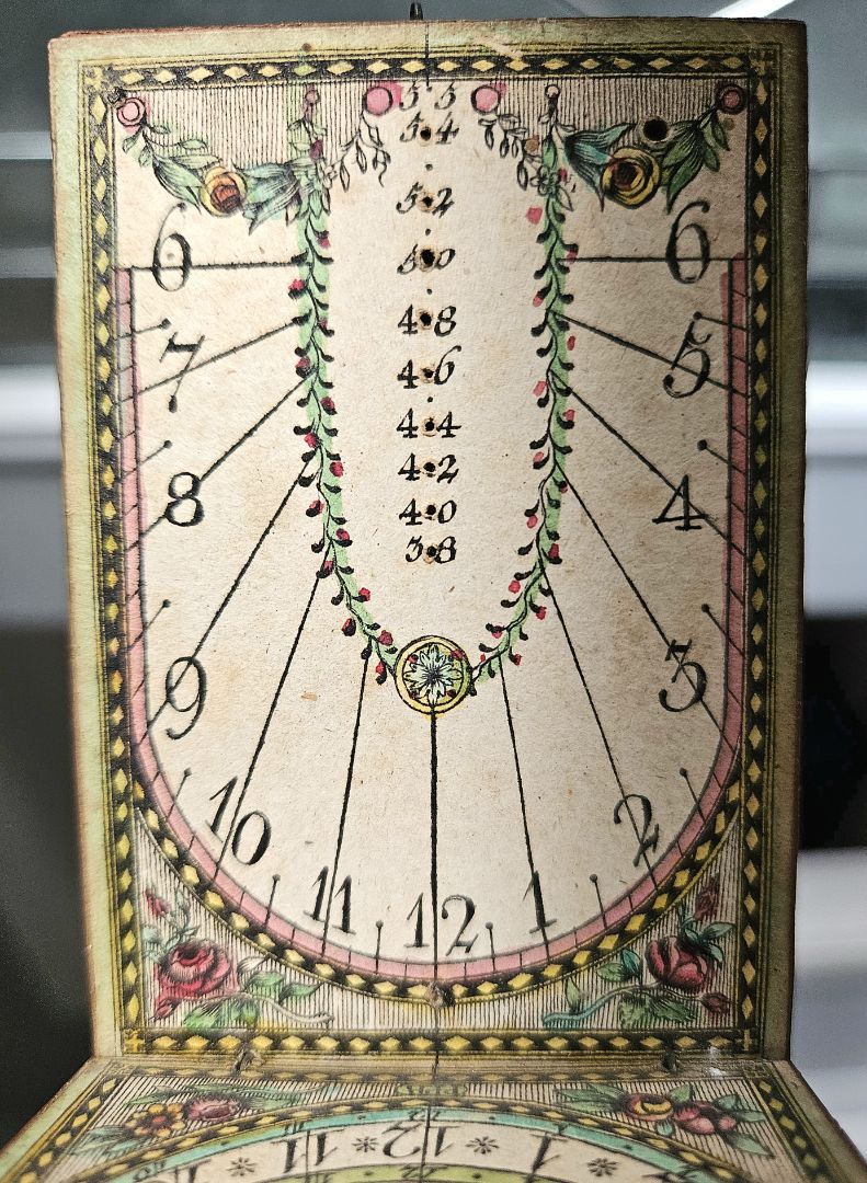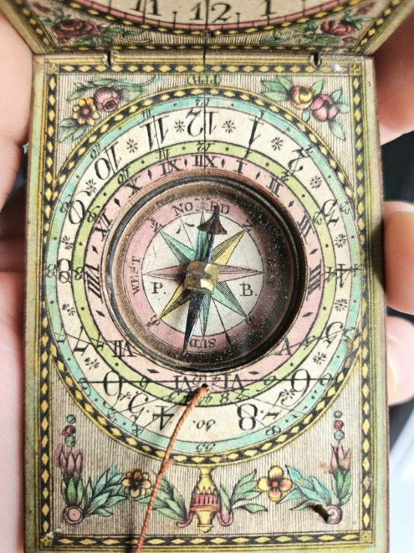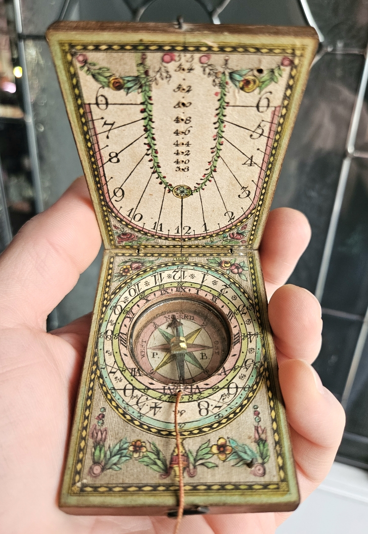 This sundial compass likely dates back to the late 18th to early 19th century, based on the design elements, materials, and construction techniques typical of that period. The floral motifs and the style of the compass are consistent with items produced during that time.