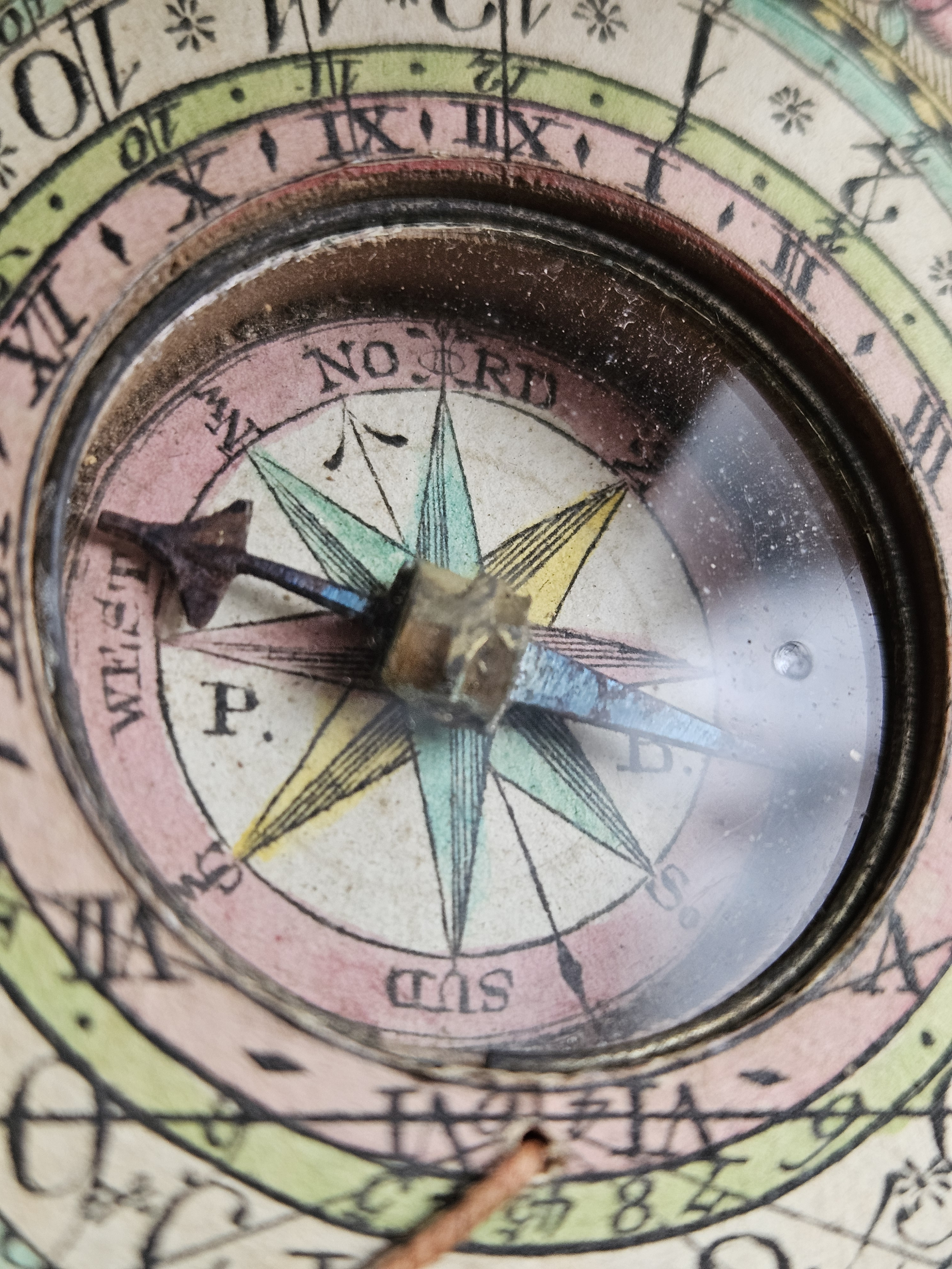 Condition Notes: The sundial compass shows wear consistent with age, including a broken string, rust on the compass needle, and a bubble in the glass. These factors affect its aesthetic appeal and functionality.