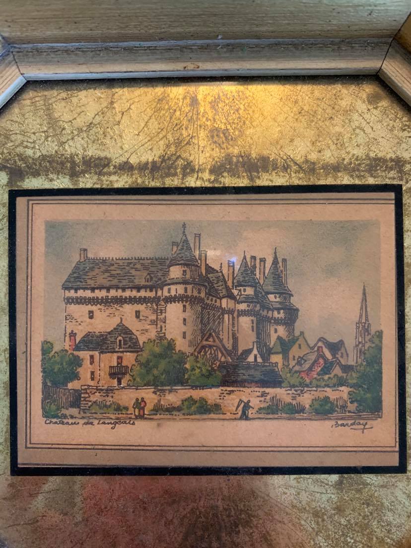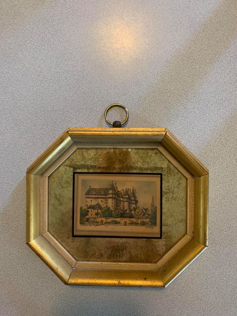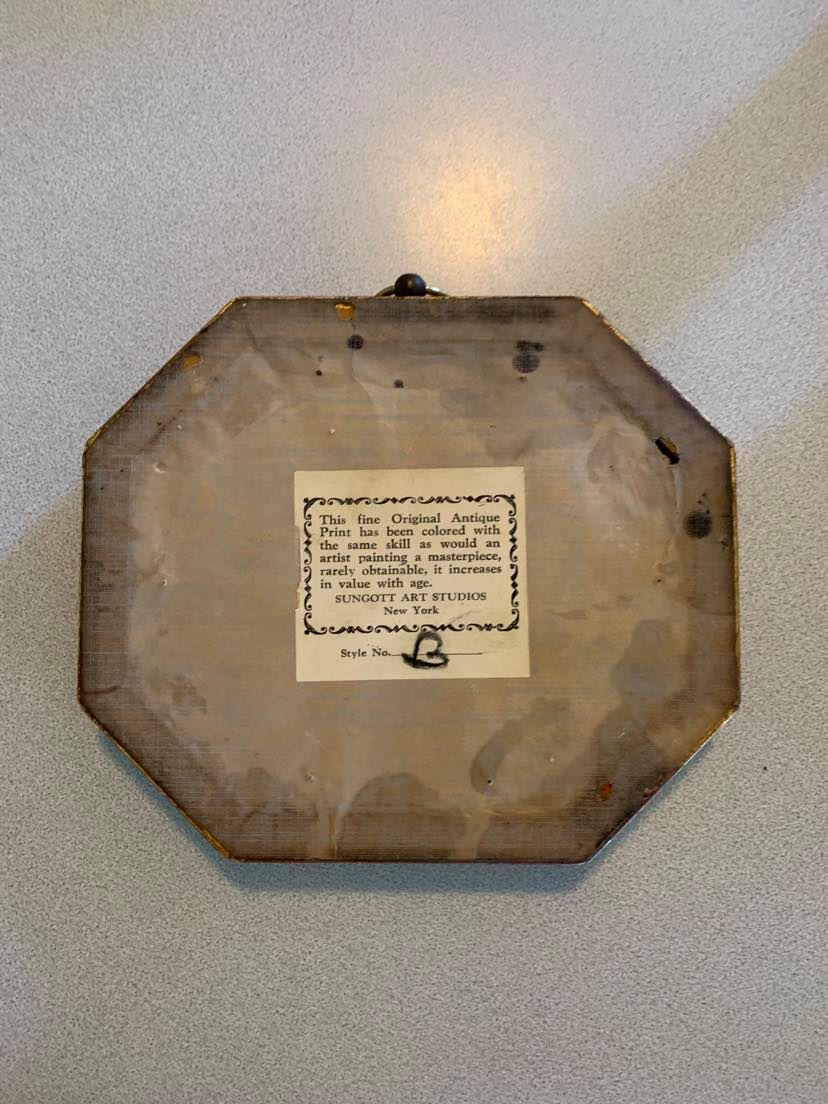 Octagon shaped, about 7 x 6 inches gold-color frame, hand-colored print, about 2 1/2 x 3 1/2 inches