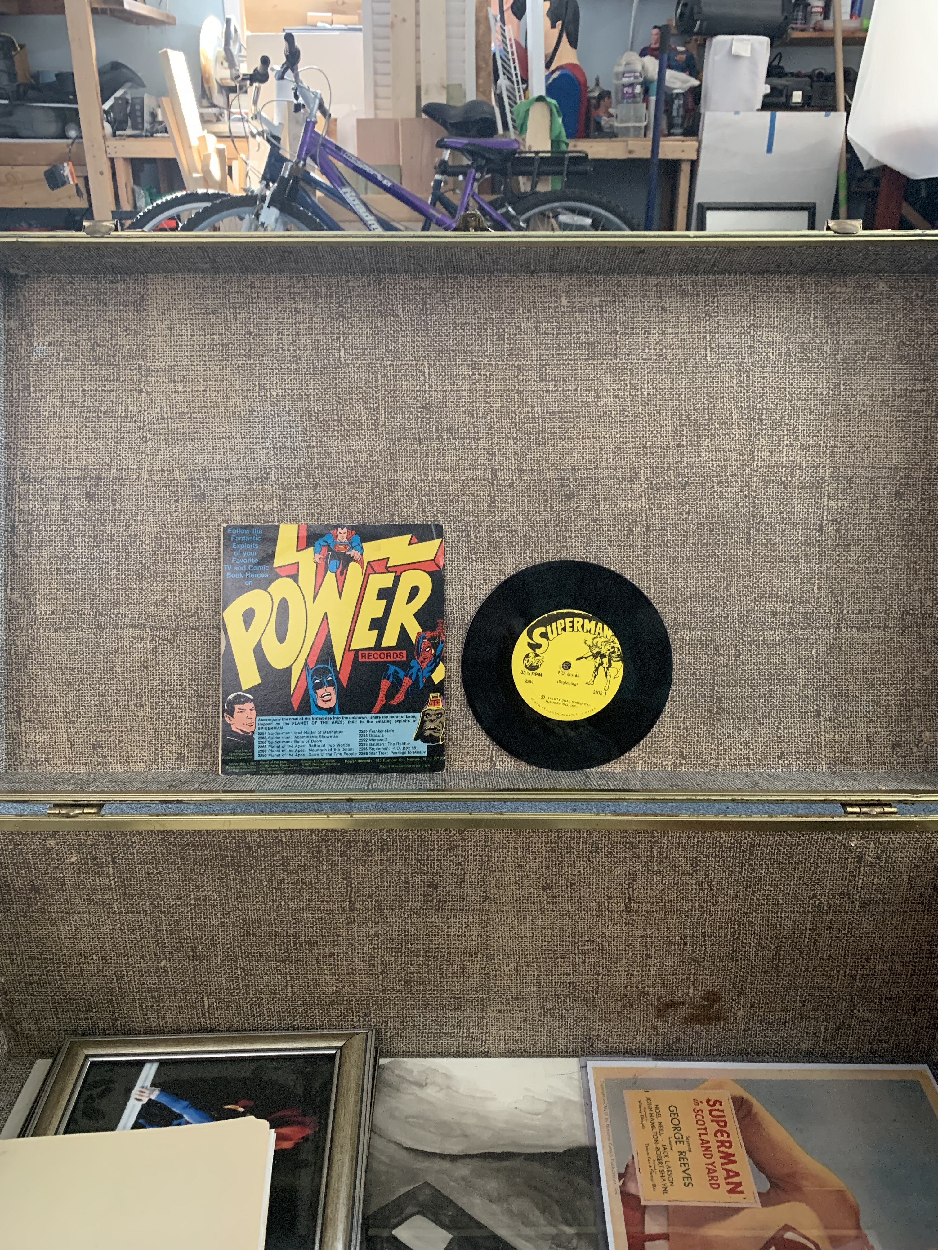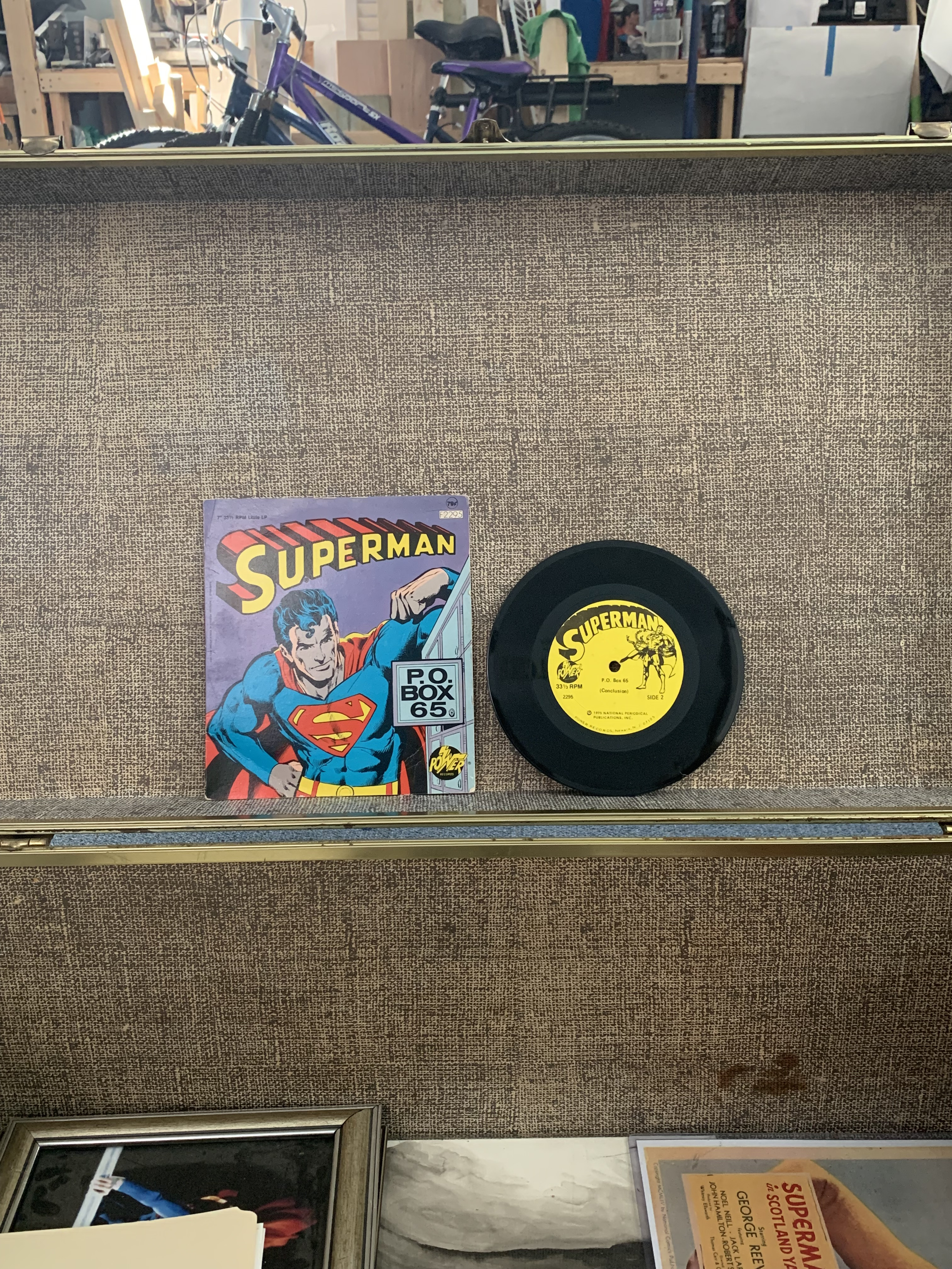 The items in the last four images appear to be Superman memorabilia, likely vintage or reproduction collectibles. Given the nature of the collection, these could include rare editions of comics, promotional materials, records, or signed photographs. Below is an assessment of their potential value.