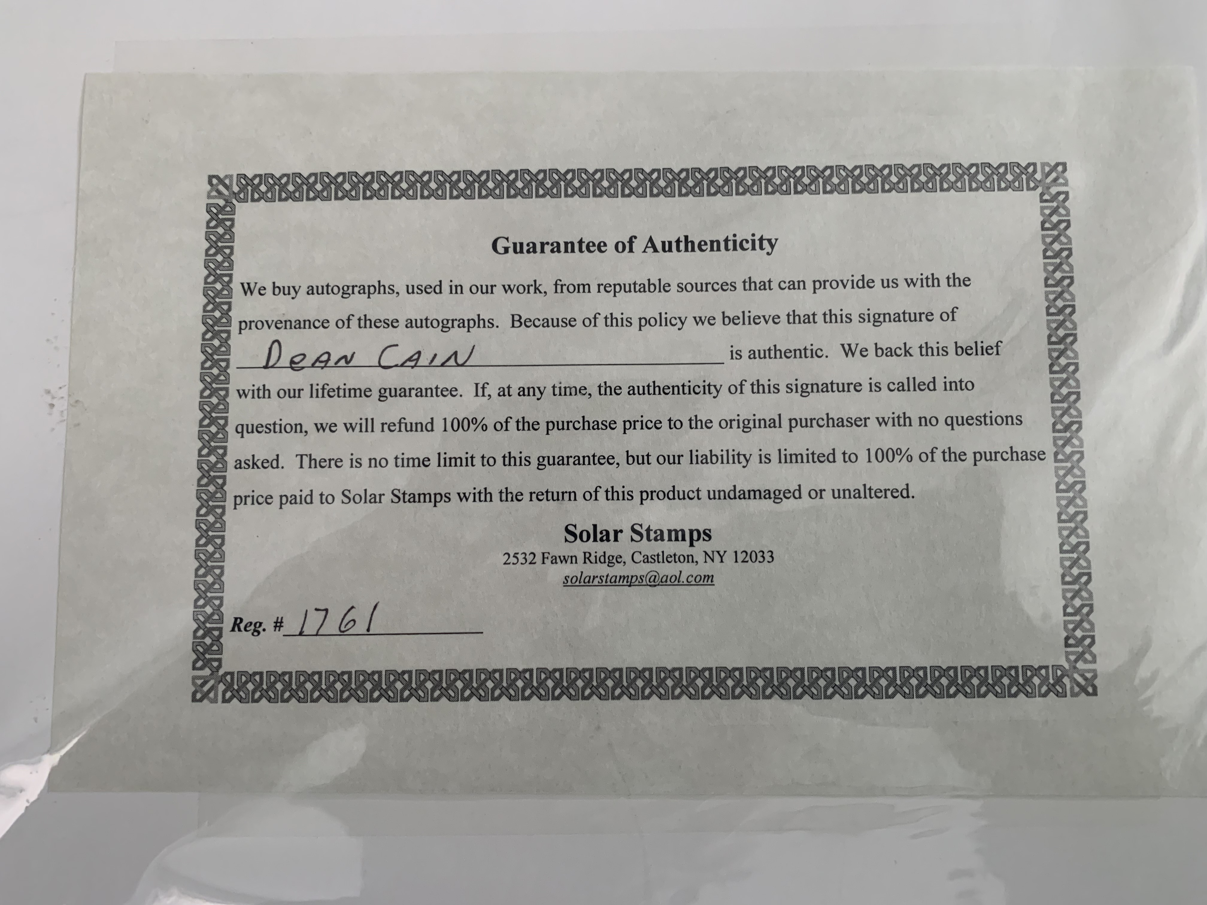 This item is a framed autograph of Dean Cain, who portrayed Superman/Clark Kent in the popular television series Lois & Clark: The New Adventures of Superman (1993-1997). The autograph is accompanied by a collage of images from the show and comes with a Certificate of Authenticity (COA) issued by Solar Stamps, an independent authentication company.