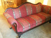 It has beautiful carved swans on each arm. Wooden legs have some veneer that has come off. Upholstery is in good condition. Solid wood slats make up the support for the seat.