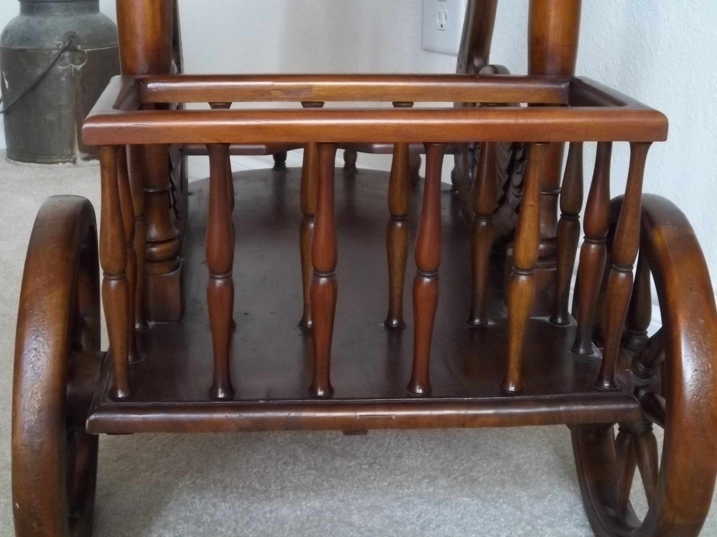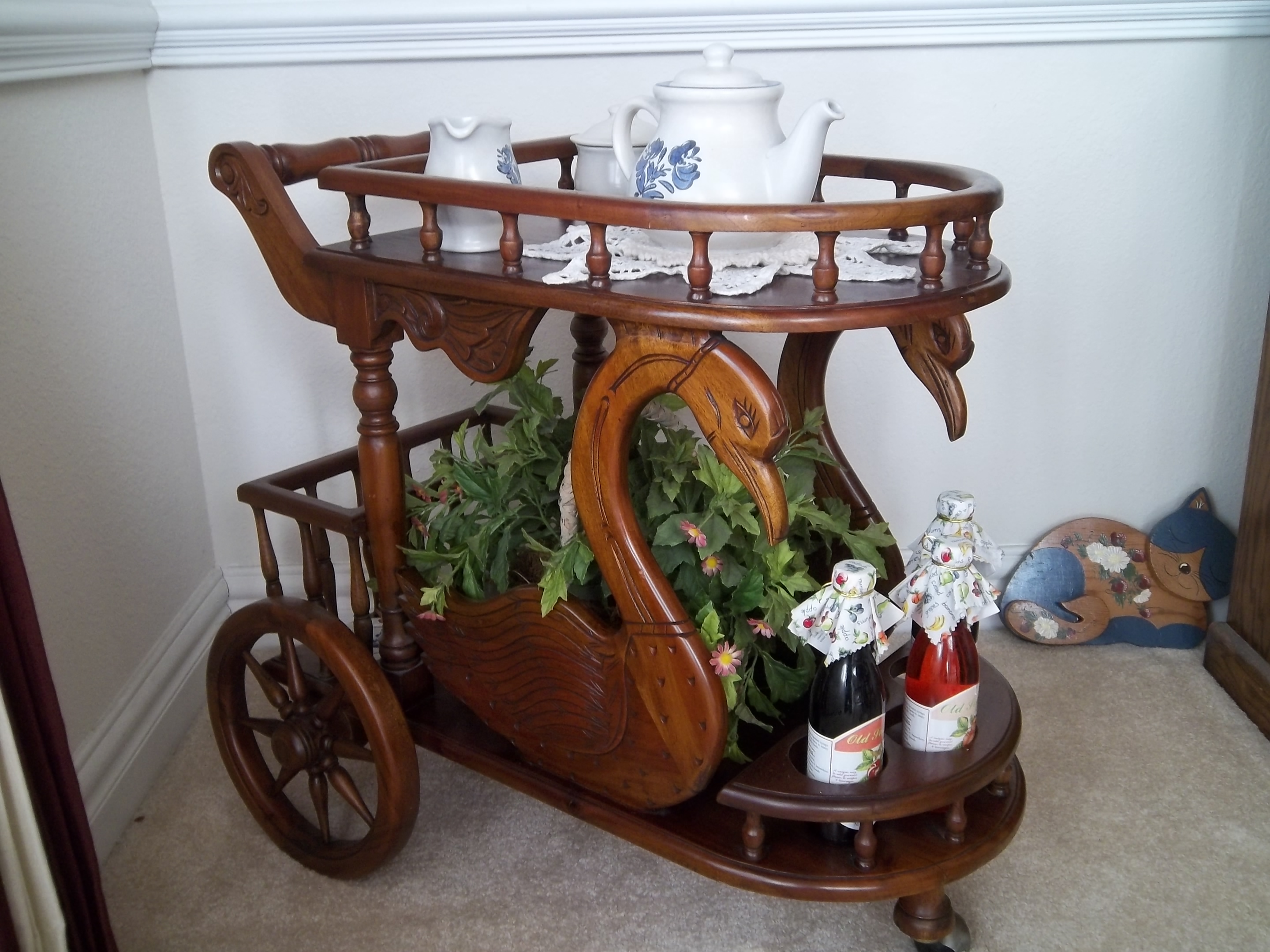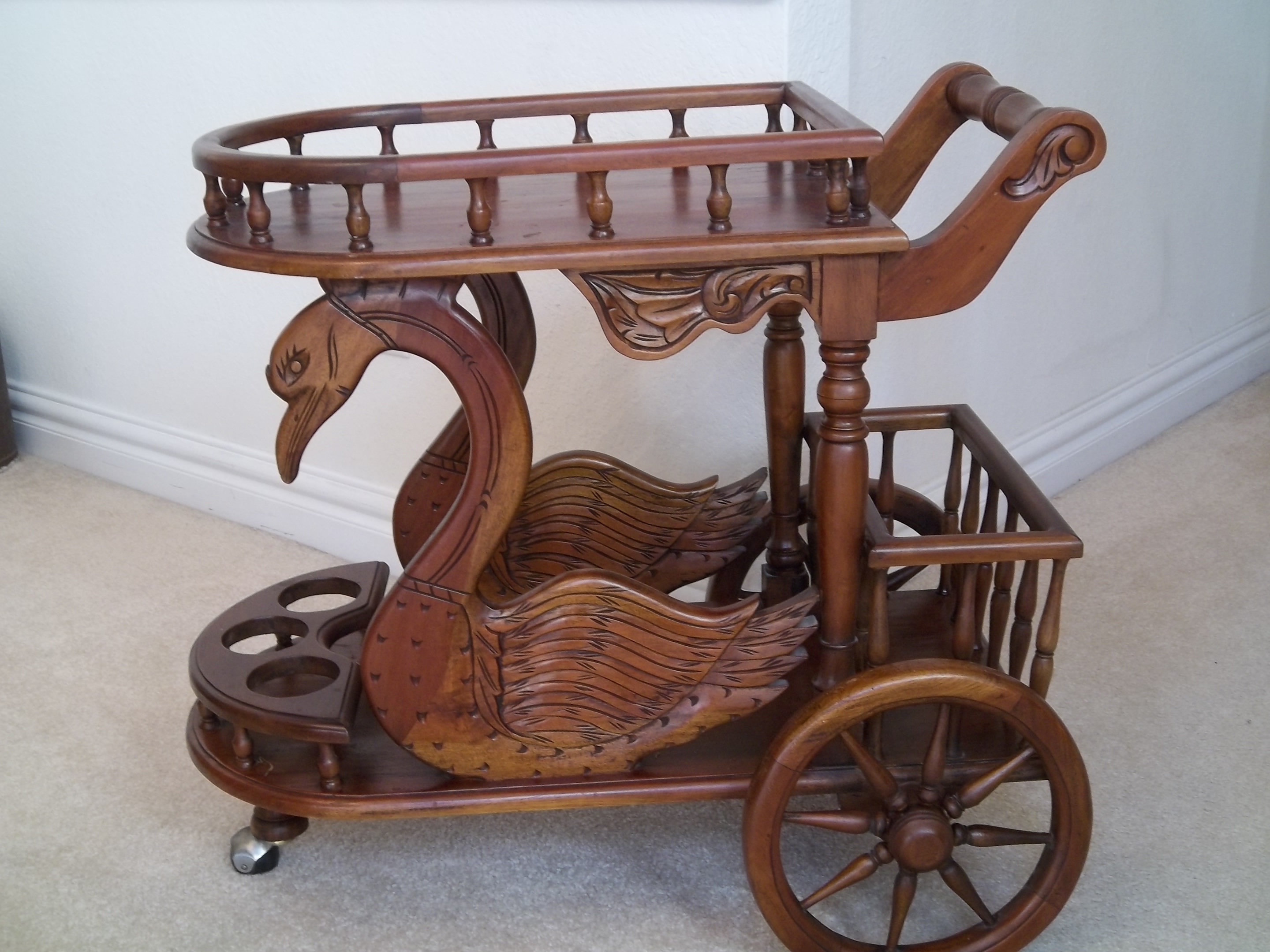 Beautiful wooden serving cart with detailed carvings of swans. Bought in Atlanta GA 15 years ago for $200.