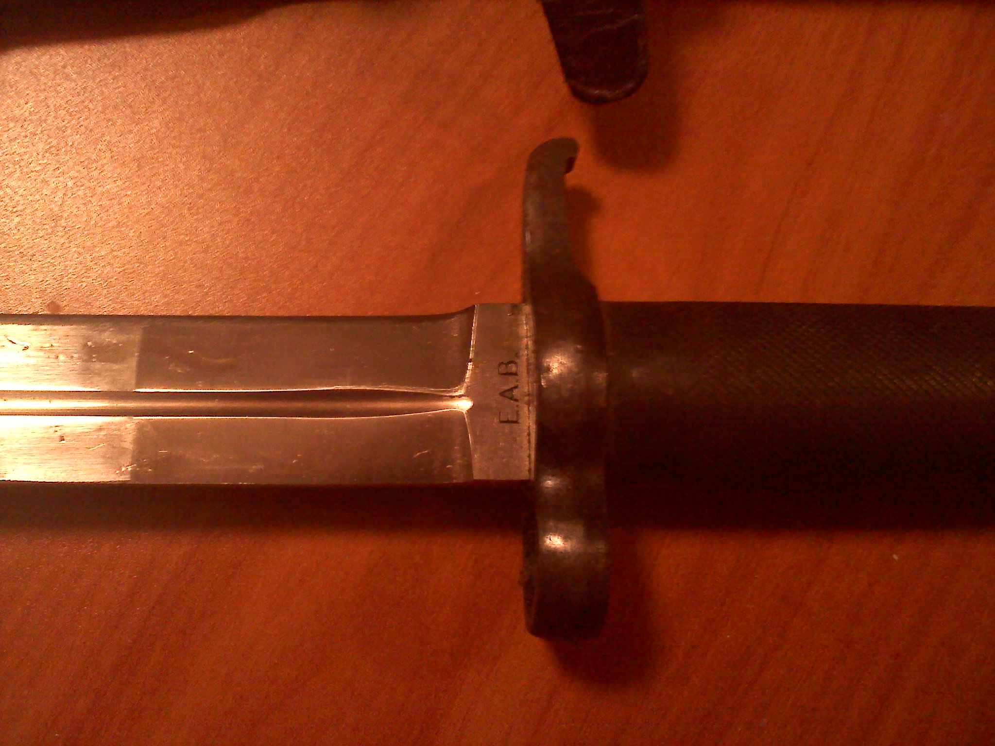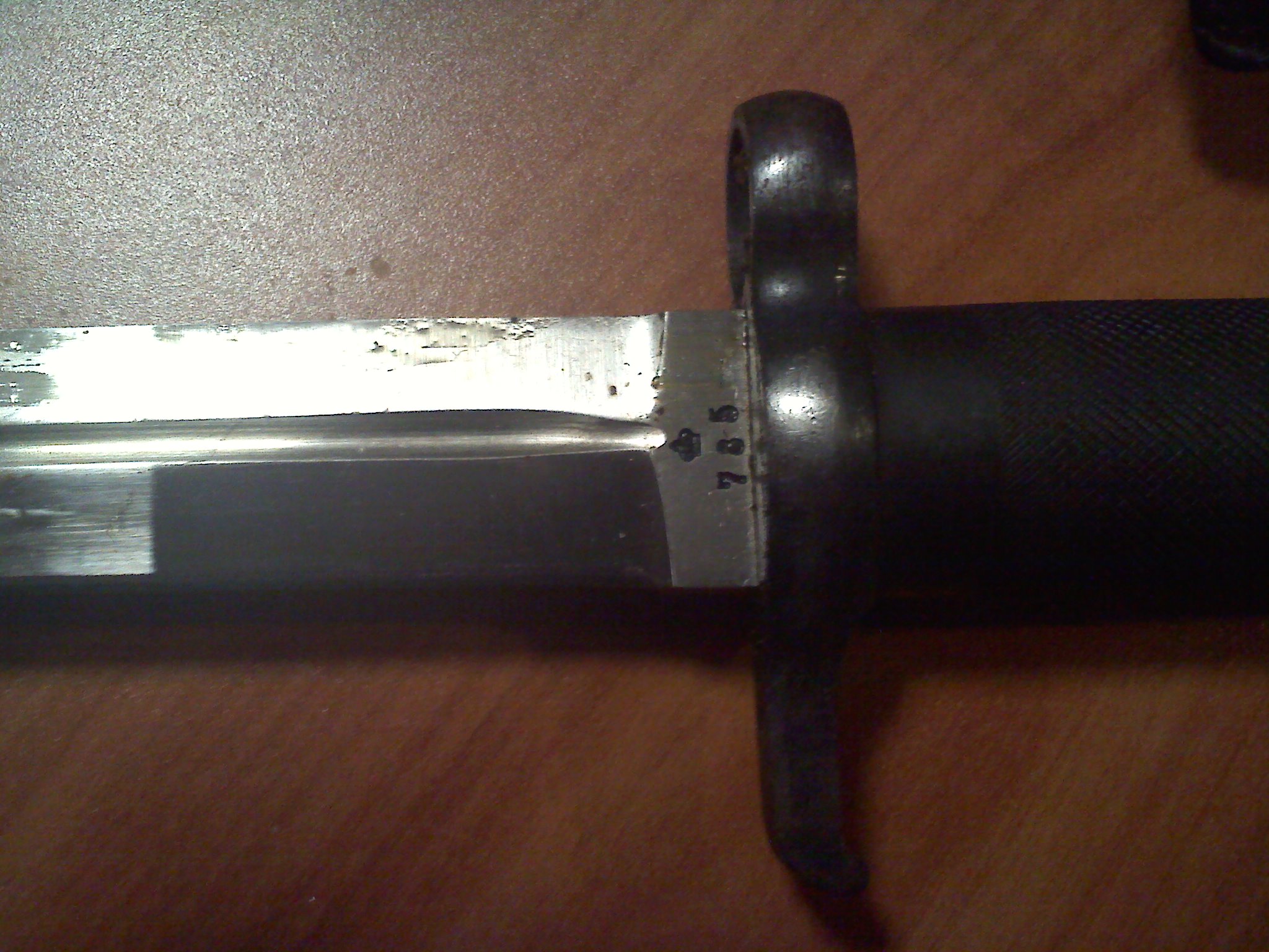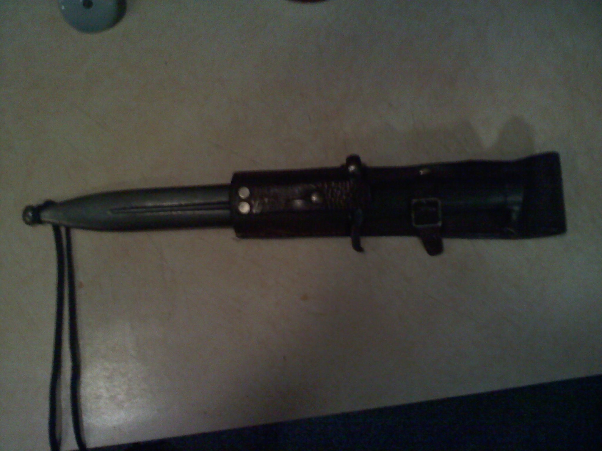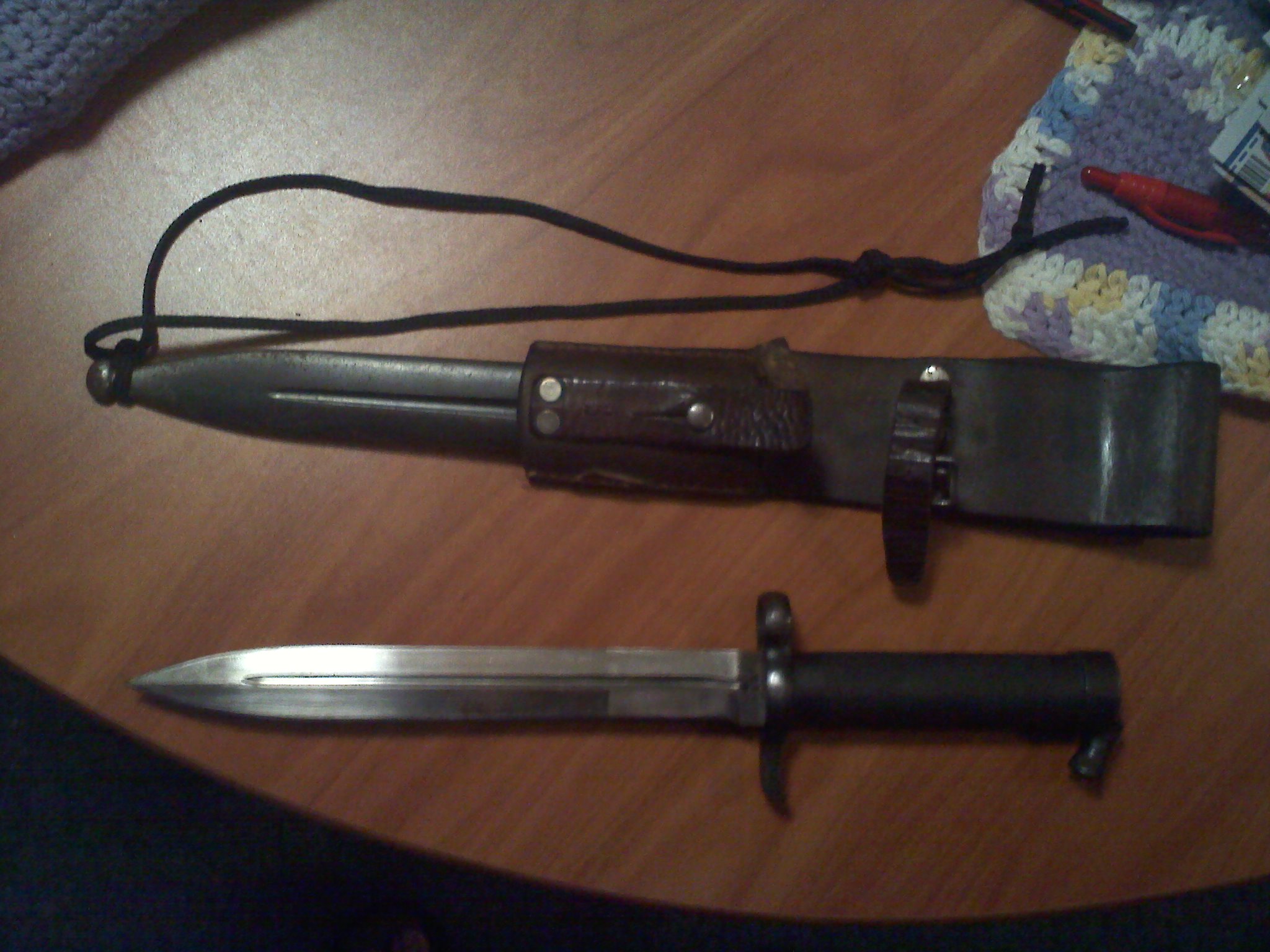 This is a Swedish 1896 bayonette with the modified frog for m/58 Ag42b. The blade has a few small stains, but is in very good shape. The spring on the retaining lock is strong and fully functional. The scabbard and nuckle guard show minor rust and pitting, with the majority of the rust on the back of the scabbard. I will consider selling, if the price is right.