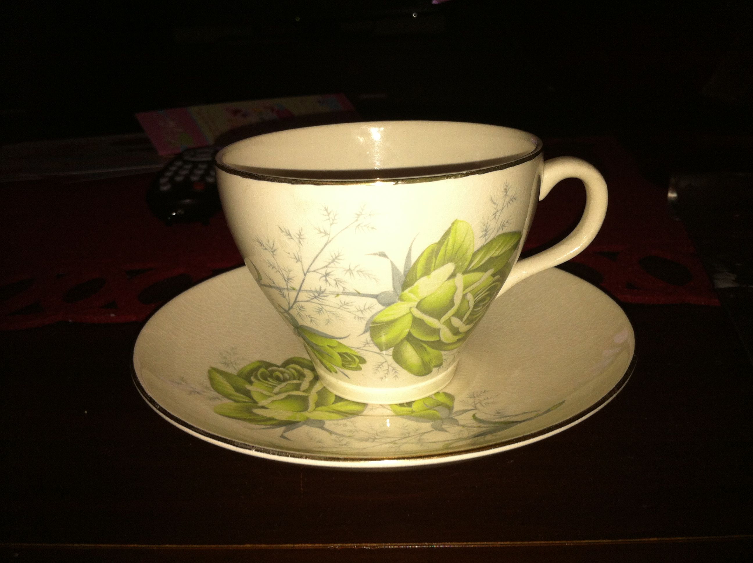 Teacup with saucer by Swinnertons Staffordshire. Cream with a light Green Rose and grey stem and leaved