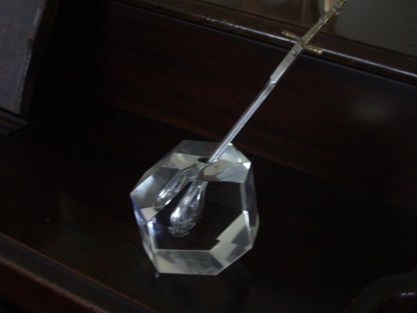 The crystal paper weight is in very good condition with only a few scratches on the bottom and a very small amount of wear on one of the seams on top.  The sword has wear up close to the top.