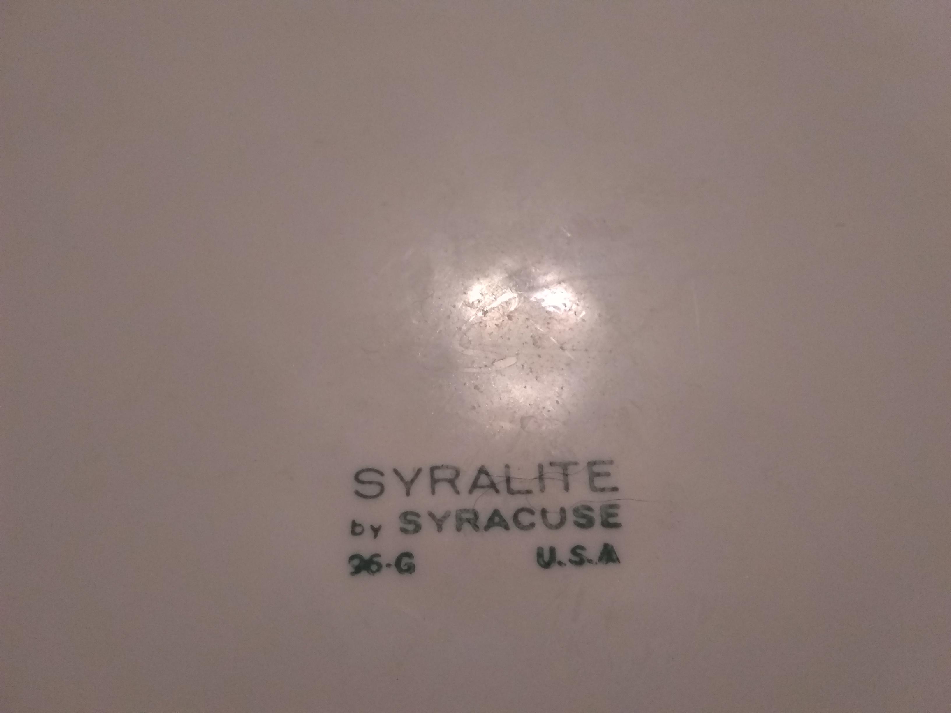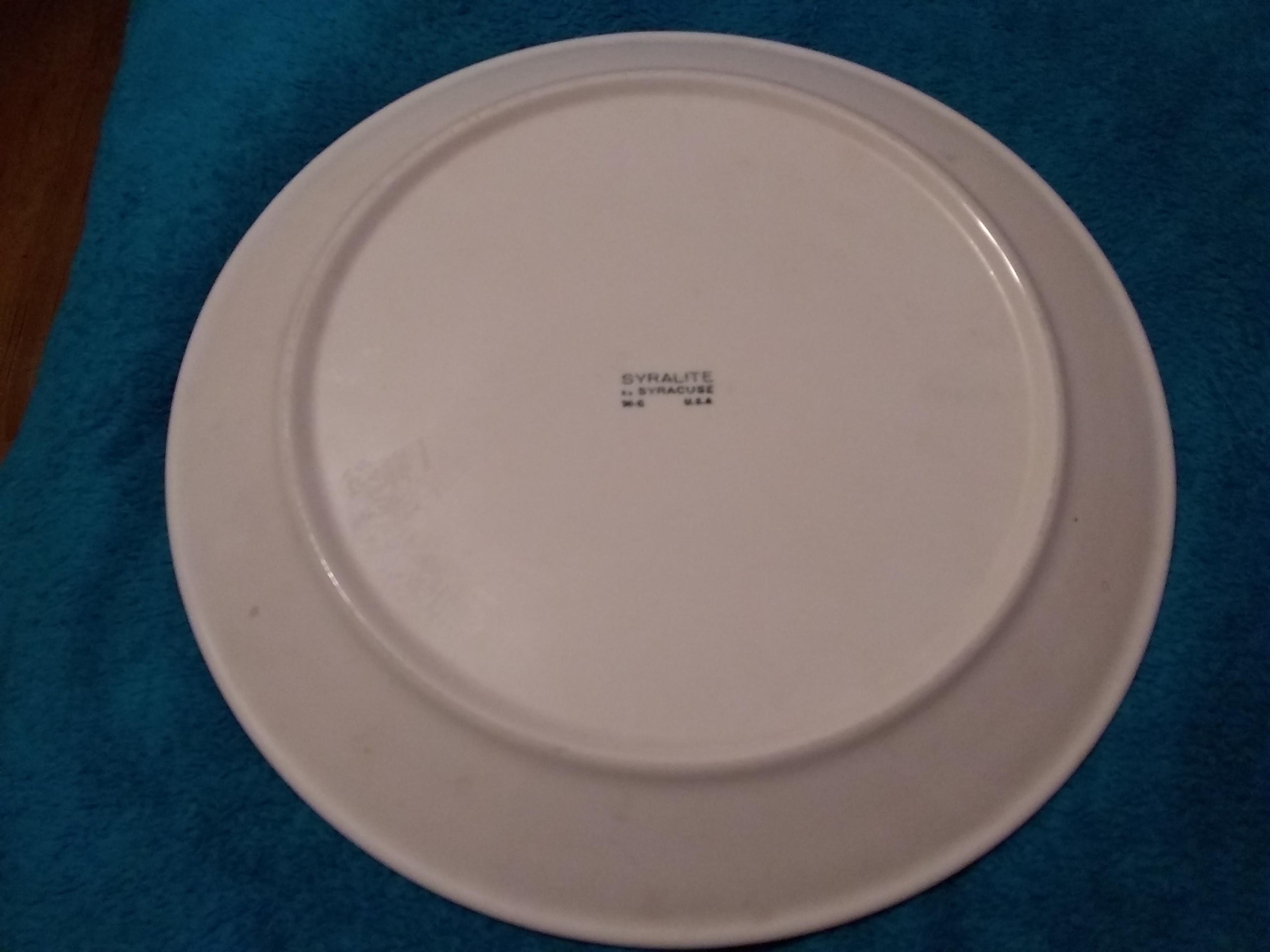 Syracue "Syralite" restaurant ware. The pattern is "Honeycomb" and the plates are 12-inches across. The backstamp is 96-G and looks stamped on; it is not in a circle or diamond.