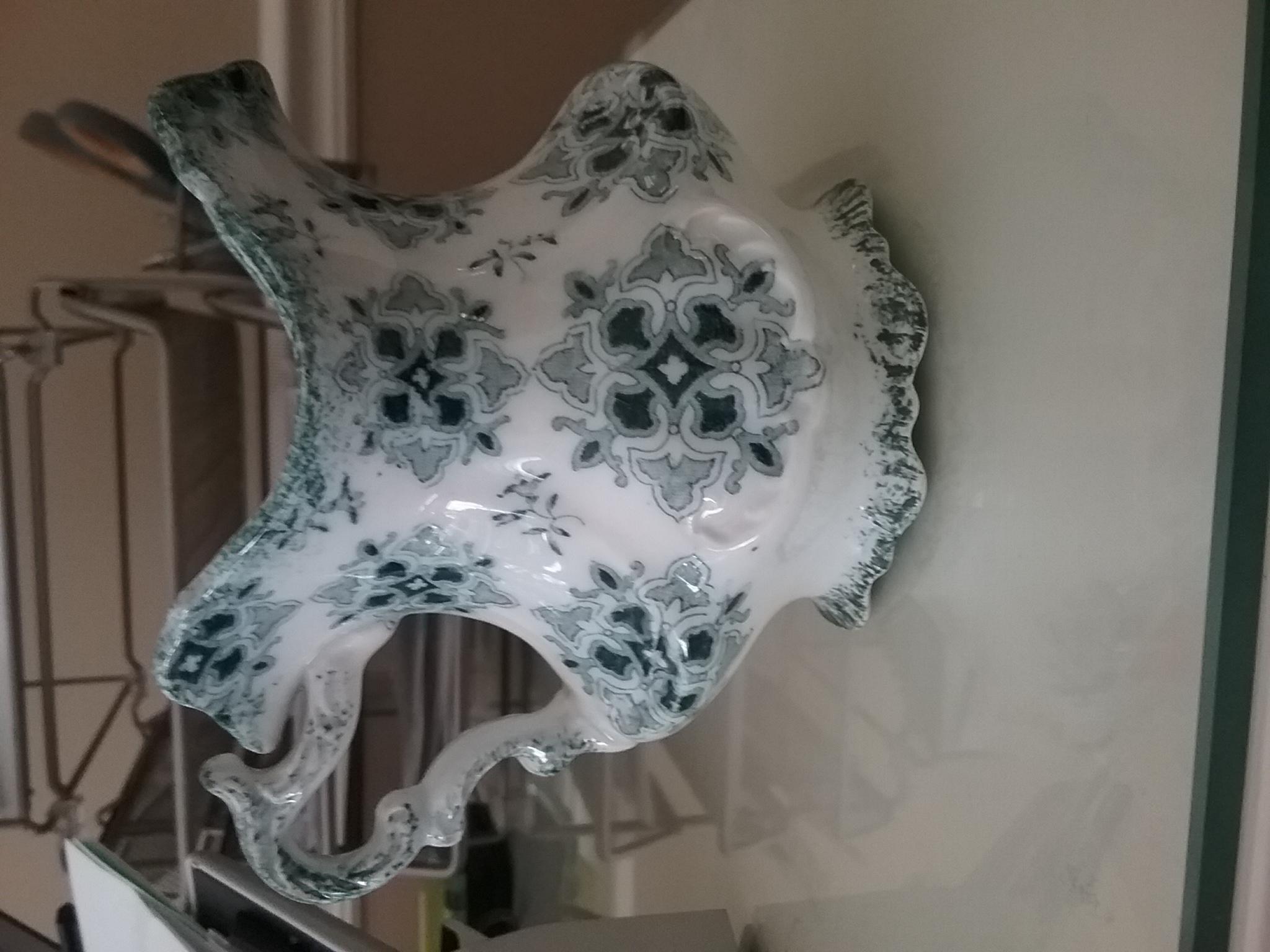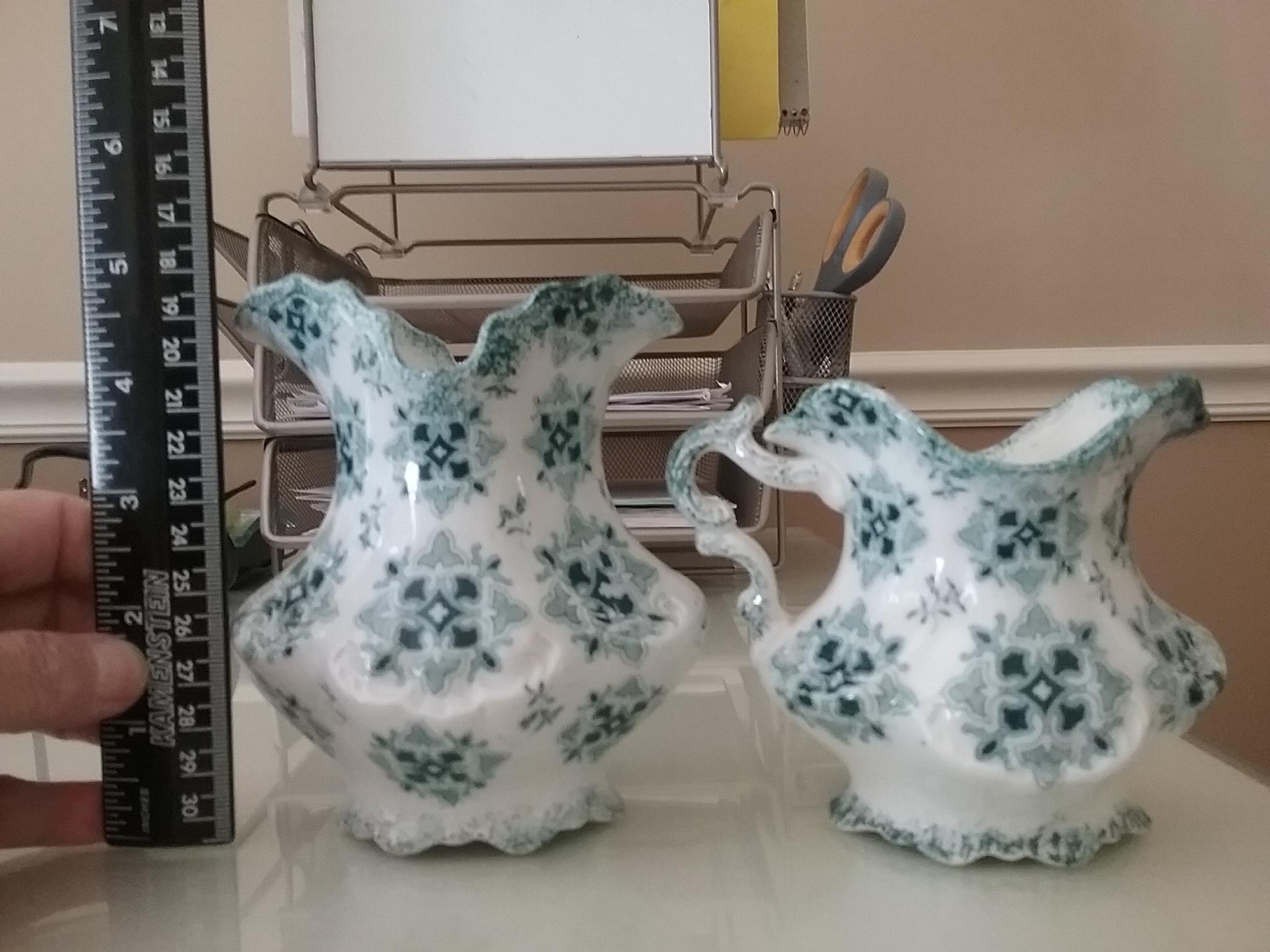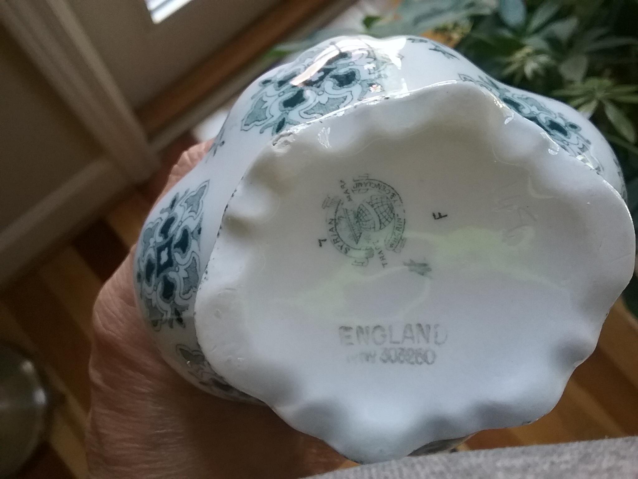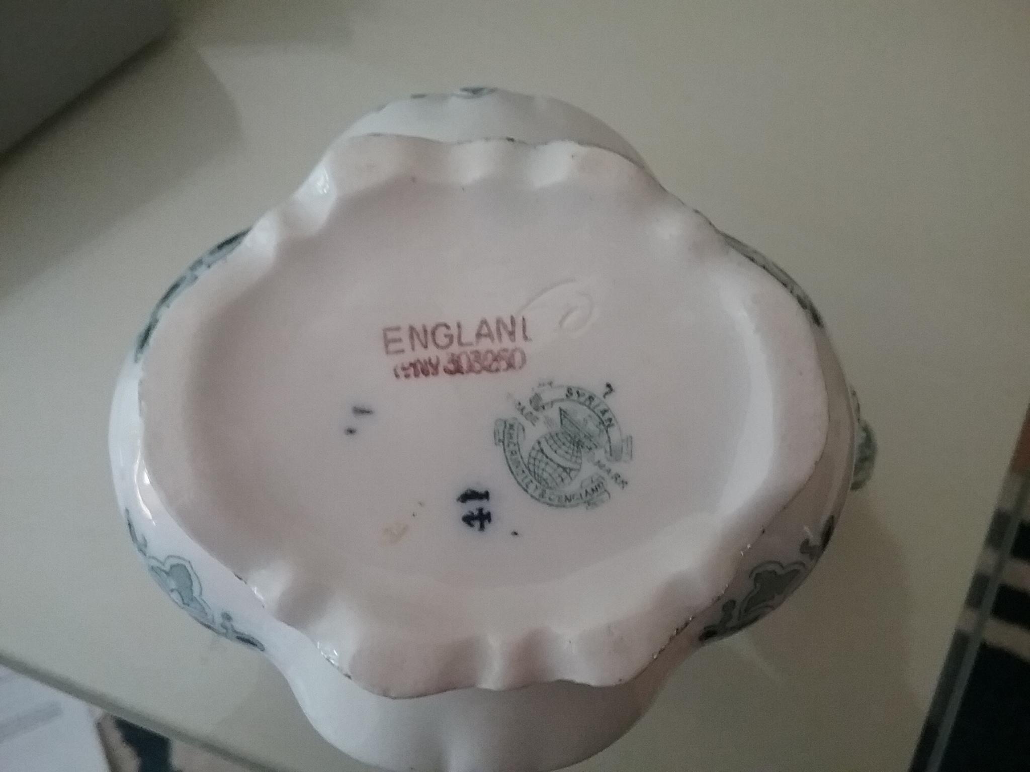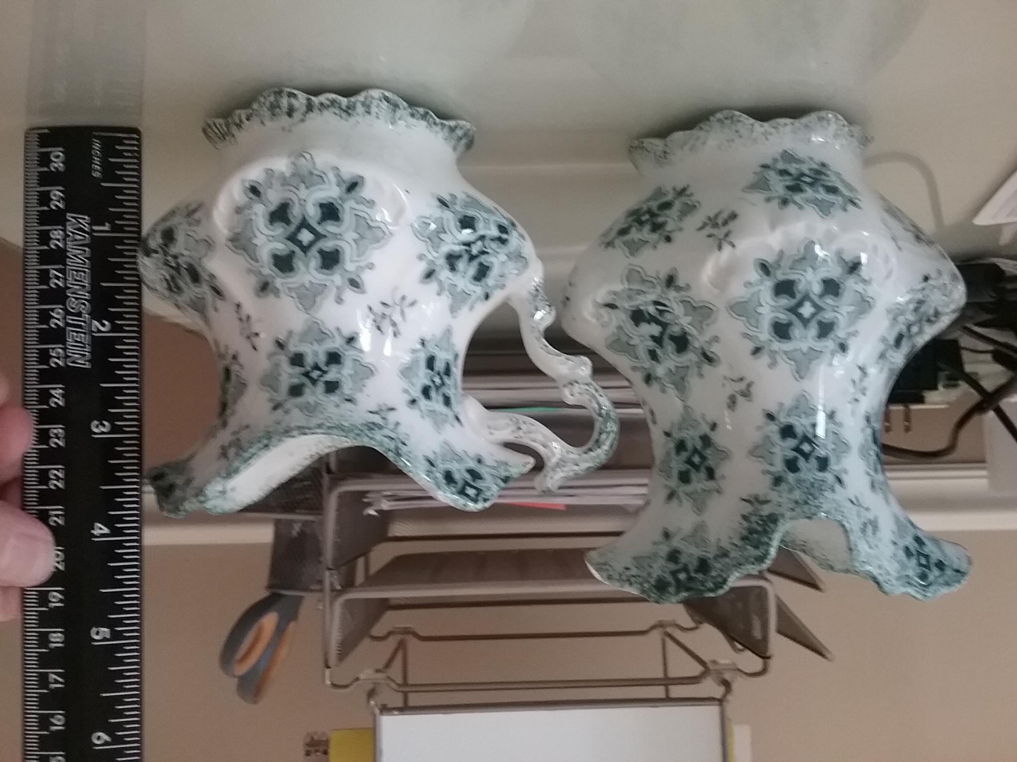 This is my first post! I am sorry to admit that I know little to nothing about the two pieces I am asking about. I bought them in a small antique shop in the late 90's simply because of the color and stlyle! I've always been a little curious because of stamping on the bottom. They seem to be stamped with every kind of stamp I've ever heard referred to. They appear to be either Porcelain or Ceramic, but I'm no expert and can't really tell. I have alway's figured they were either part of a mass produced dinnerware pattern or mass produced tourist souvenir set.
