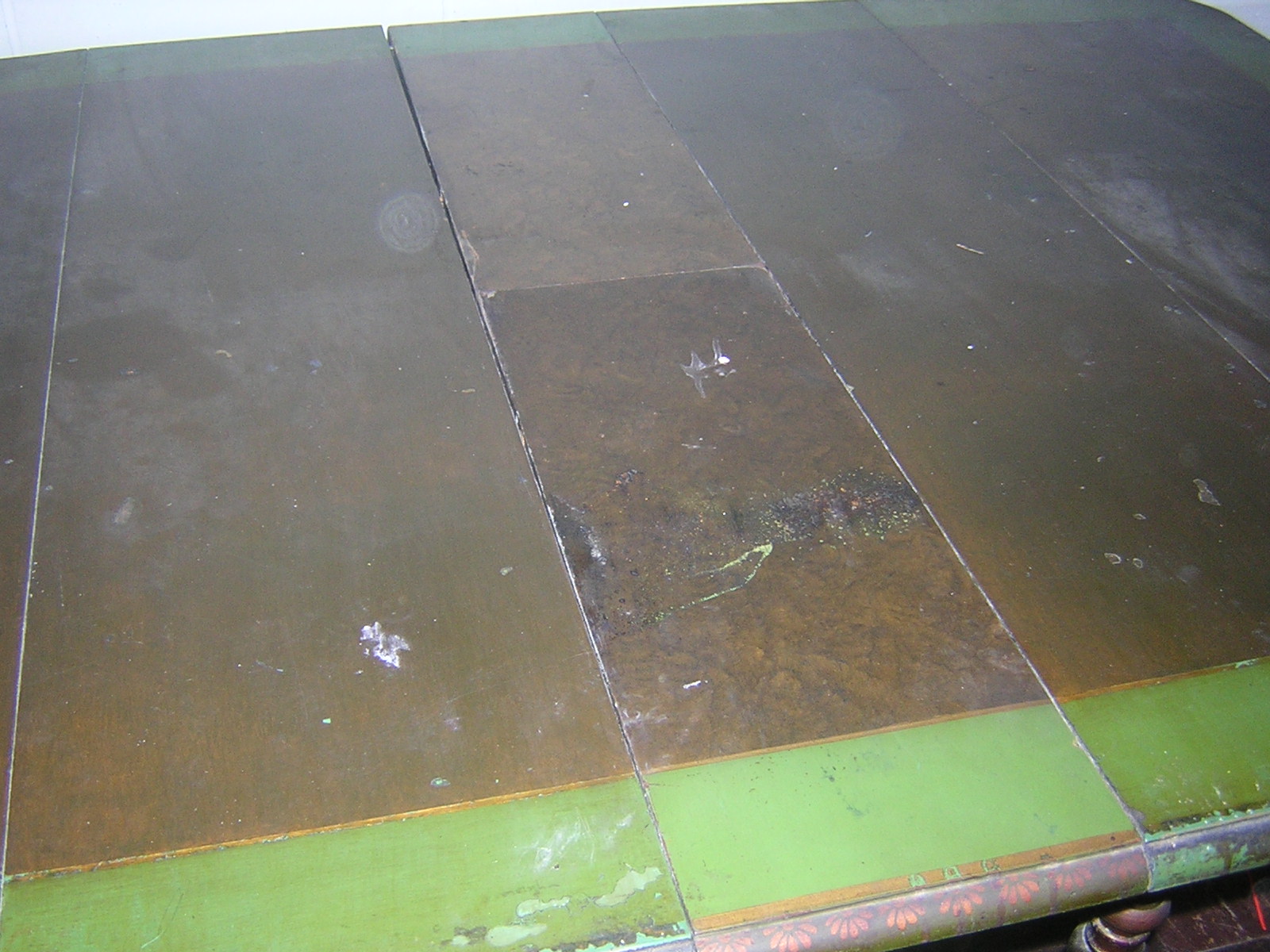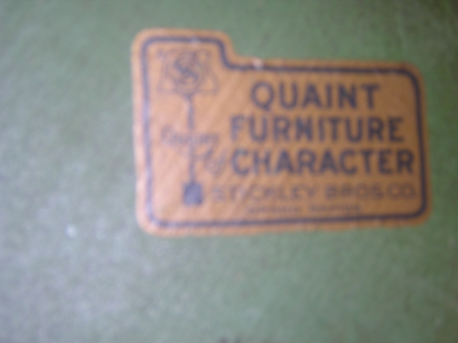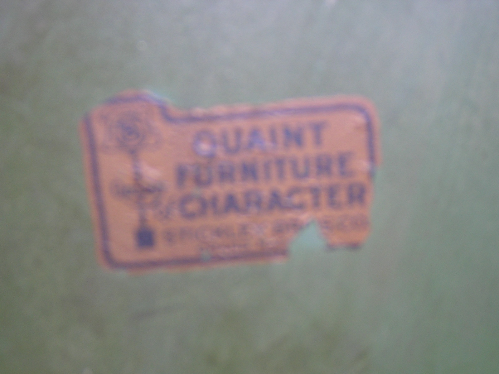 The table has two leaves that have some water damage. Besides the leaves the table top is in fair condition with normal  wear of years on the paint. The table looks like someone may have painted over it once before.Three of the chairs are in decent condition but one of the smaller chairs has a crack in the seat and the back needs to be reset. I may be interested in restoring the furniture depending on the value. Two of the chiars have the sticker. One of the smaller ones and a captain chair. I can not find one on the table but they have always been a set passed down in the family.