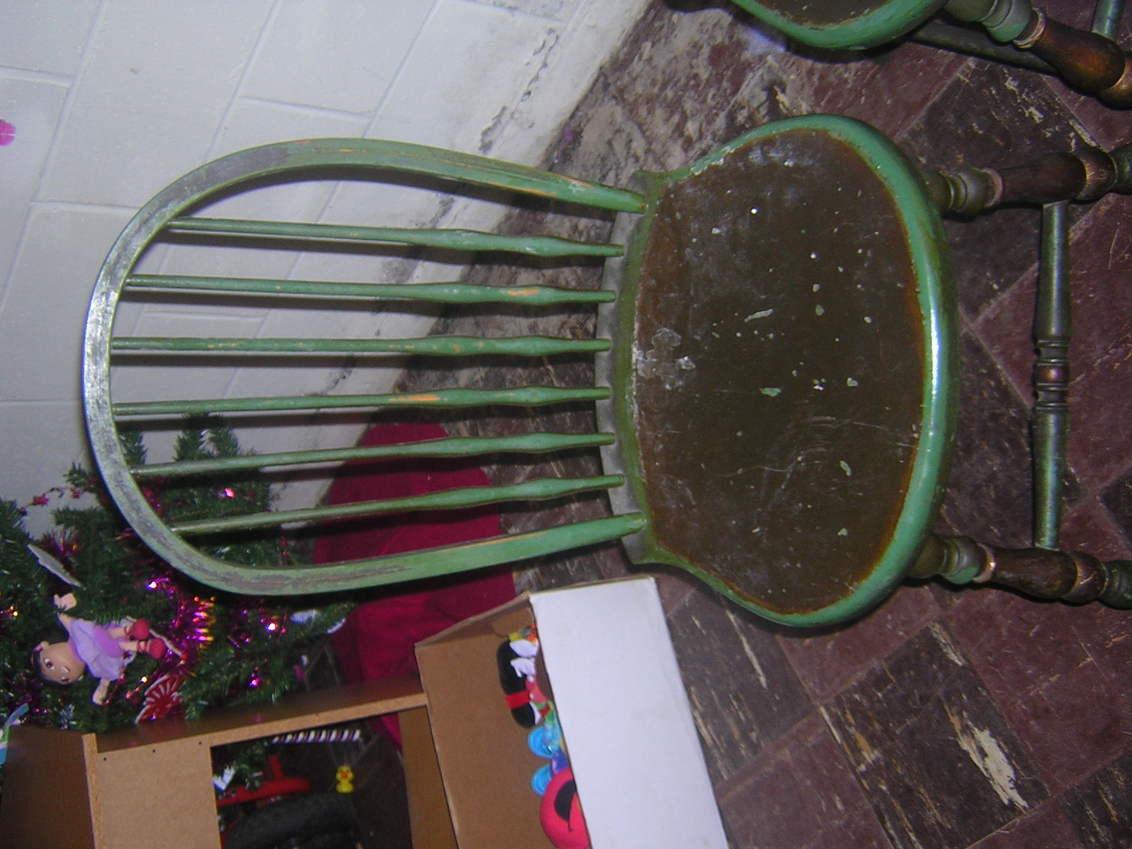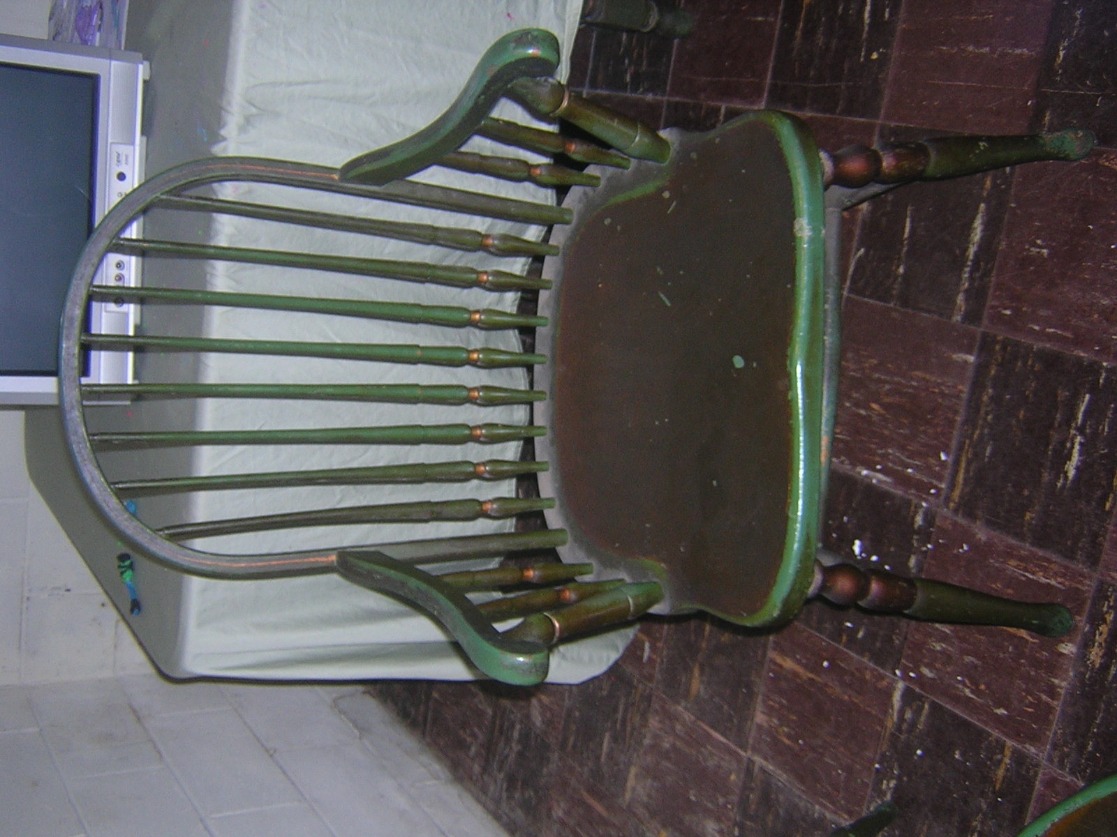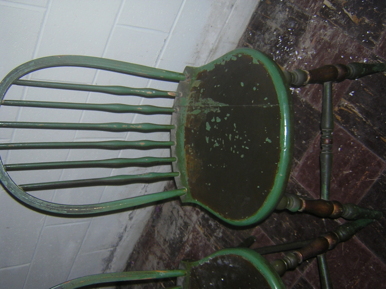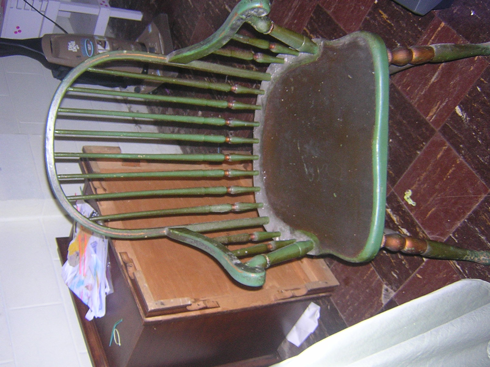 The table has two leaves that have some water damage. Besides the leaves the table top is in fair condition with normal  wear of years on the paint. The table looks like someone may have painted over it once before.Three of the chairs are in decent condition but one of the smaller chairs has a crack in the seat and the back needs to be reset. I may be interested in restoring the furniture depending on the value. Two of the chiars have the sticker. One of the smaller ones and a captain chair. I can not find one on the table but they have always been a set passed down in the family.