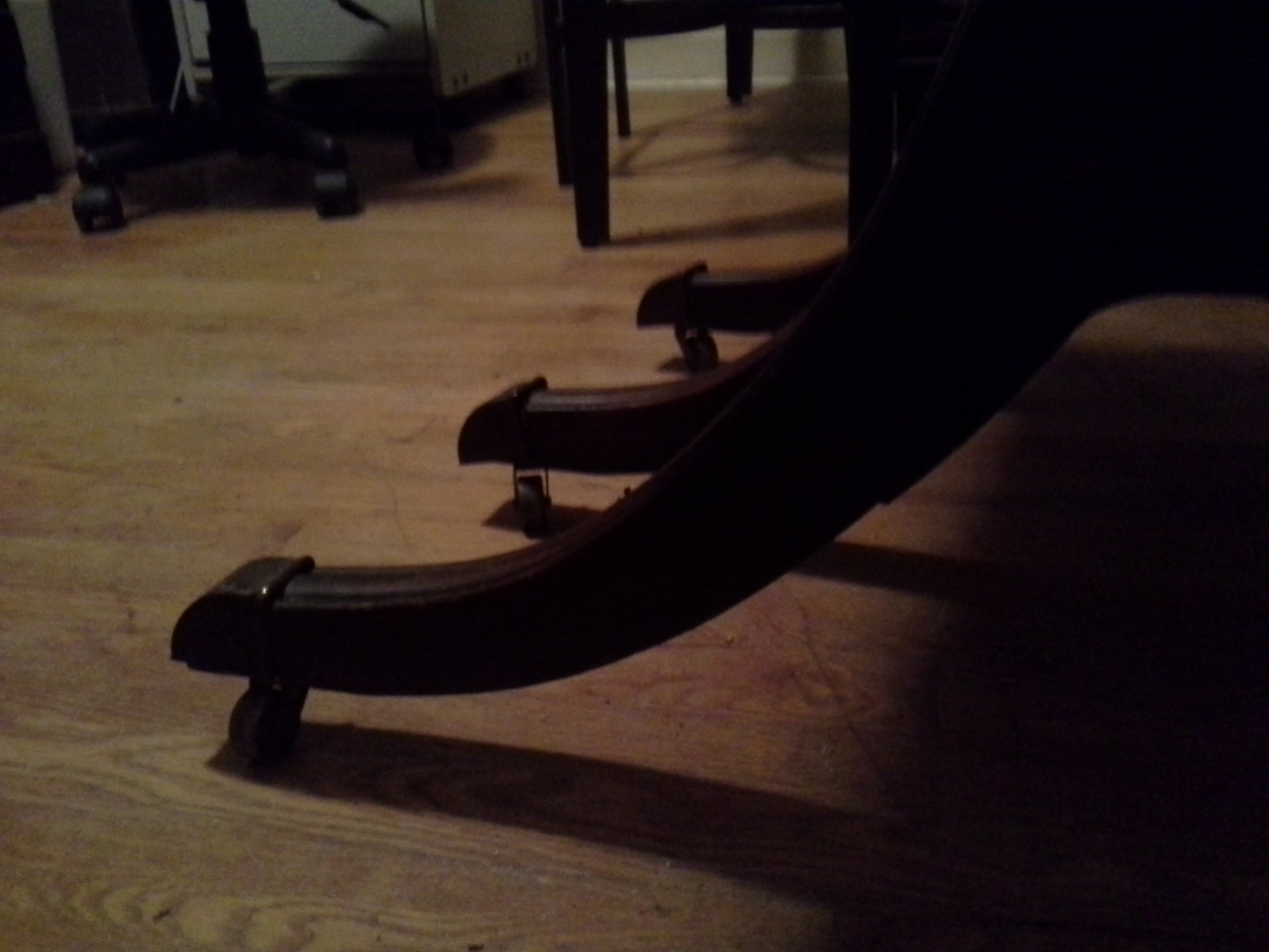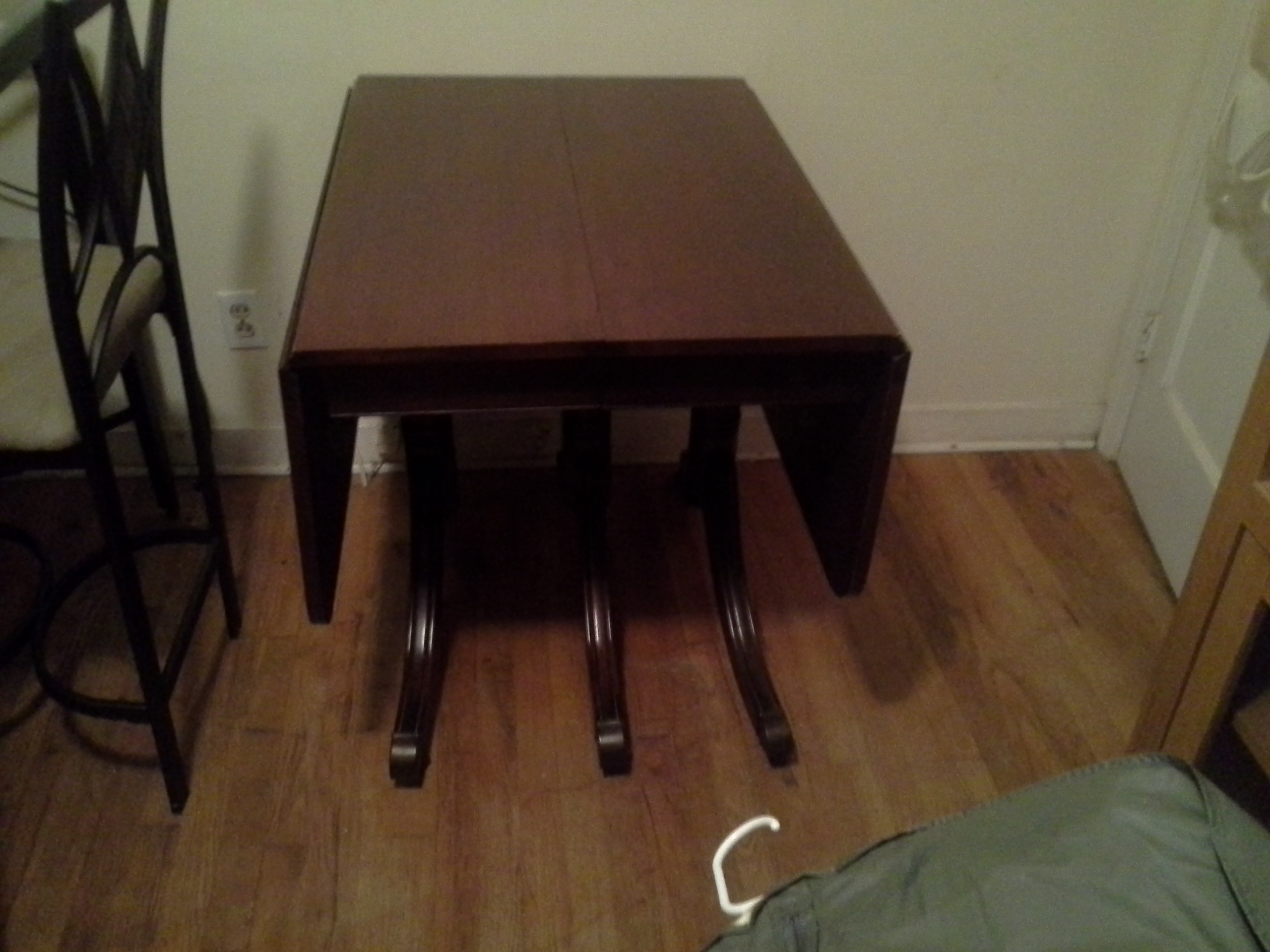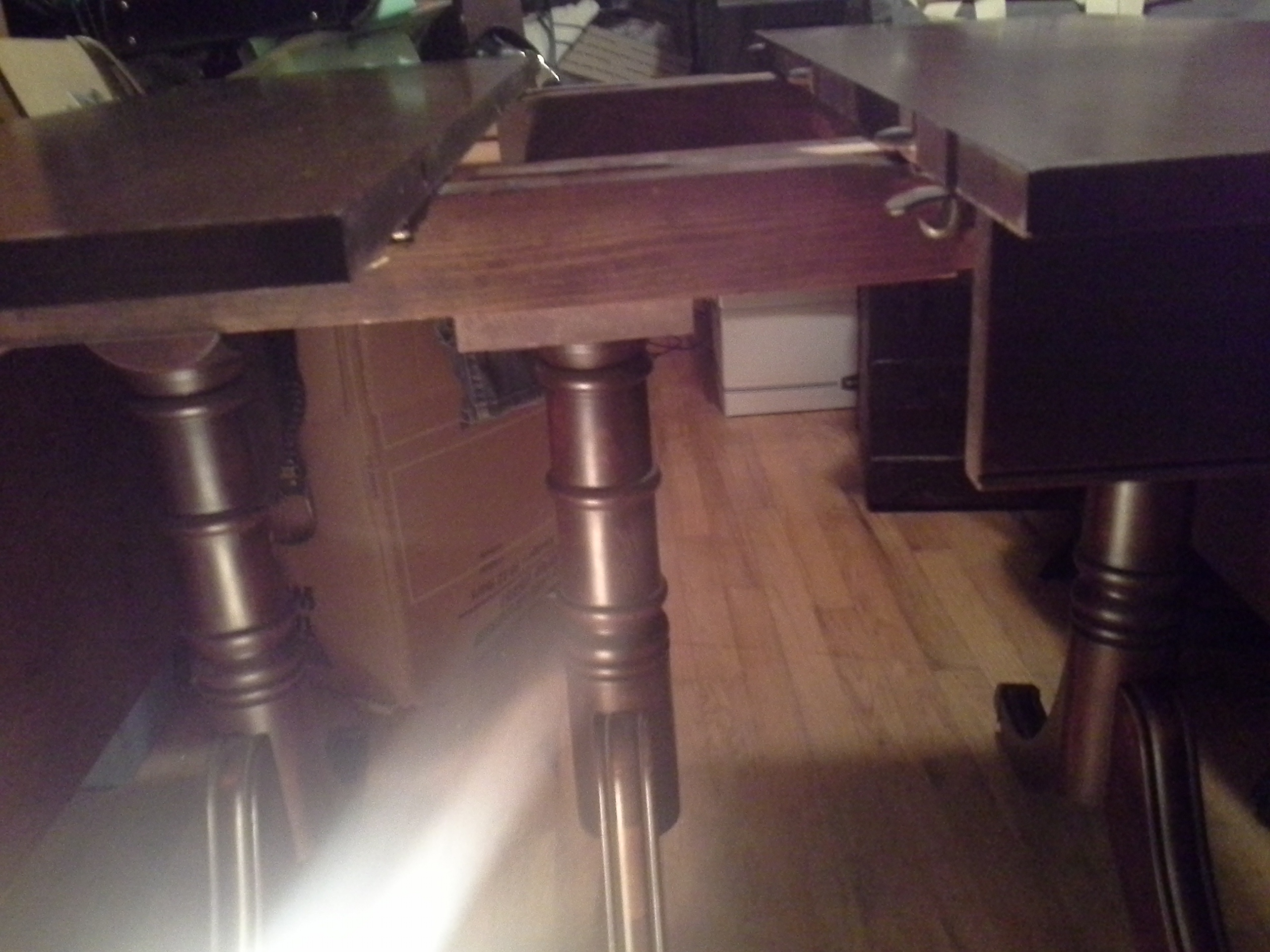 I picked up this table at a second hand shop. I recently moved into a smaller place so I must sell a few pieces of furniture. This is something I wanted to have "fixed up" and get some nice chairs to go with it. Time and money hasnt allowed for me to this. So I starting trying to figure out who the maker of this table is. There are no markings on the table, so started looking through pictures to narrow it down. The table came with two leaves, I saw a picture of a similiar table with three leaves?? There is a crack in one of the legs not all the way through, still very sturdy. Also one of the two small side boards is off. Also does have some scratching mostly on one of the leaves. But overall in good antique condition. I tried my best with the pictures, they would have come out better if taken during the day. If anyone has any information I would be very thankful........Second time Im posting this, no responses. This is my first time using this site, I would really appreciate someone who knows about furniture to give me information on this table. Thanks