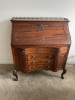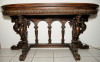 The table is small in size. It has two different sizes when the leafs are pulled up . It has a crossed wood pedistal. It is in very good shape.