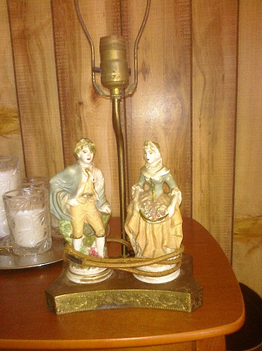 Old lamp on a brass colored base.  It is of a young man and young woman dressed in the  1700's dress.  He is sitting on a tree stump and she is holding a basket of roses.  It still has the orginal wiring of of 2 separate wires wrapped in fabric braid.