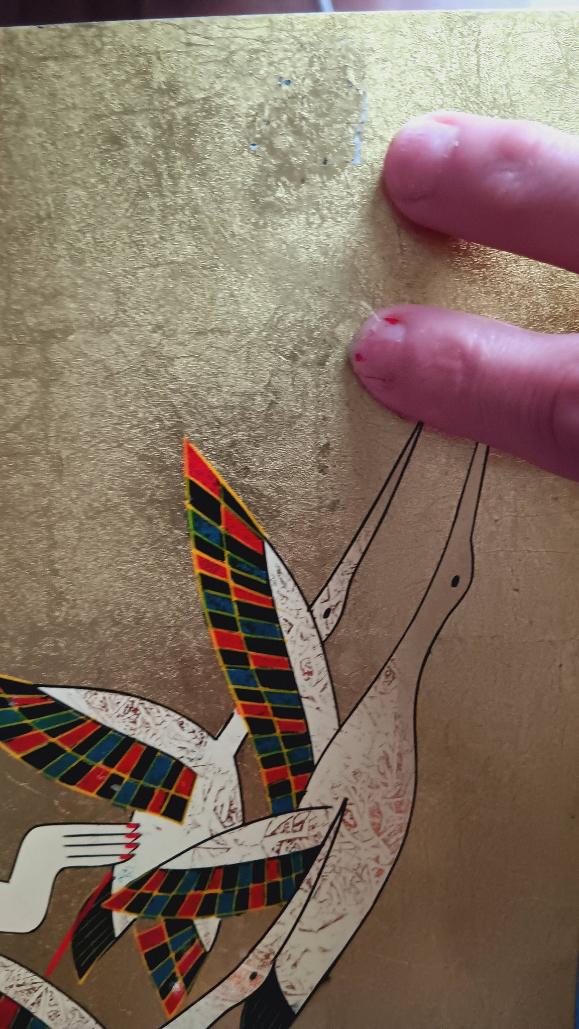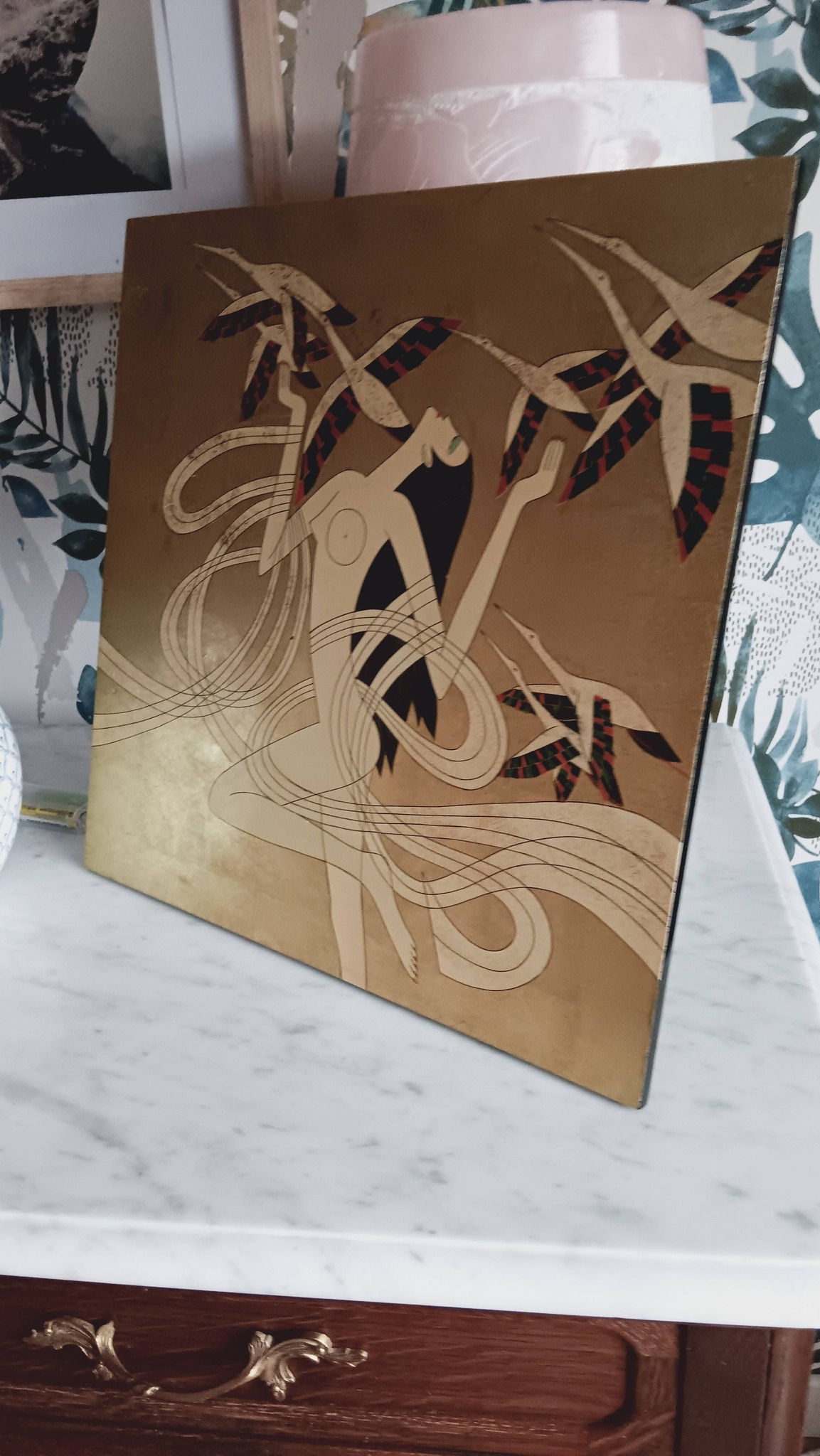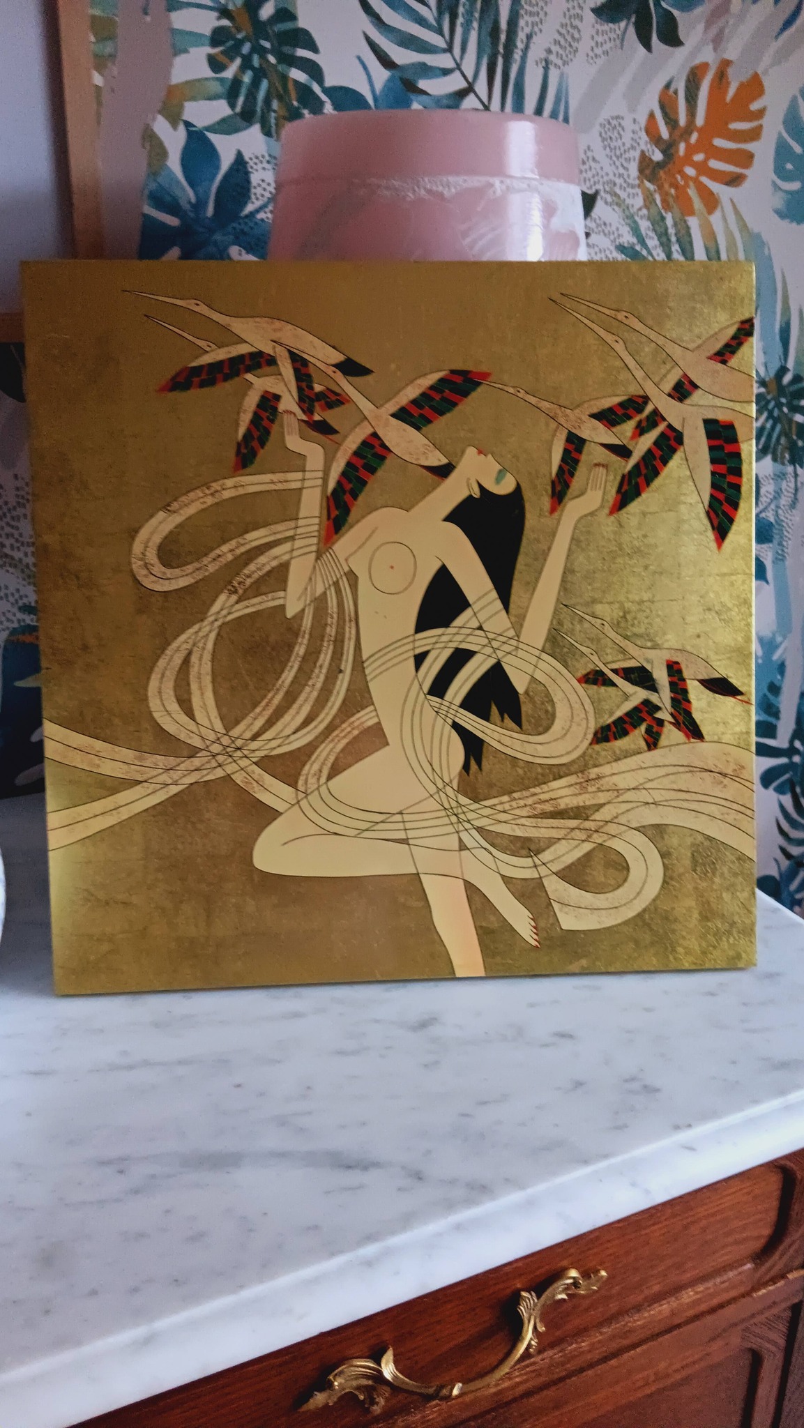 Physical Description: This piece is a tableau featuring a nude woman surrounded by herons, set against a gold leaf background. The artwork is characterized by its Art Deco or Art Nouveau style, with flowing lines and vibrant colors. The dimensions are approximately 40 cm x 40 cm. The medium appears to be a combination of paint and gold leaf, giving it a striking visual appeal.