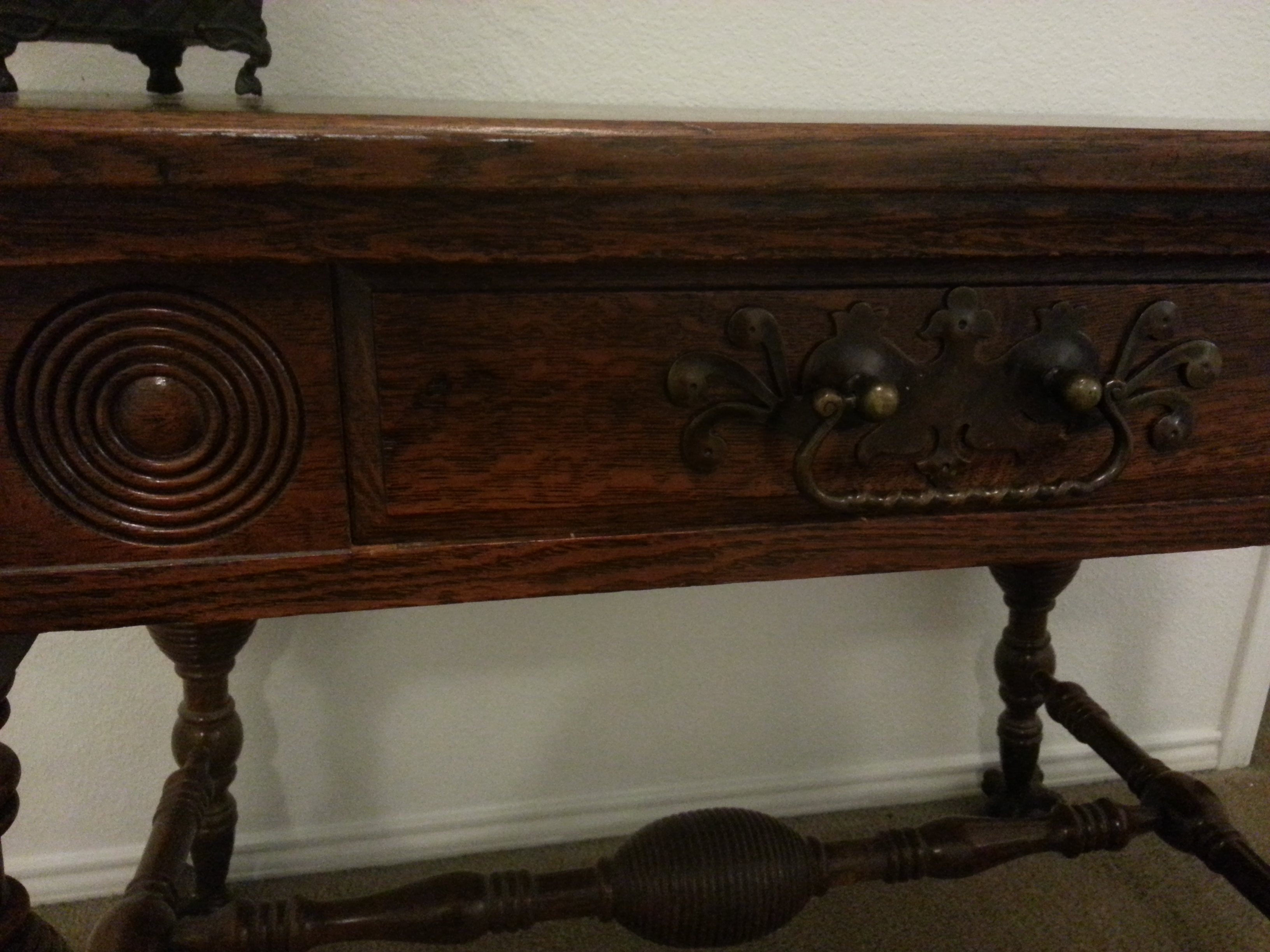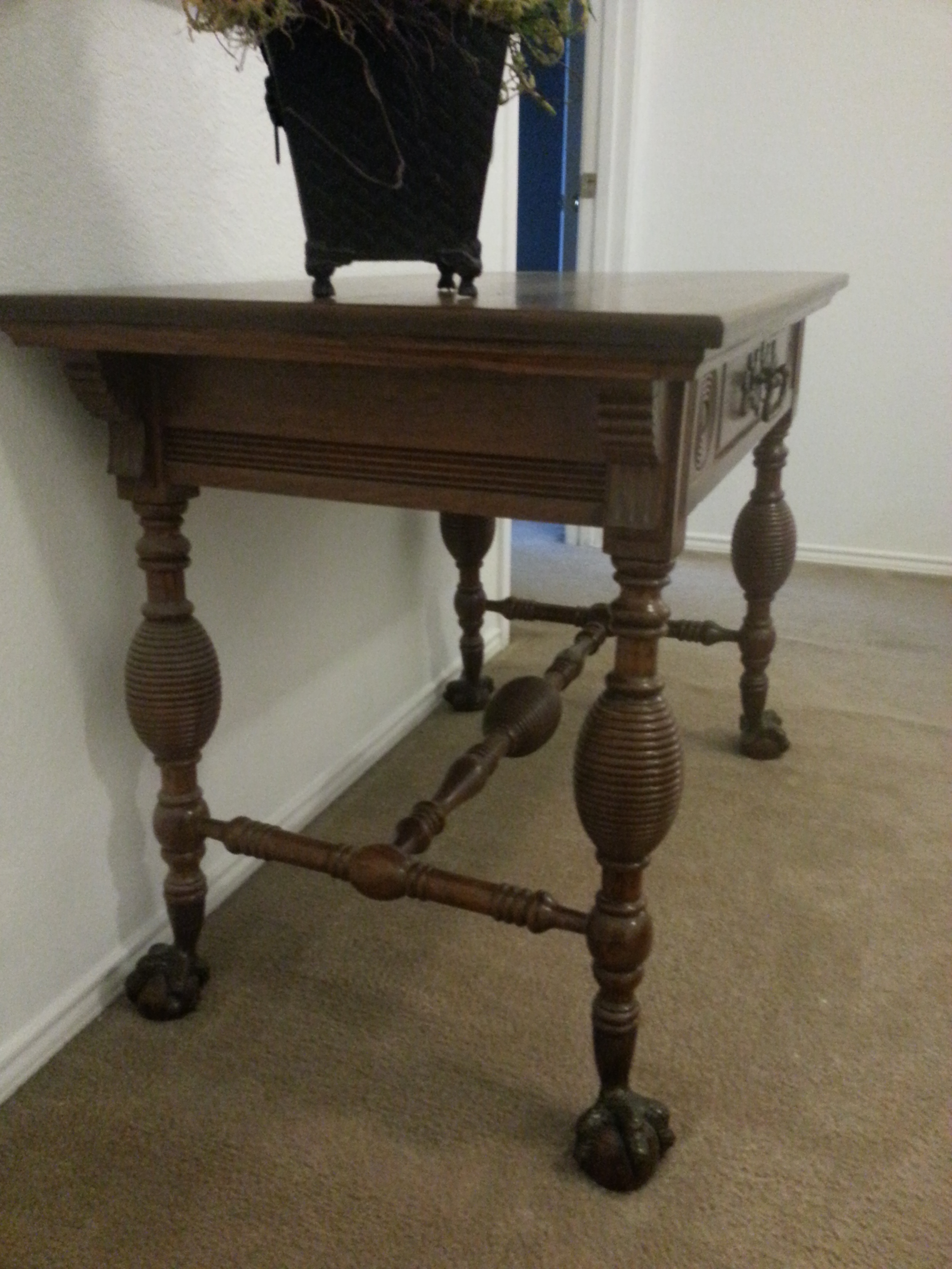I am trying to find out whatever information I can about this table/desk. It is solid wood no metal used to contruct this piece. It looks to be an older piece but Im not sure. Anyone with any information and the approximate worth that would be great!!!