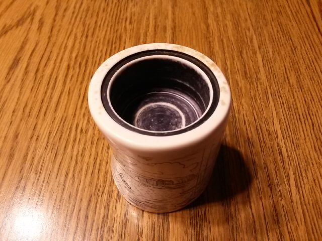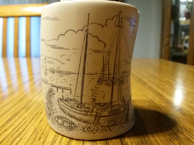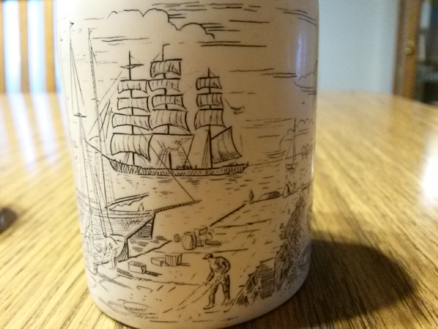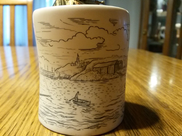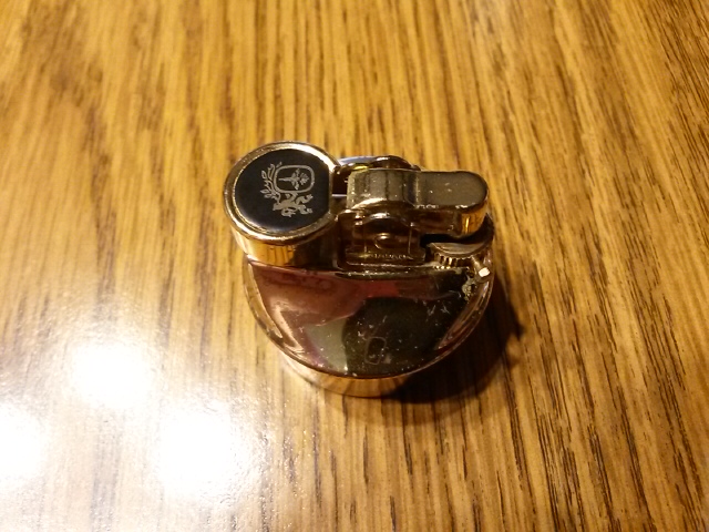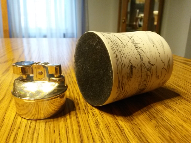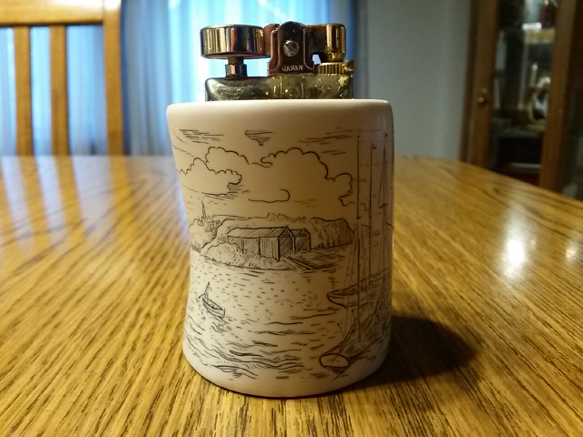 Colibri lighter placed inside a bone or tooth decorated with a beautiful scrimshaw ship scene. The lighter is removable. The bottom is felted. Unknown if real or faux bone.