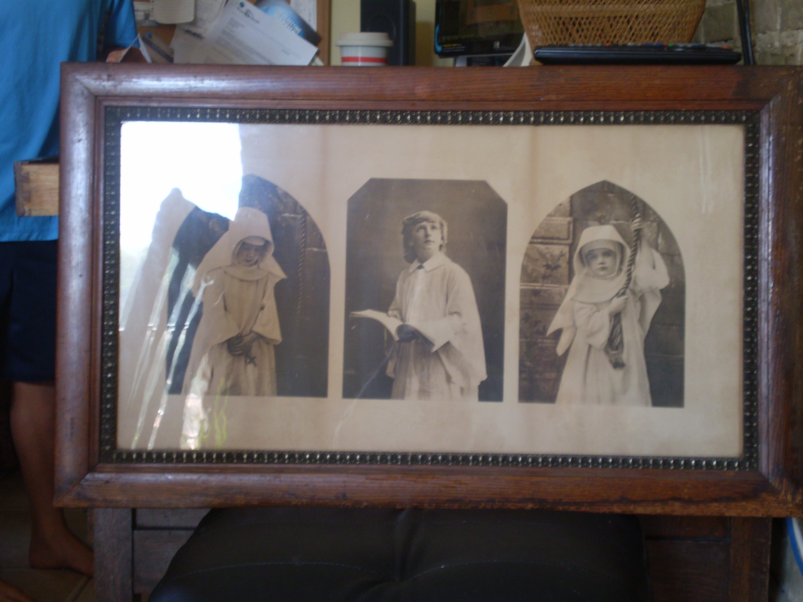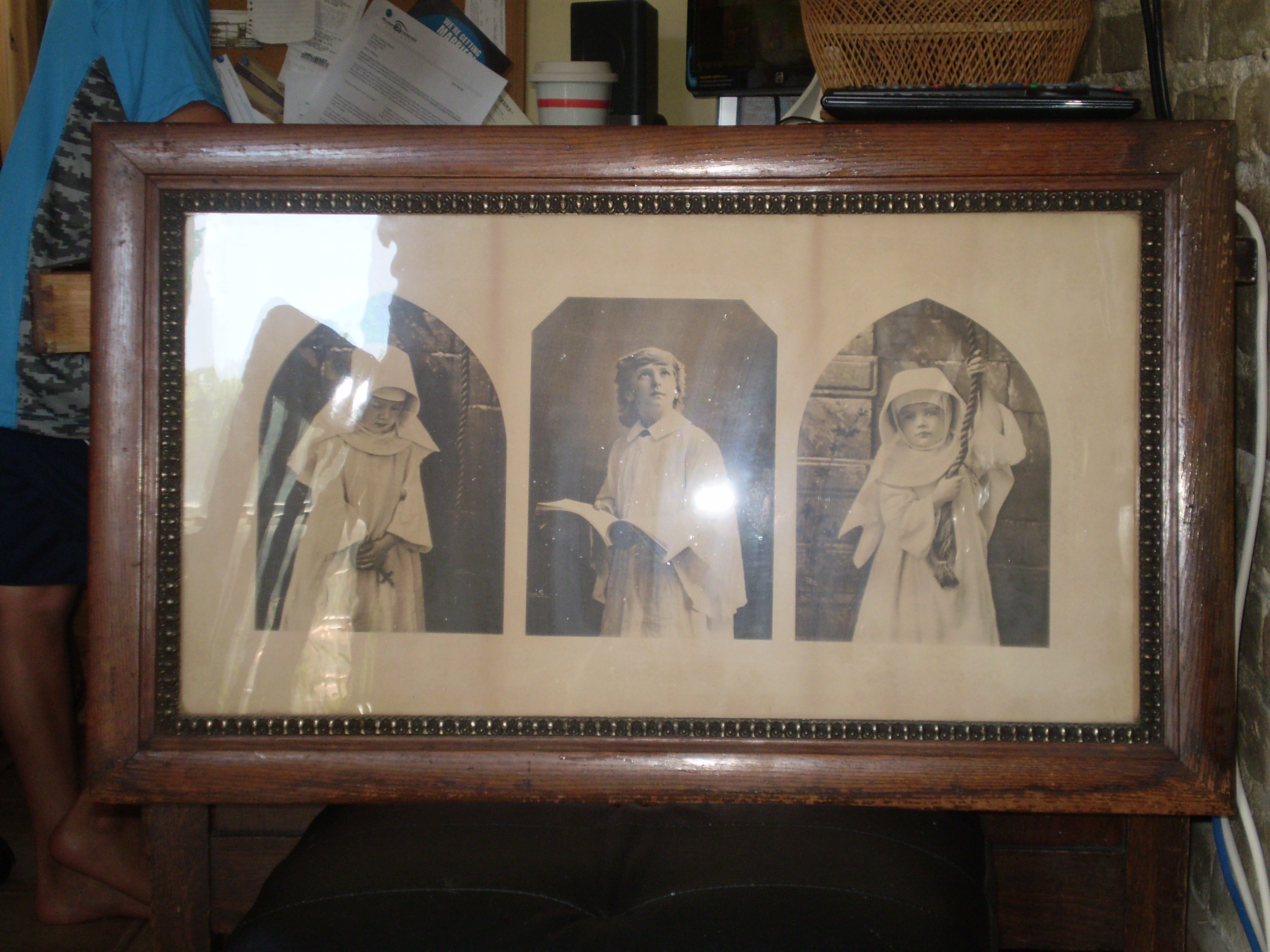 Framed religious print featuring three young girls dressed in habits. By the Tabor Art Company, 1893. Frame is original, has old wavy glass and square nail construction. Hung in our family's farm house for ever until I inherited it.