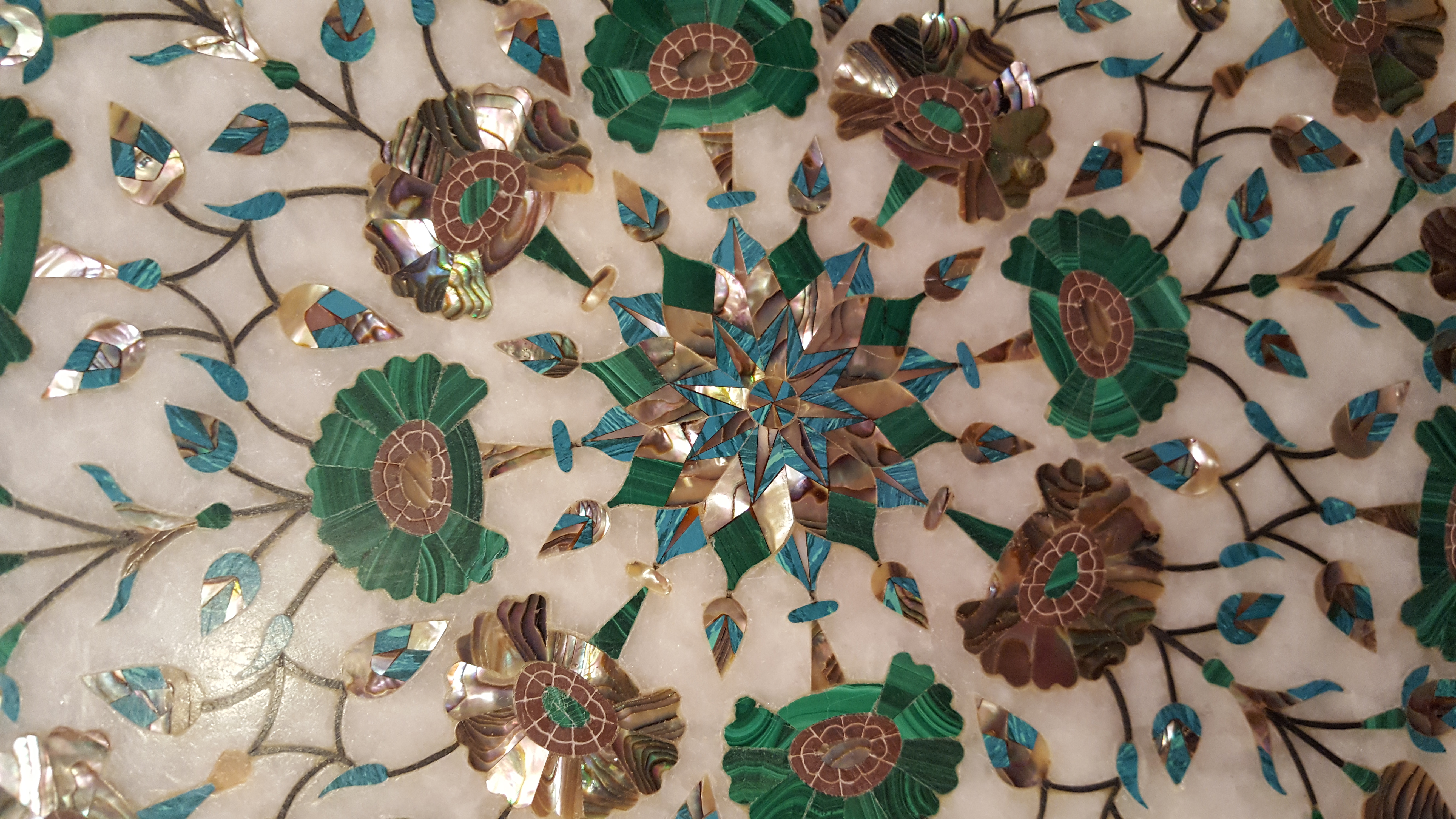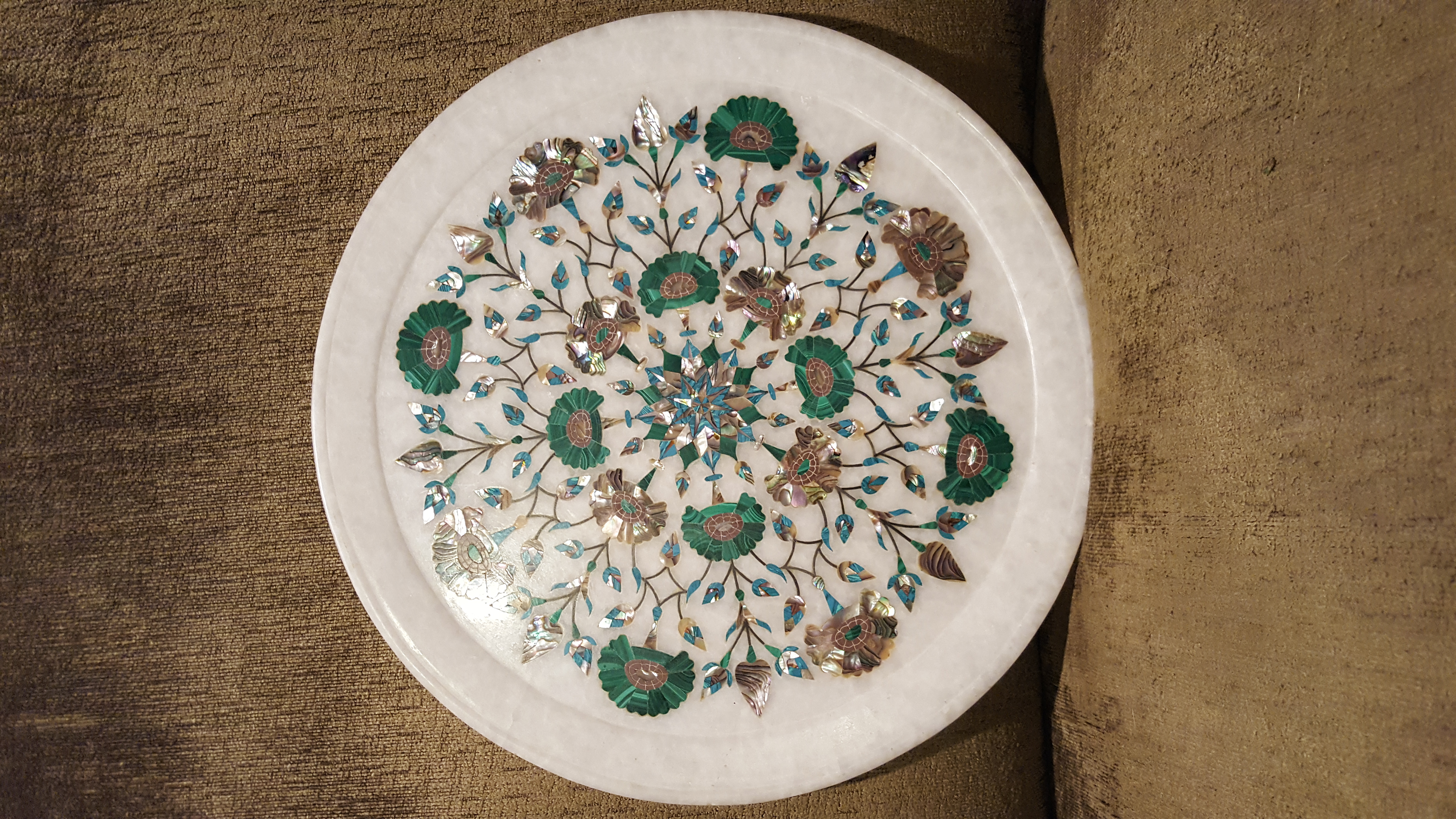 Mother of pearl, turquoise, malachite, and a couple other unidentified gems, inlaid in solid white soapstone.