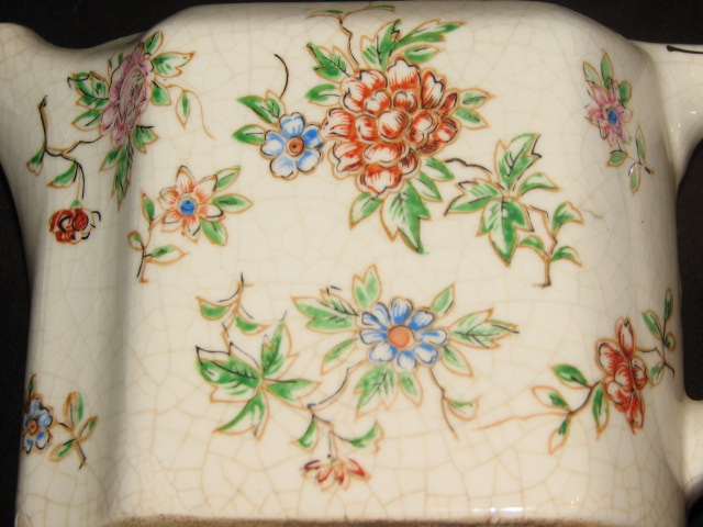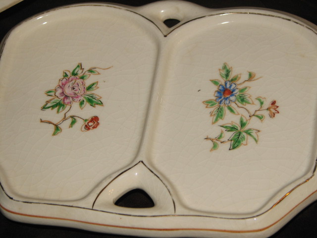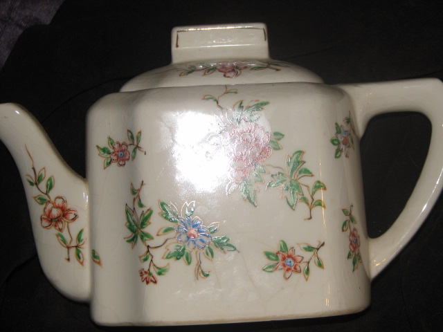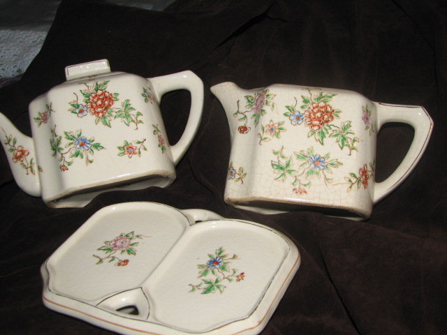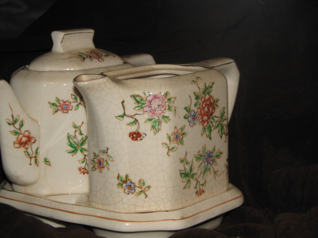 This is interesting because it contains two almost identical teapots (slightly different floral patterns, quite different spouts, and one is missing its lid) on a ceramic base that is molded to fit the bases of the teapots. It's from Takito and has the typical Ts in diamonds, surrounded by Hand Paint Made In Japan, at the bottom of each teapot and the ceramic base. The design is floral with some gold trim on the handles, tip of spout, and tops. The glazing on one has cracked. I've been looking and can't find any double teapot sets like this - why would a set come with two identical teapots on a base, anyway? The spouts are also very different - are they both teapots? Is one for coffee? The ceramic base also has a floral pattern that is shown when the teapots are lifted up.