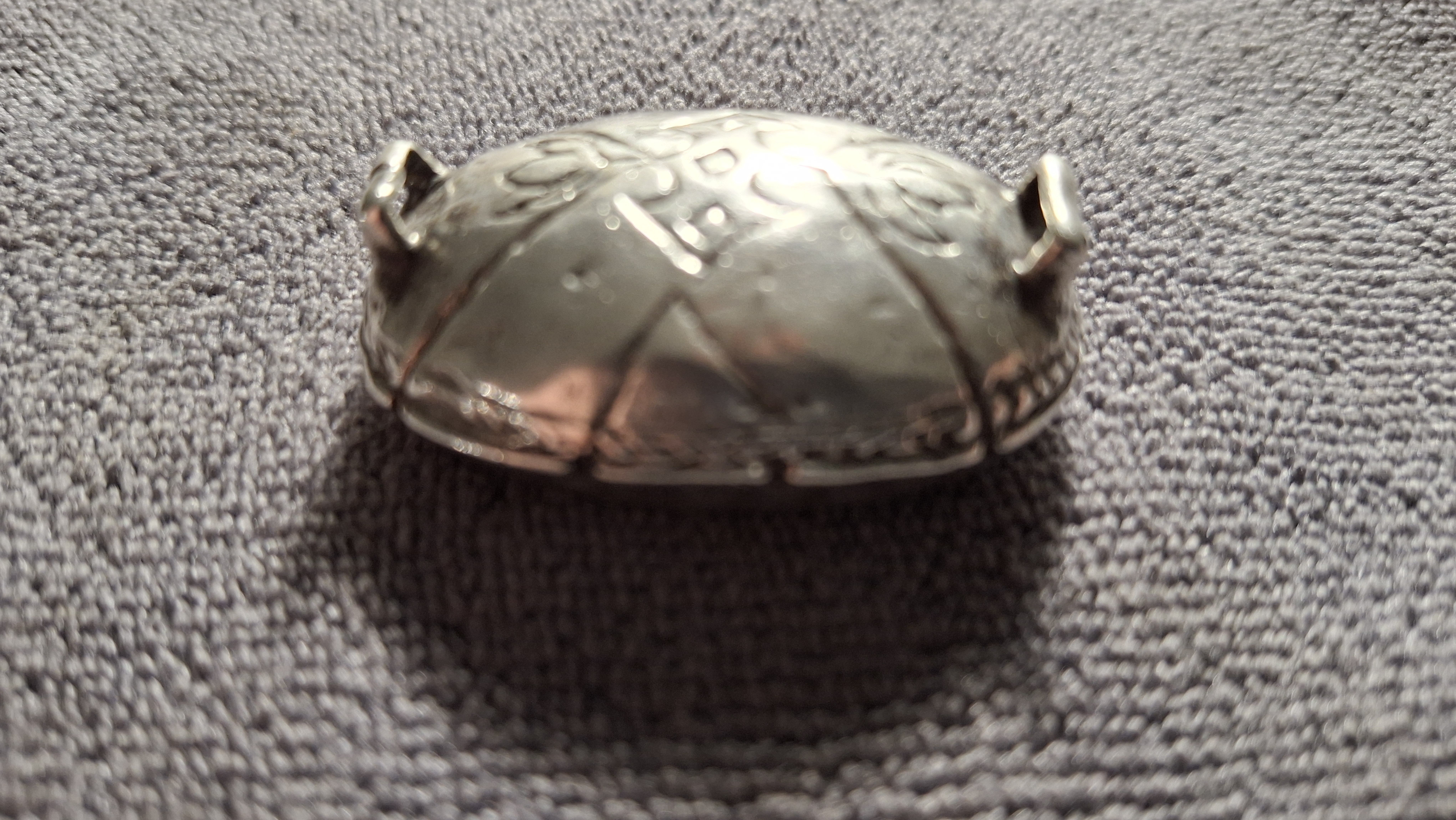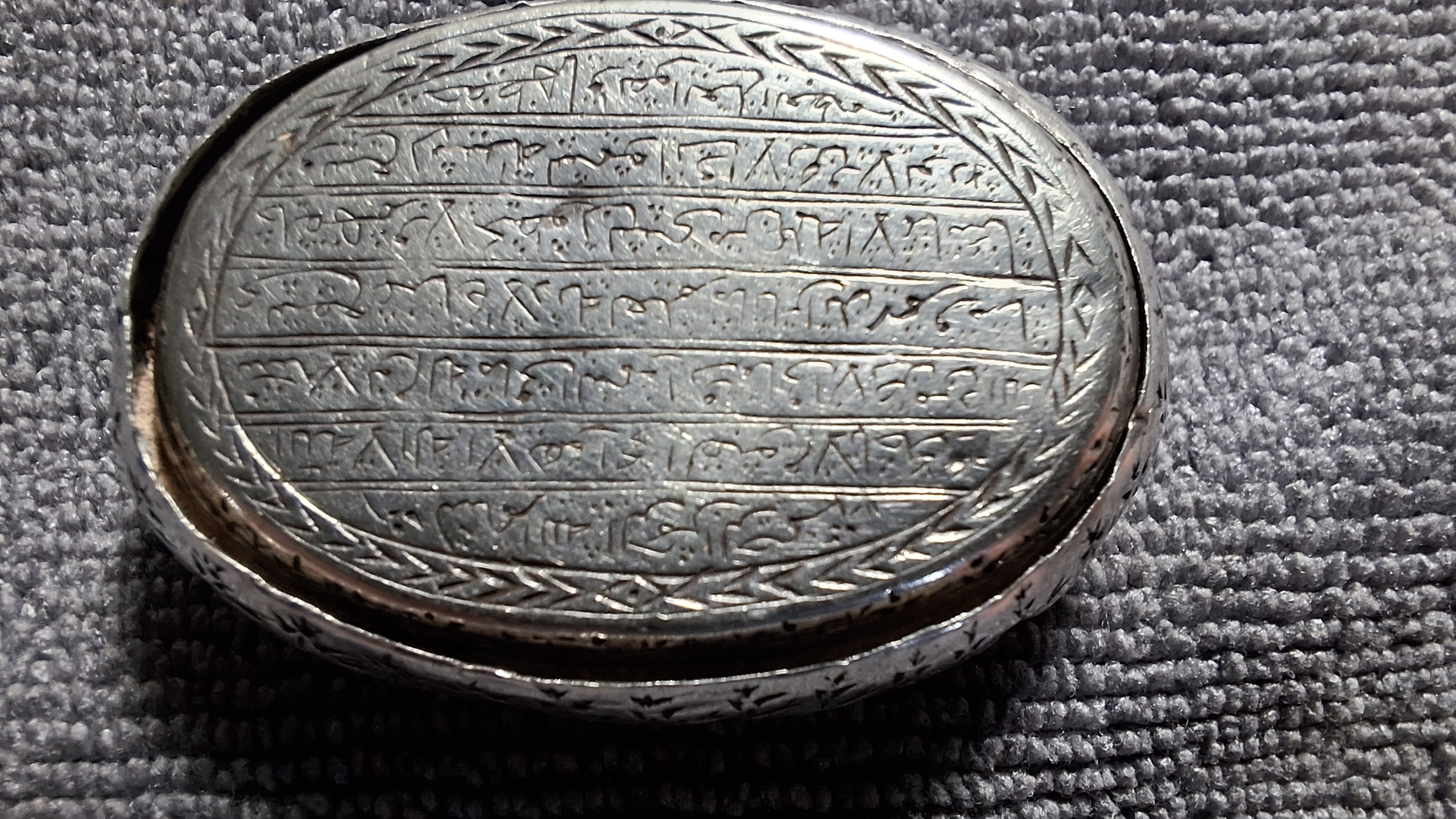 Description: This silver talisman features intricate engravings on its surface, including an inscription on the underside. The design is characterized by a decorative border and multiple lines of text, suggesting it may have cultural or spiritual significance.