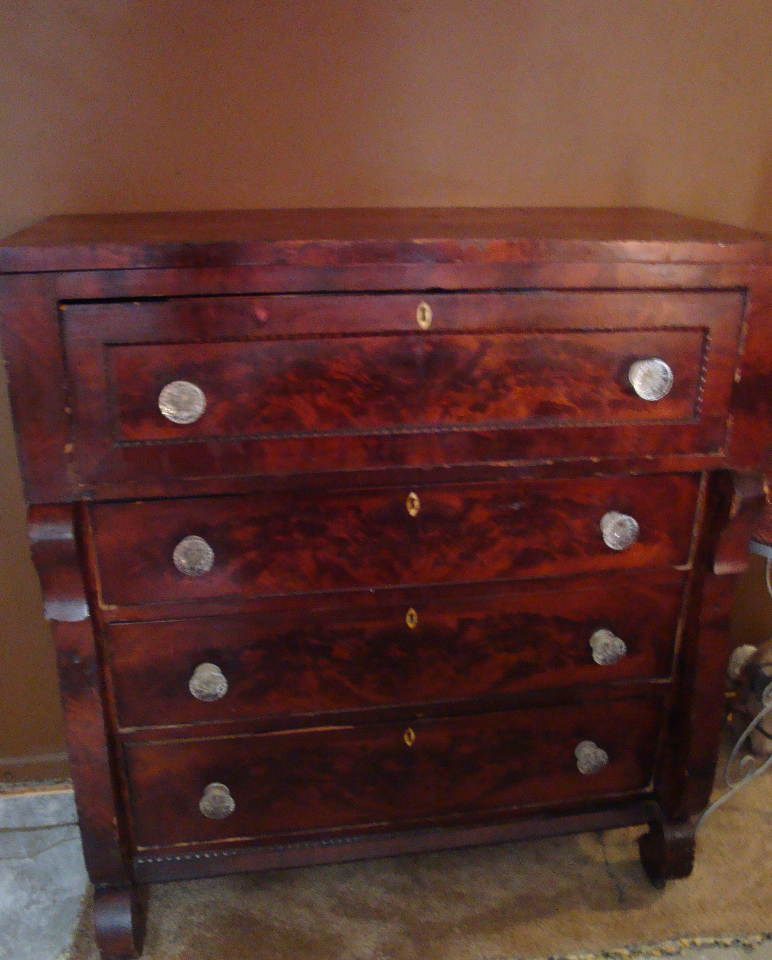 Hi, I have a burled wood antique dresser that I believe to be an original Empire Dresser from the mid-to-late 1800's. It has four very large drawers with ivory keyholes down the center. Anyone happen to know what this piece is worth?