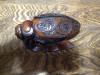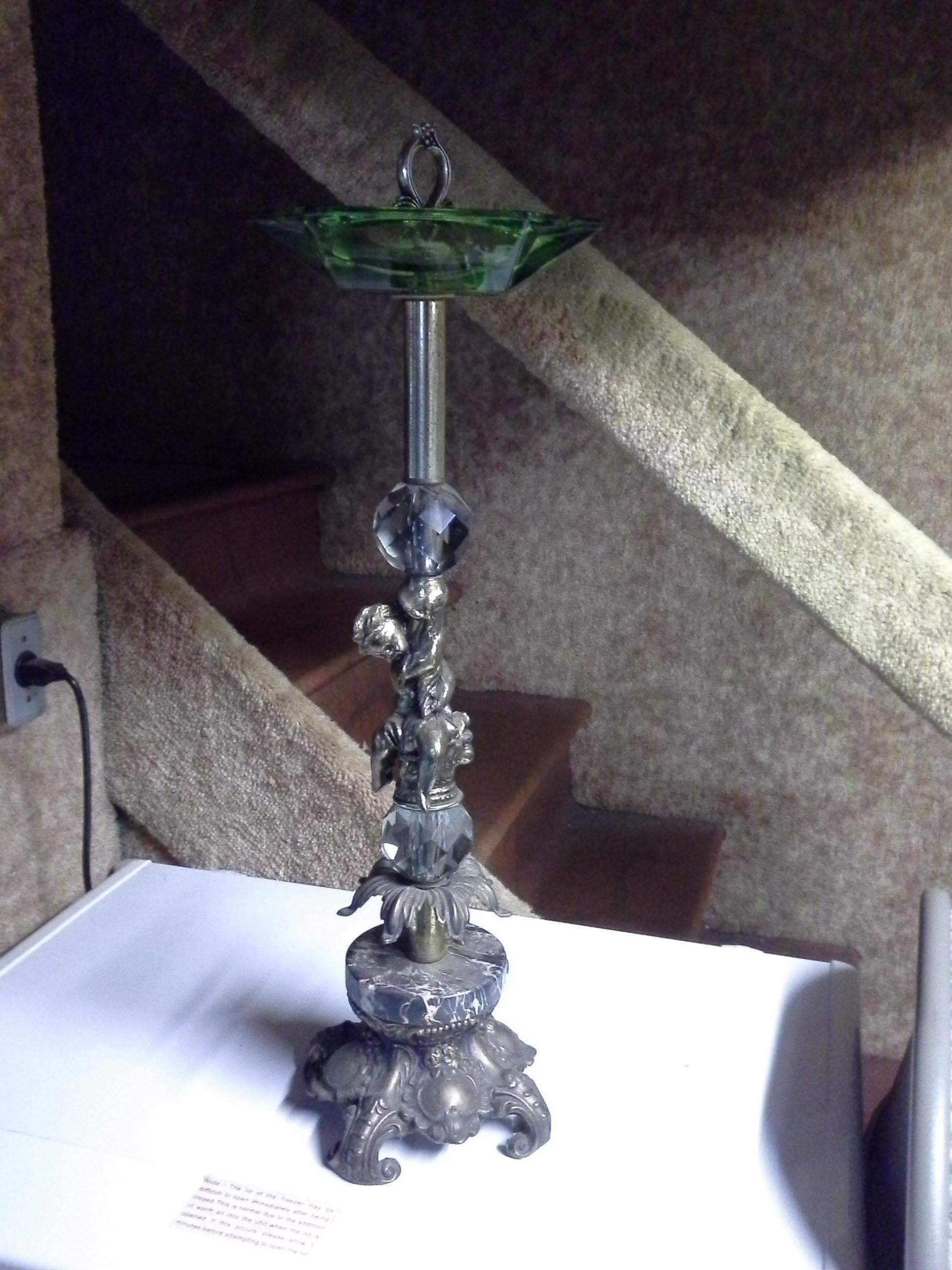 Tall ashtray, ashtray is green glass, there is a round crystal in the middle, bottom has square black/multi color marble piece on top of brass and angel is brass. Markings on bottom say Corneil 1117. No chips or cracks. Brass is somewhat worn. Thanks