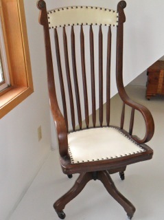 Love to know the value of this interesting and unique office chair. Someone has offered to buy it but I have NO idea of it's value. It is obviously old, don't know if it's American or European. Dark oak with upholstered seat and head rest. Emblems on each upper corner. Very excellent condition. Very comfy to sit in.
