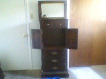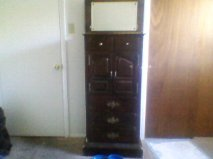 It's a tall 3 drawer dresser with cabnet and built in jewlery box