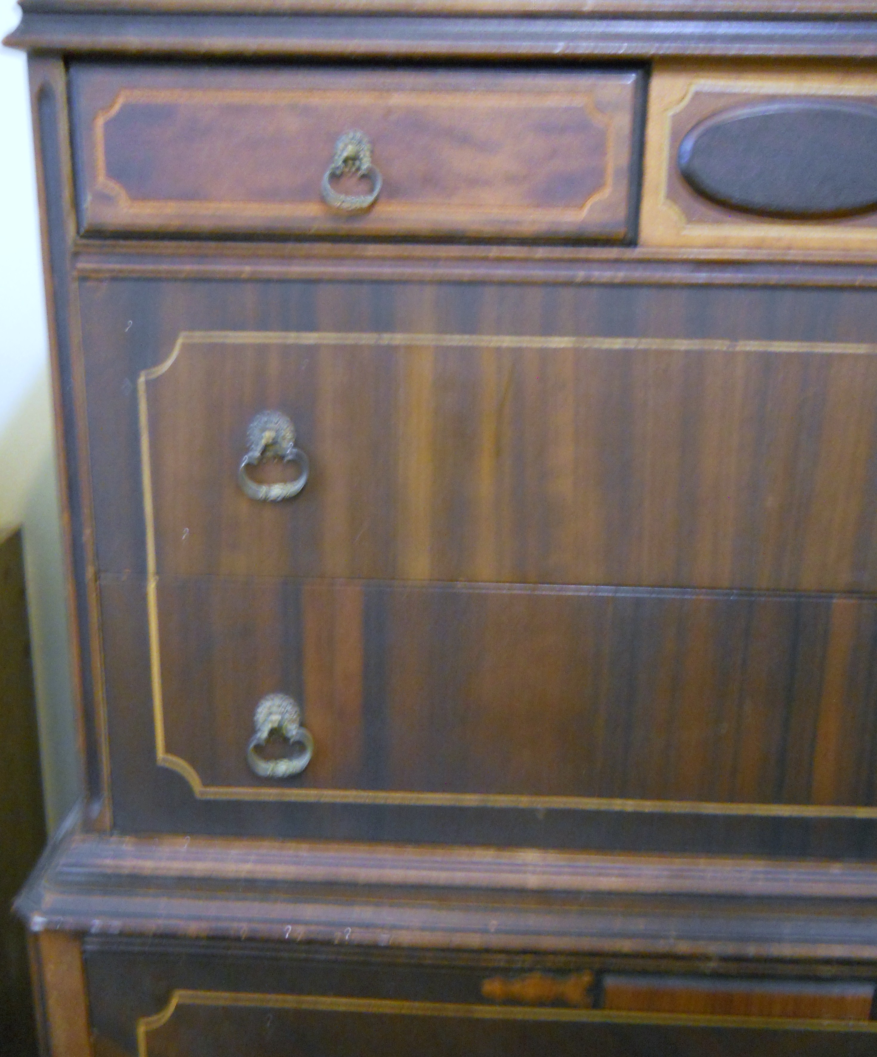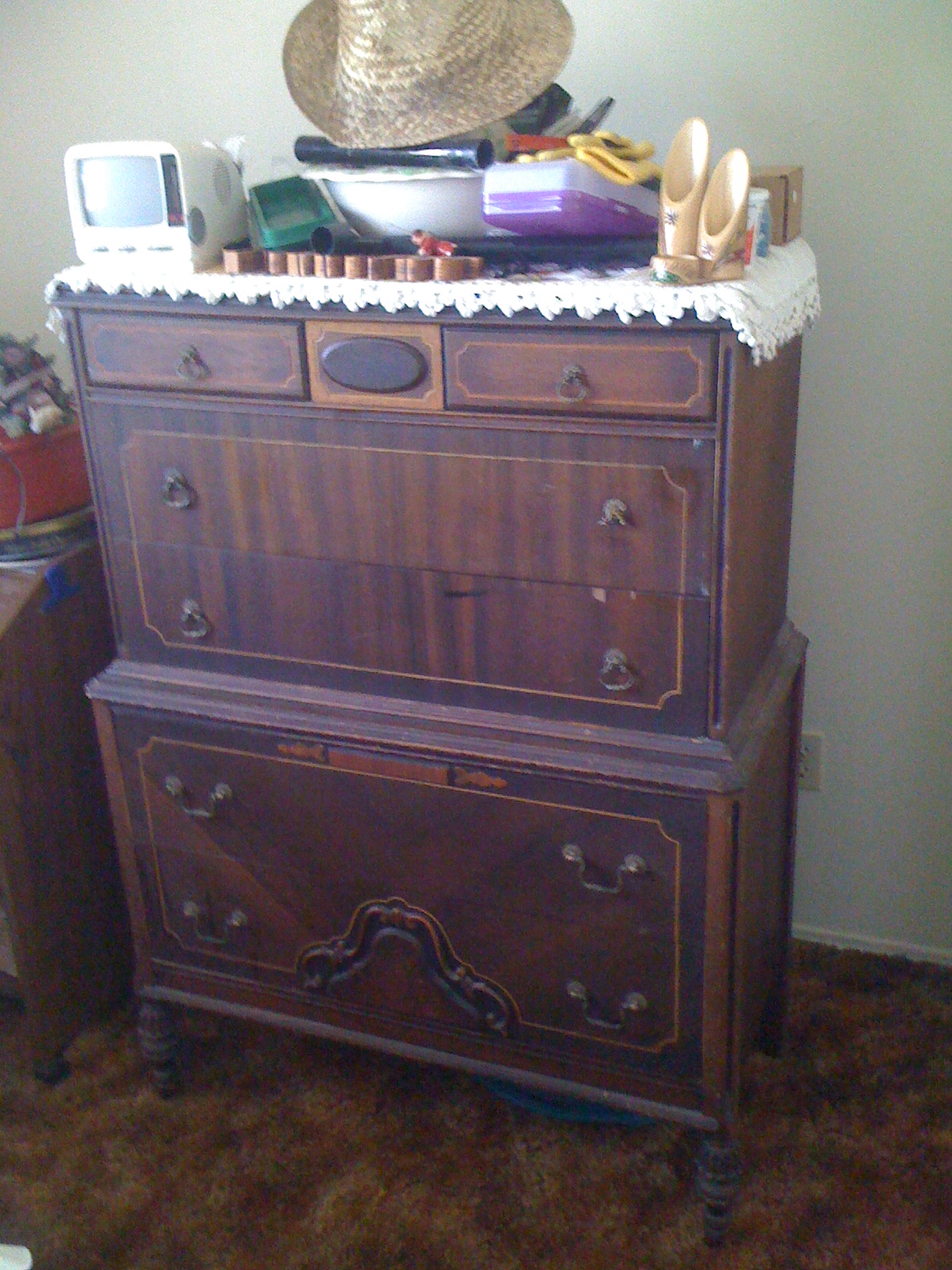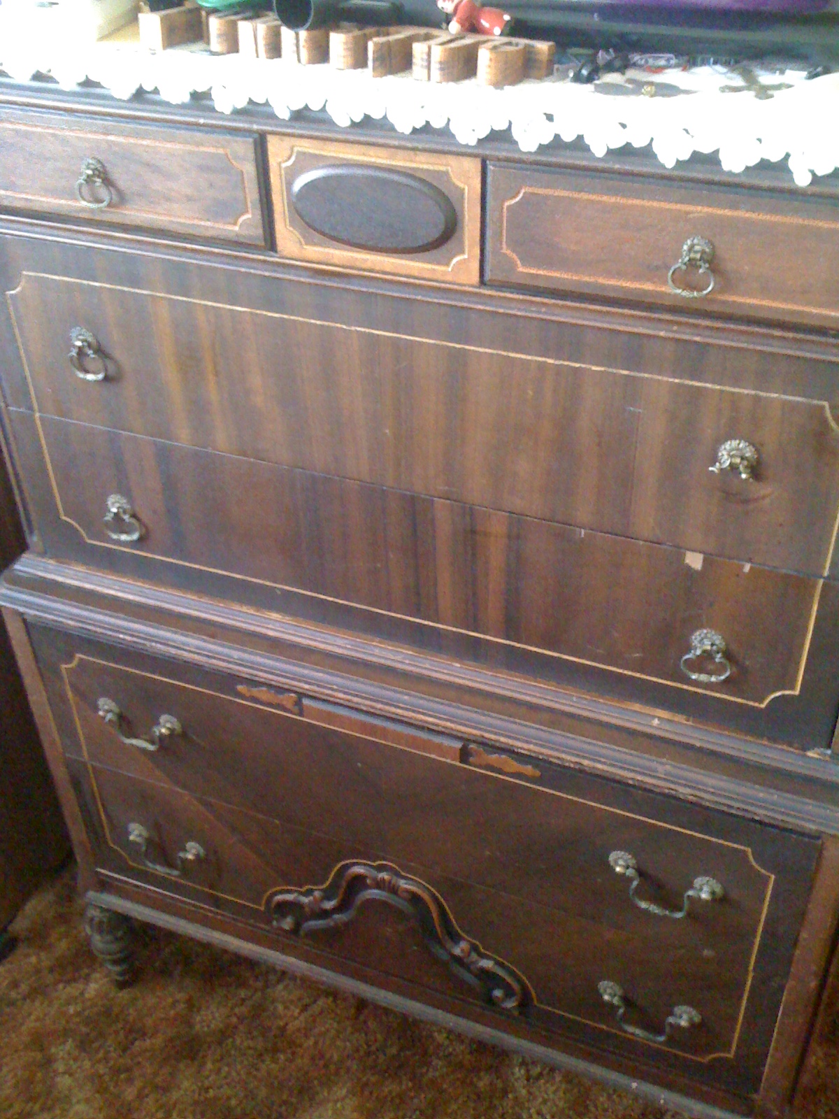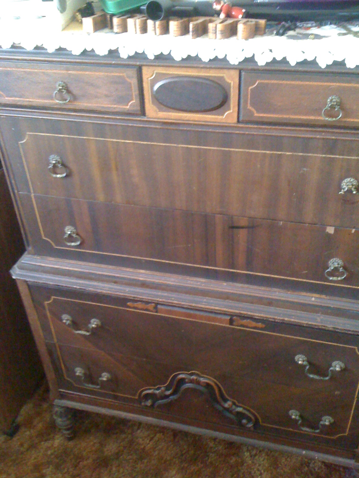 Tall dresser, on carved or milled legs. Some embellishments and curves. I havent looked closely for any manufacture markings or date, sorry. Hoping to get a feel for period and style as much as a ballpark appraisal, I have no idea about this piece I just liked it. Bought it from a friend 25 years ago, it was a family piece handed down and we've lost touch long ago, so I cant get additional info there. There is one broken drawer pull and one chip in the veneer, on a drawer. Also, how do I find a matching drwaer pull, anyone?