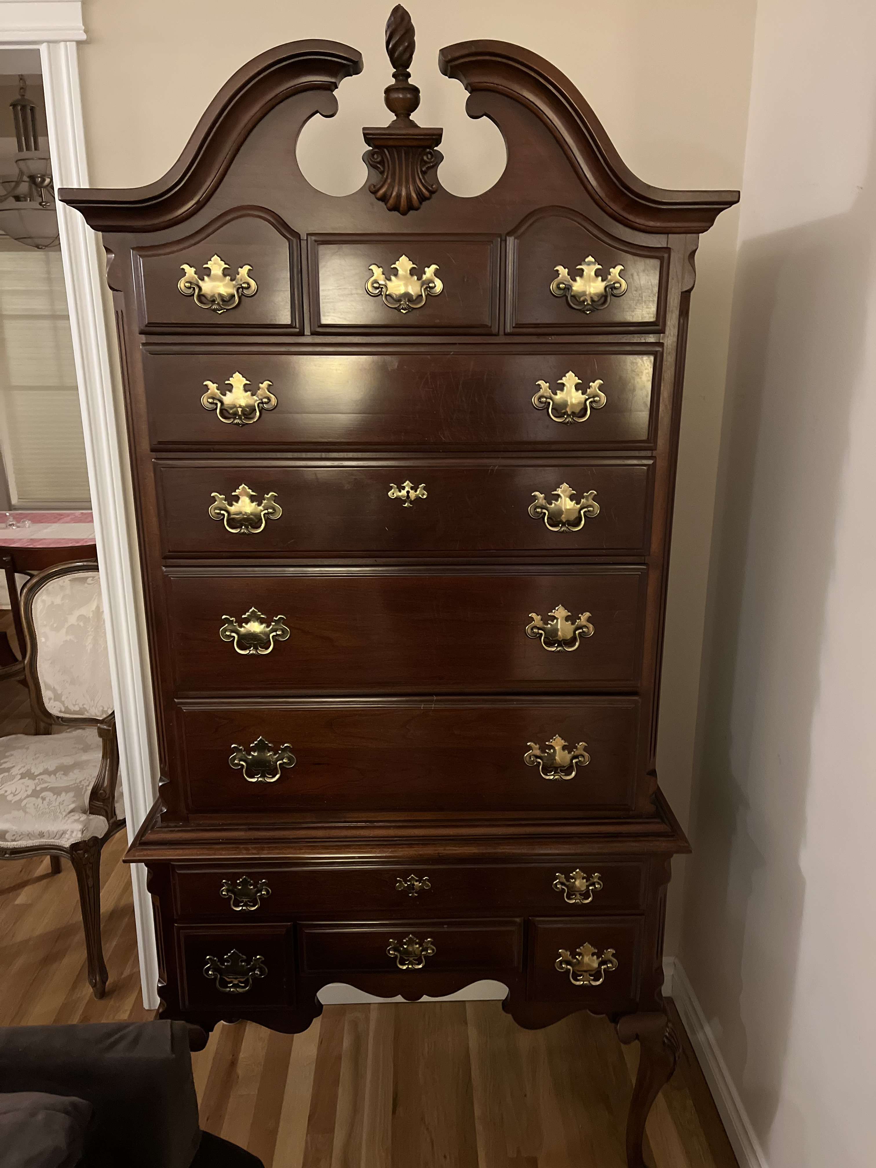 Physical Description: This is a two-piece tallboy dresser, designed in a traditional style. The piece features a rich mahogany finish, showcasing a smooth surface with a warm, deep color. The tallboy is adorned with ornate brass hardware, including handles and escutcheons, which add to its classic appeal. The upper section consists of three smaller drawers above four larger drawers, with a decorative pediment and finial at the top. The overall dimensions are approximately 72 inches in height, 40 inches in width, and 20 inches in depth.