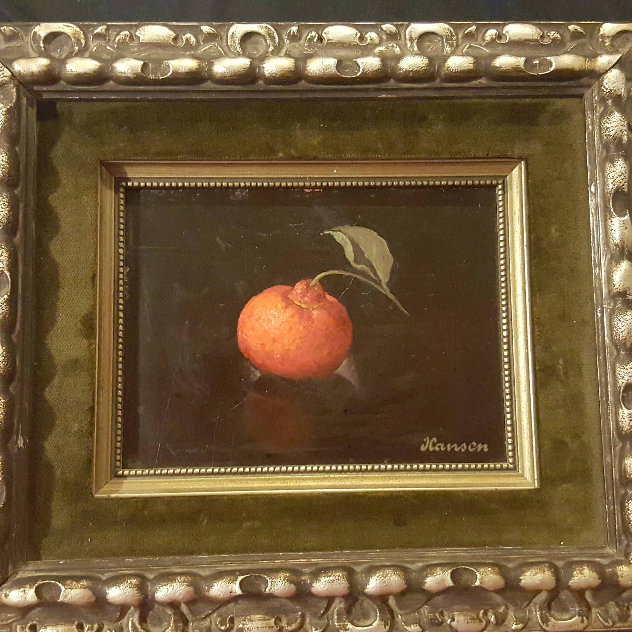 Description I Was Given A Small Painting Of A Single Tangerine In A Fancy Velvet Wooden Frame On The Back It Says 613 Tangerine Oil By Hansen 6x8 It Is Signed In The Front Hansen I Recently Saw A Larger Painting With The Same Signature On another site that is selling for 5000 Can Someone Tell Me Wut I have here