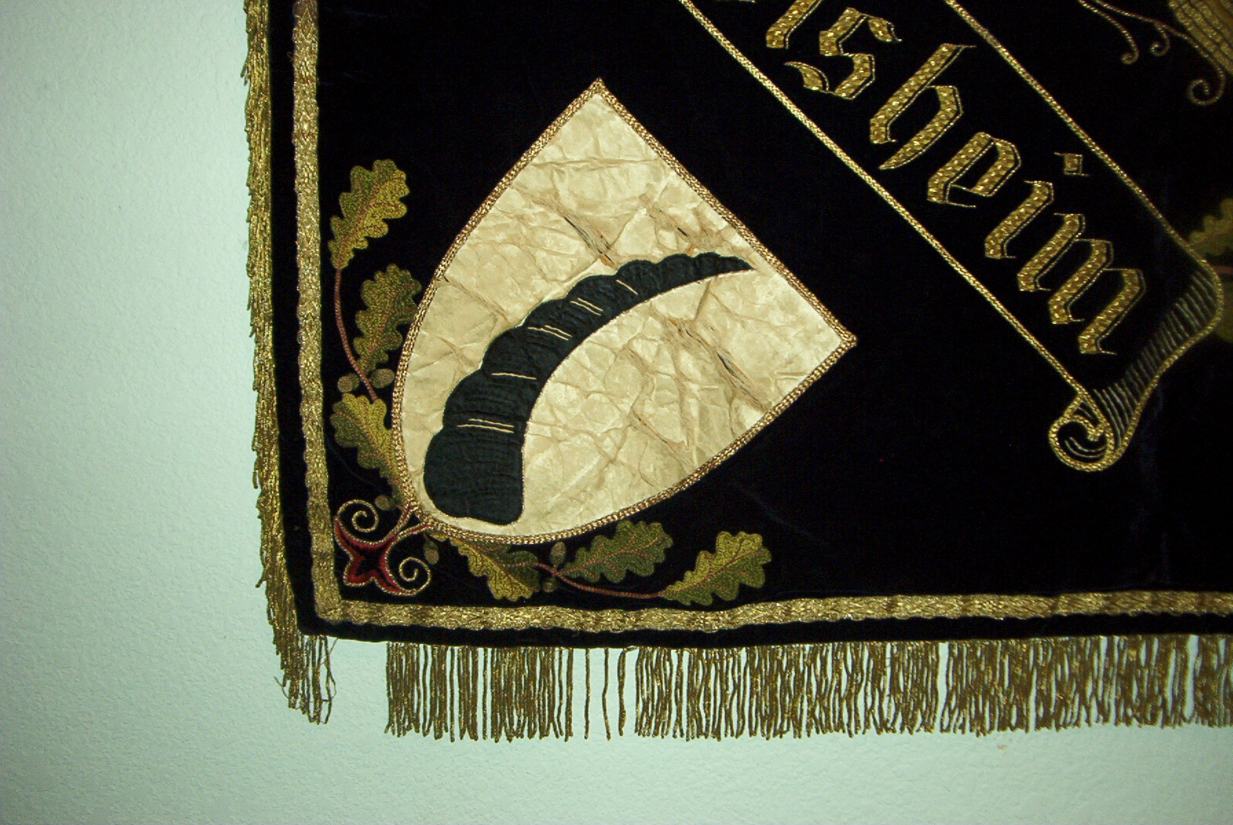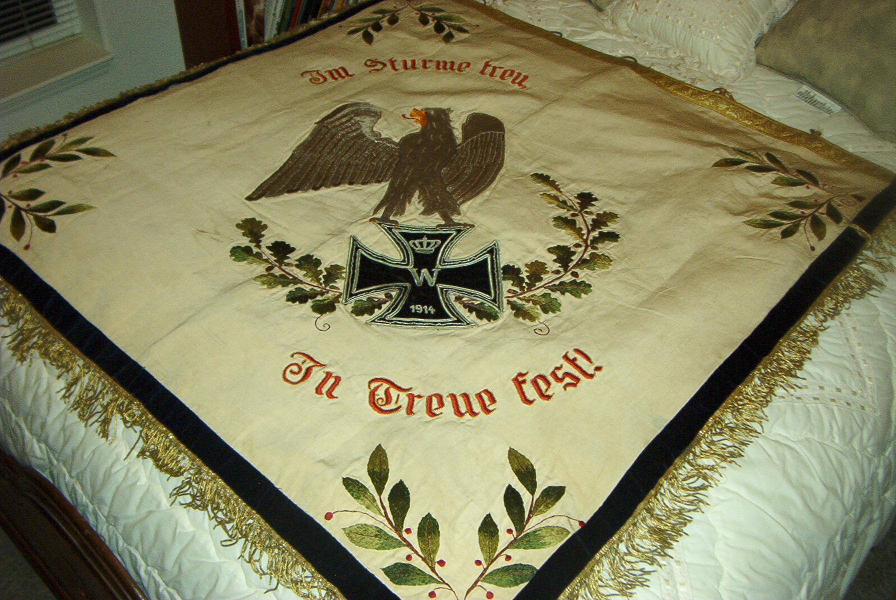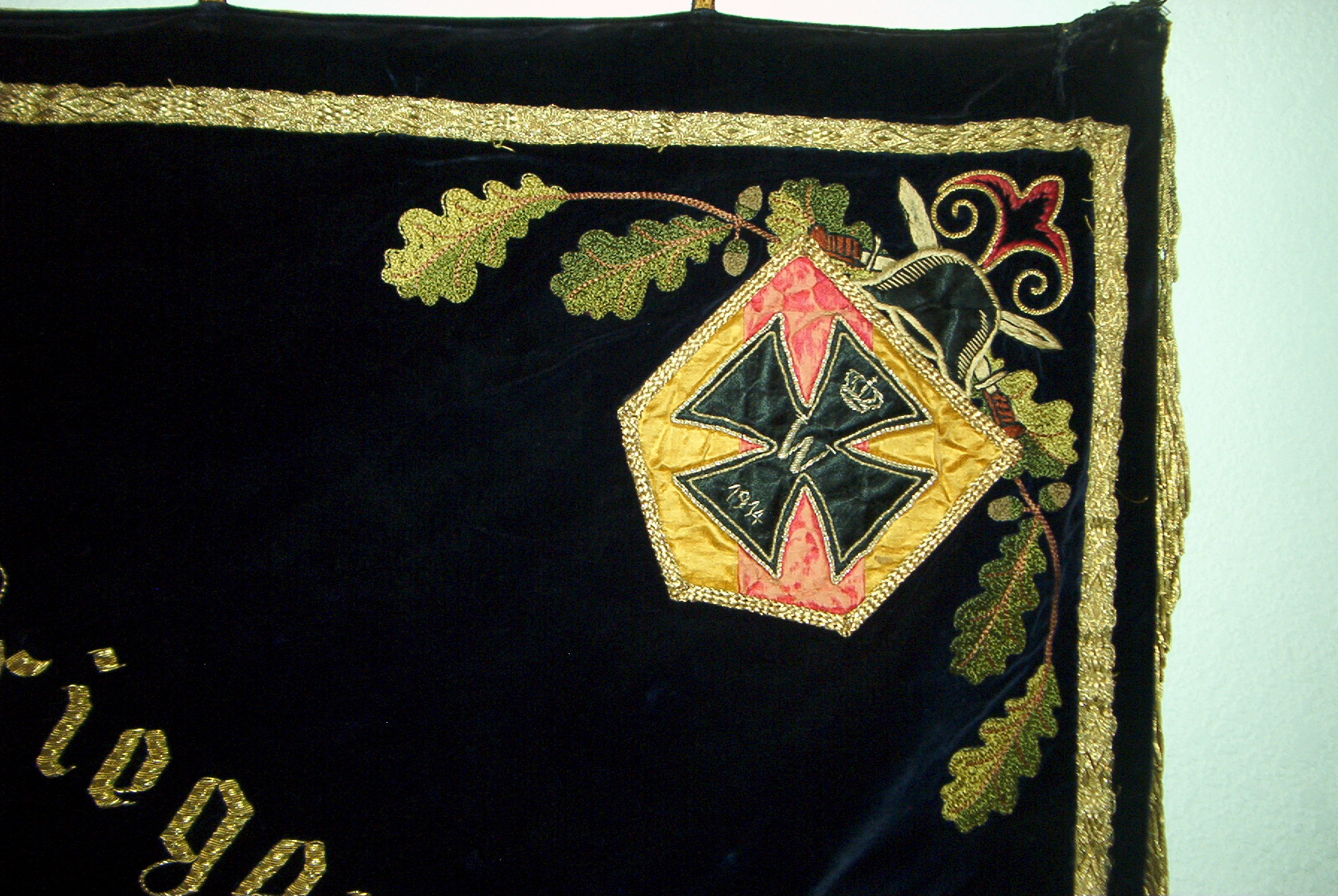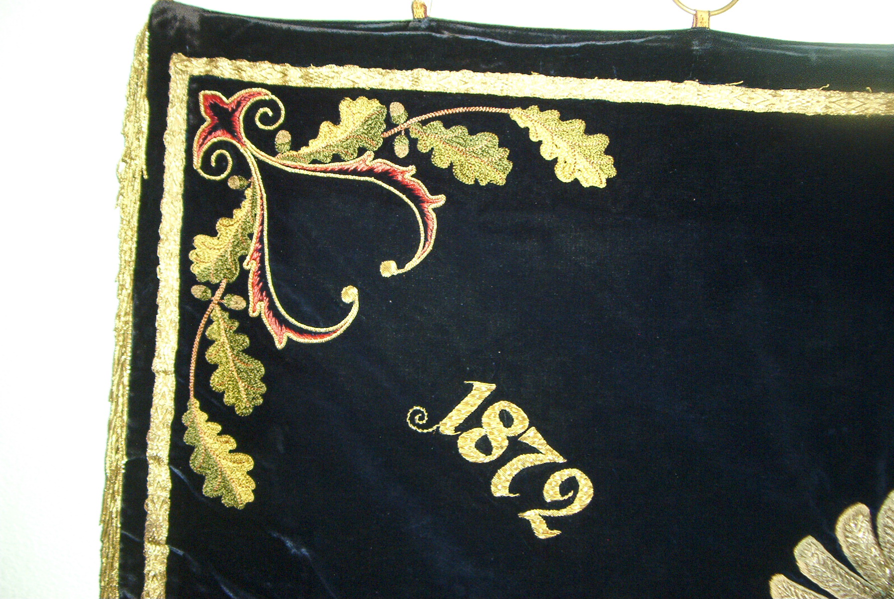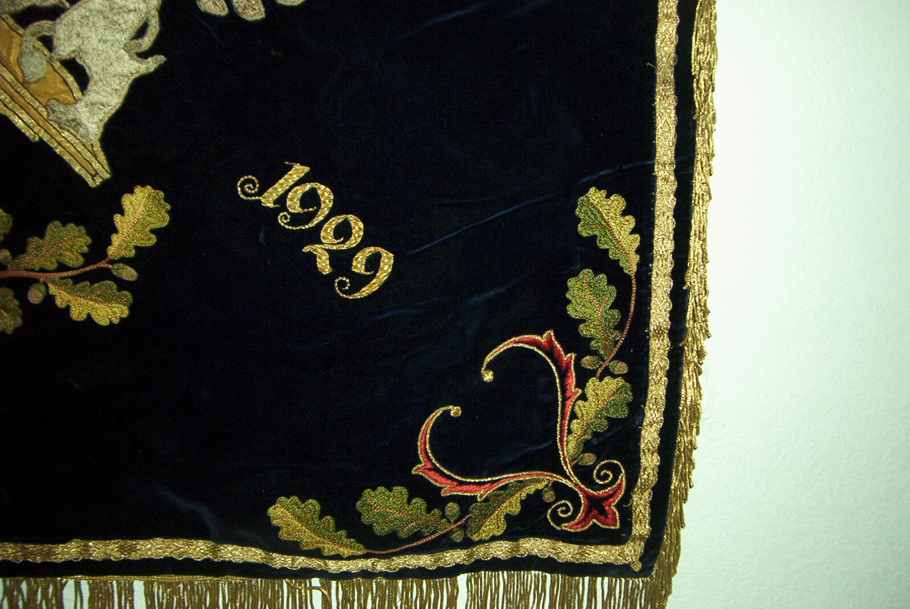 One side is blue velvet with embroiker and dates 1872-1929 and in one corner 1914. The other side shows a Egale and date of 1914. The Eagle is Embroider.