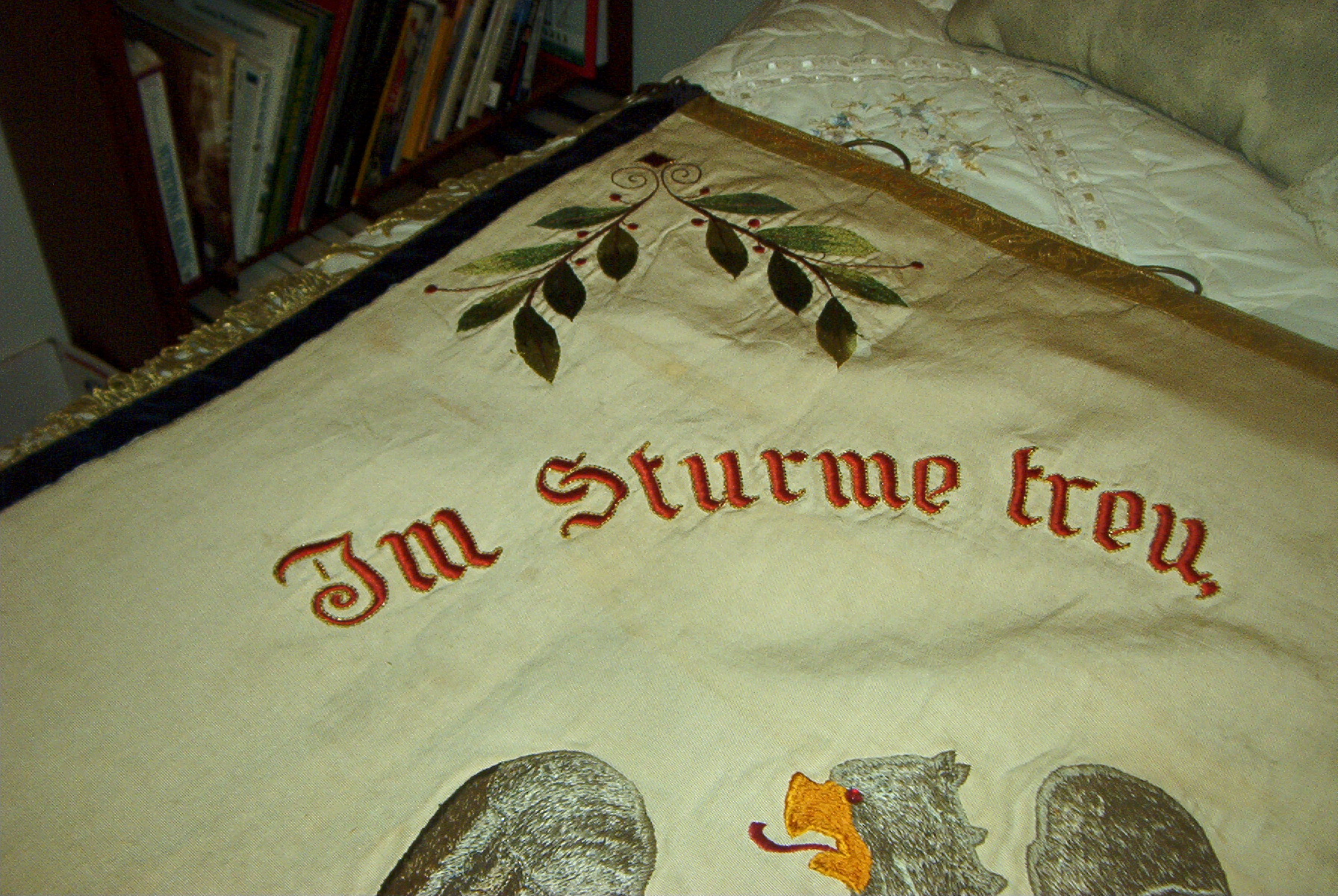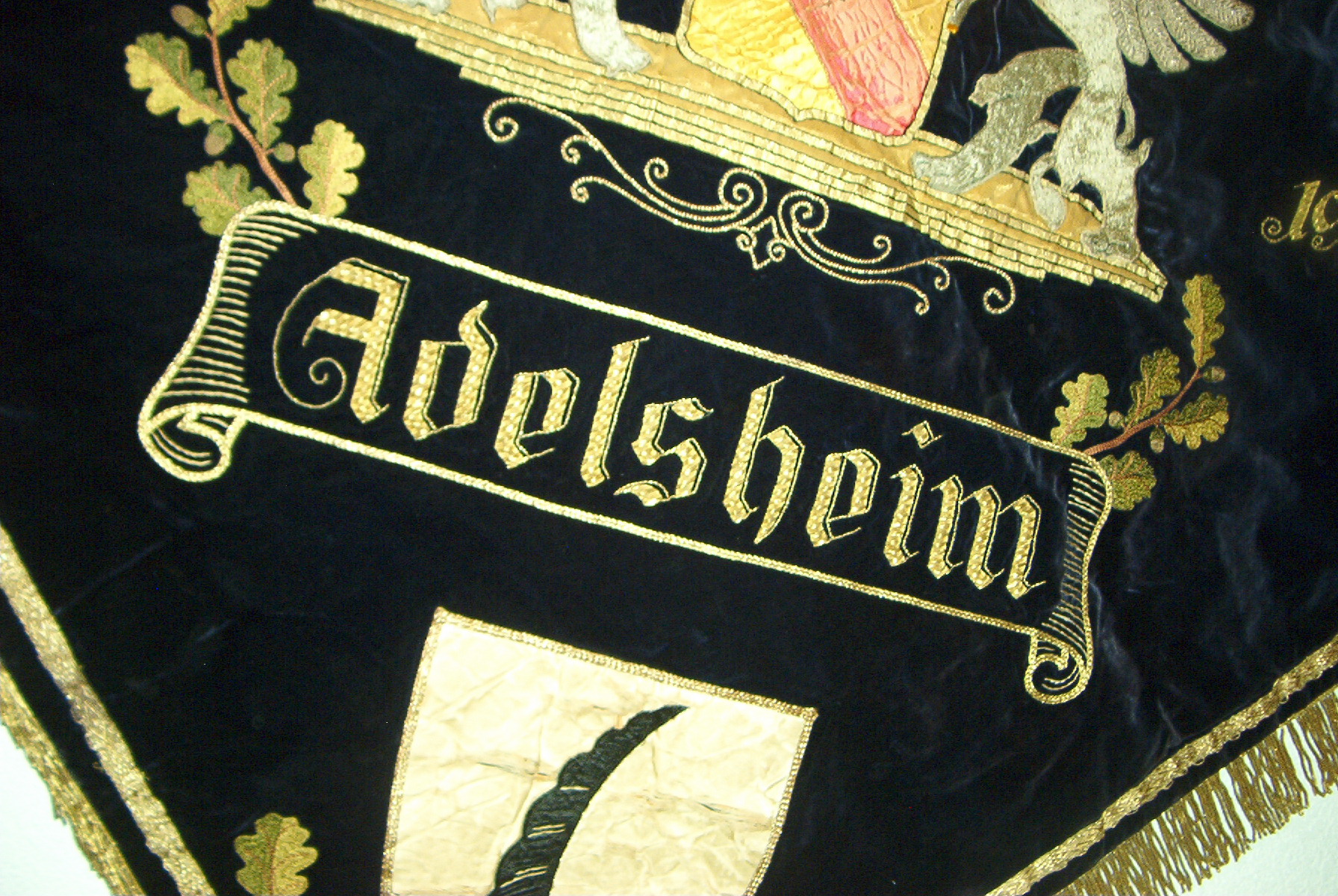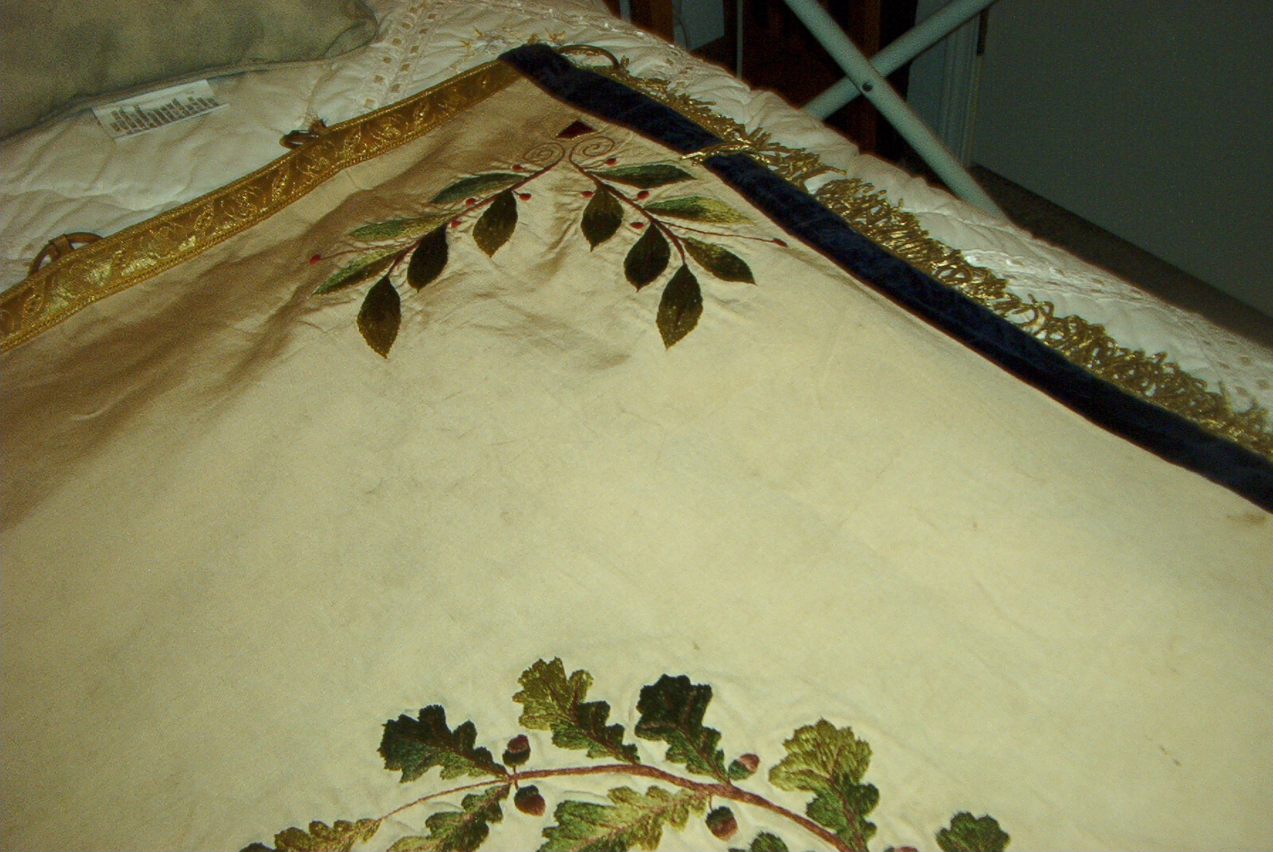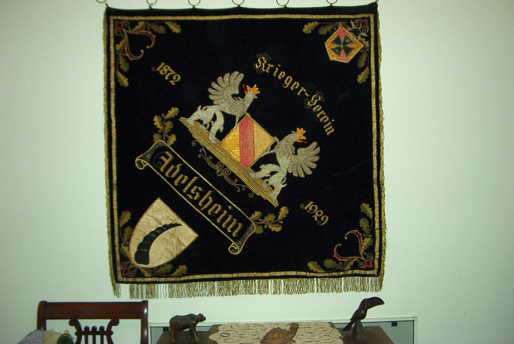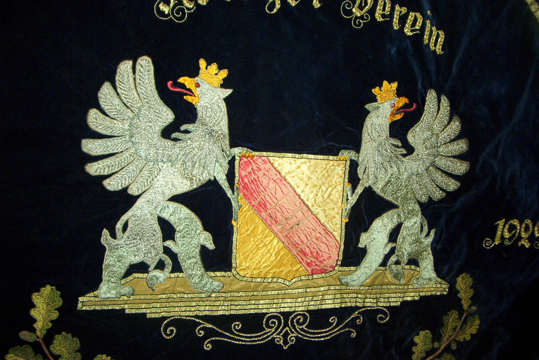 One side is blue velvet with embroiker and dates 1872-1929 and in one corner 1914. The other side shows a Egale and date of 1914. The Eagle is Embroider.