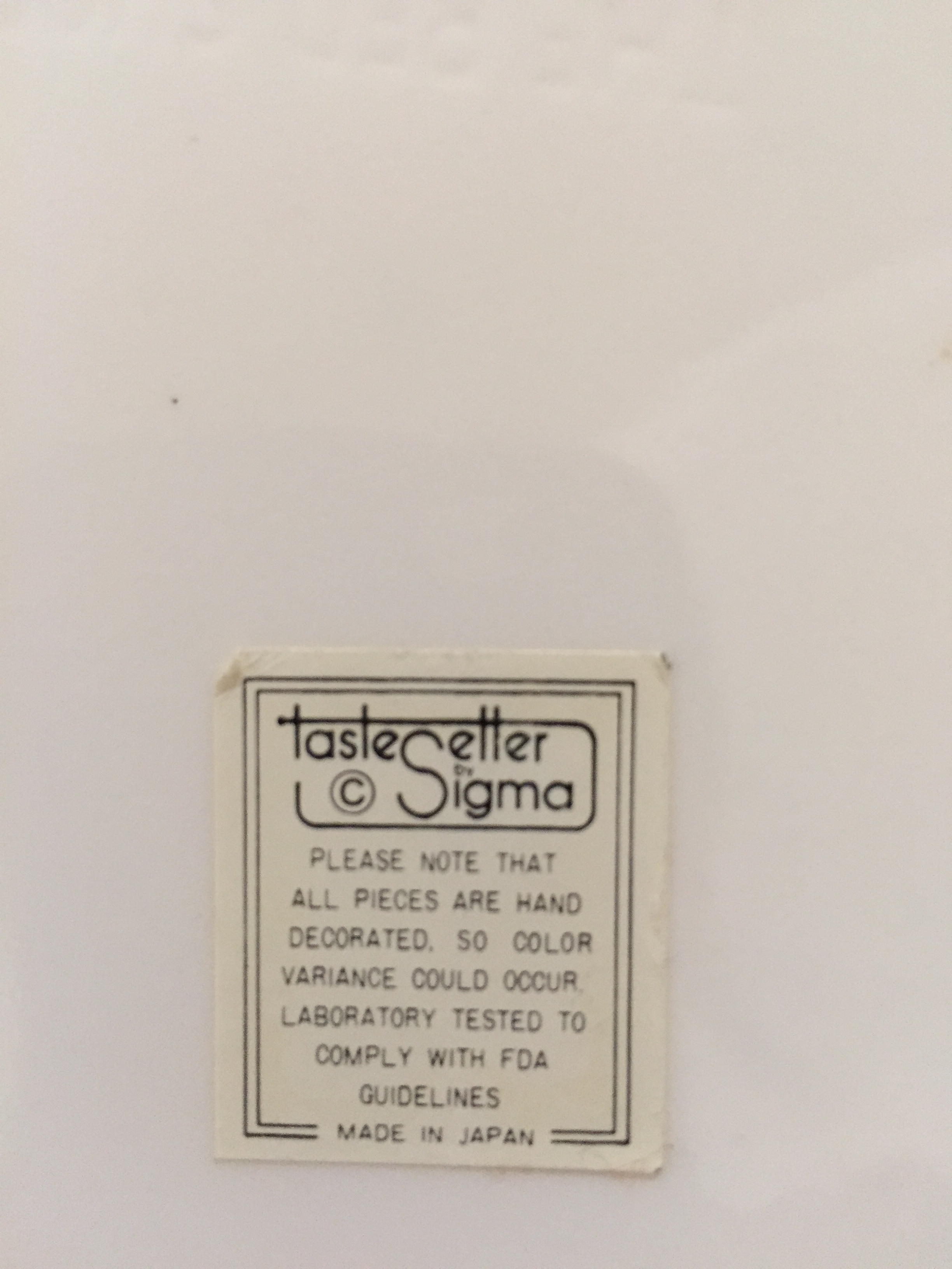 label on bottom reads, 'taste setter by sigma. all pieces are hand decorted so colour may vary. made in japan'