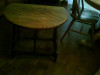 Antique tavern card table from a tavern in Wisconsin. Oak, 4 matching chairs as seen in picture. Table has drink holders under table attached to legs. Under the table drink holders followed by a round ball design then by long grooves in legs.