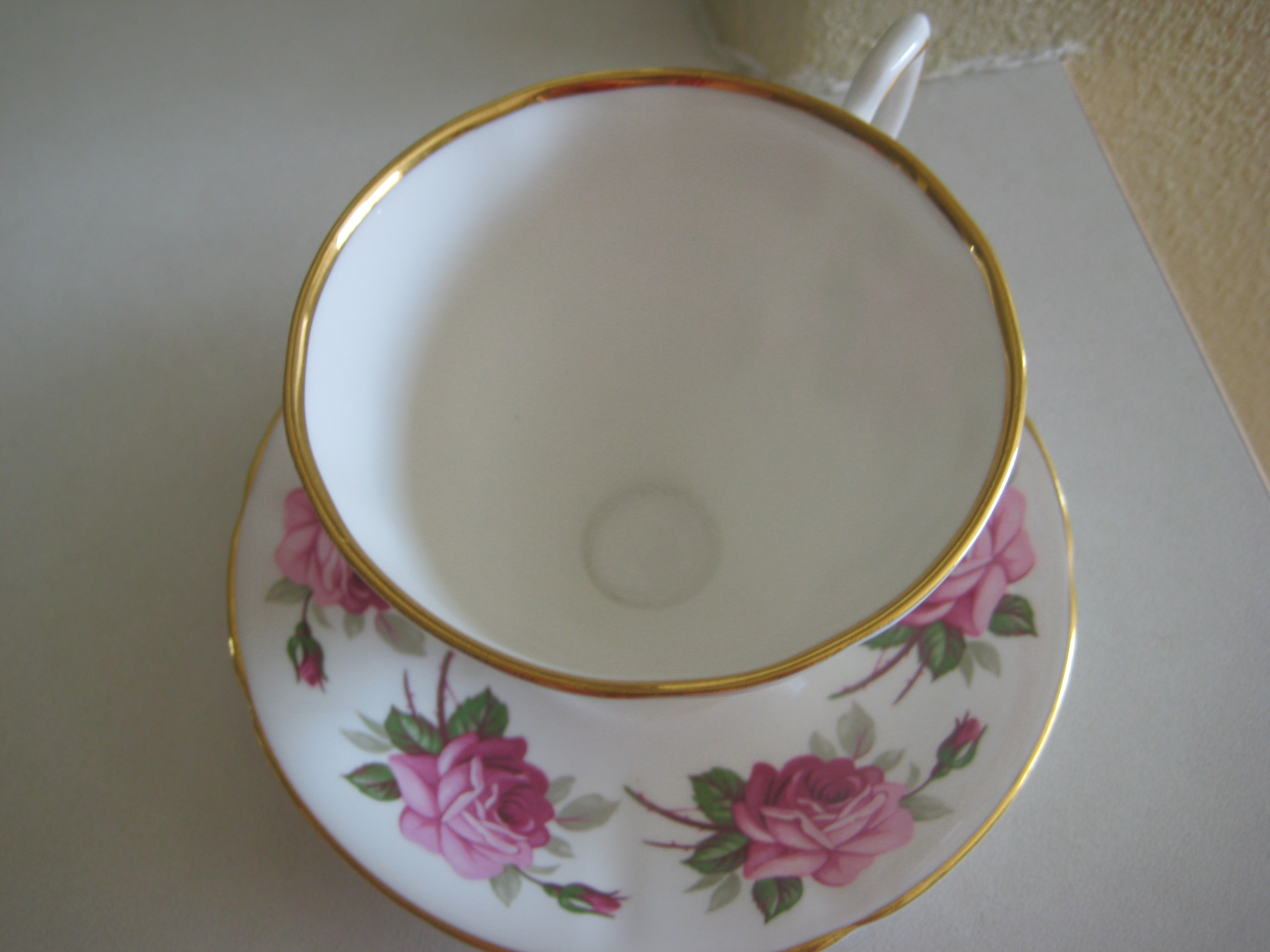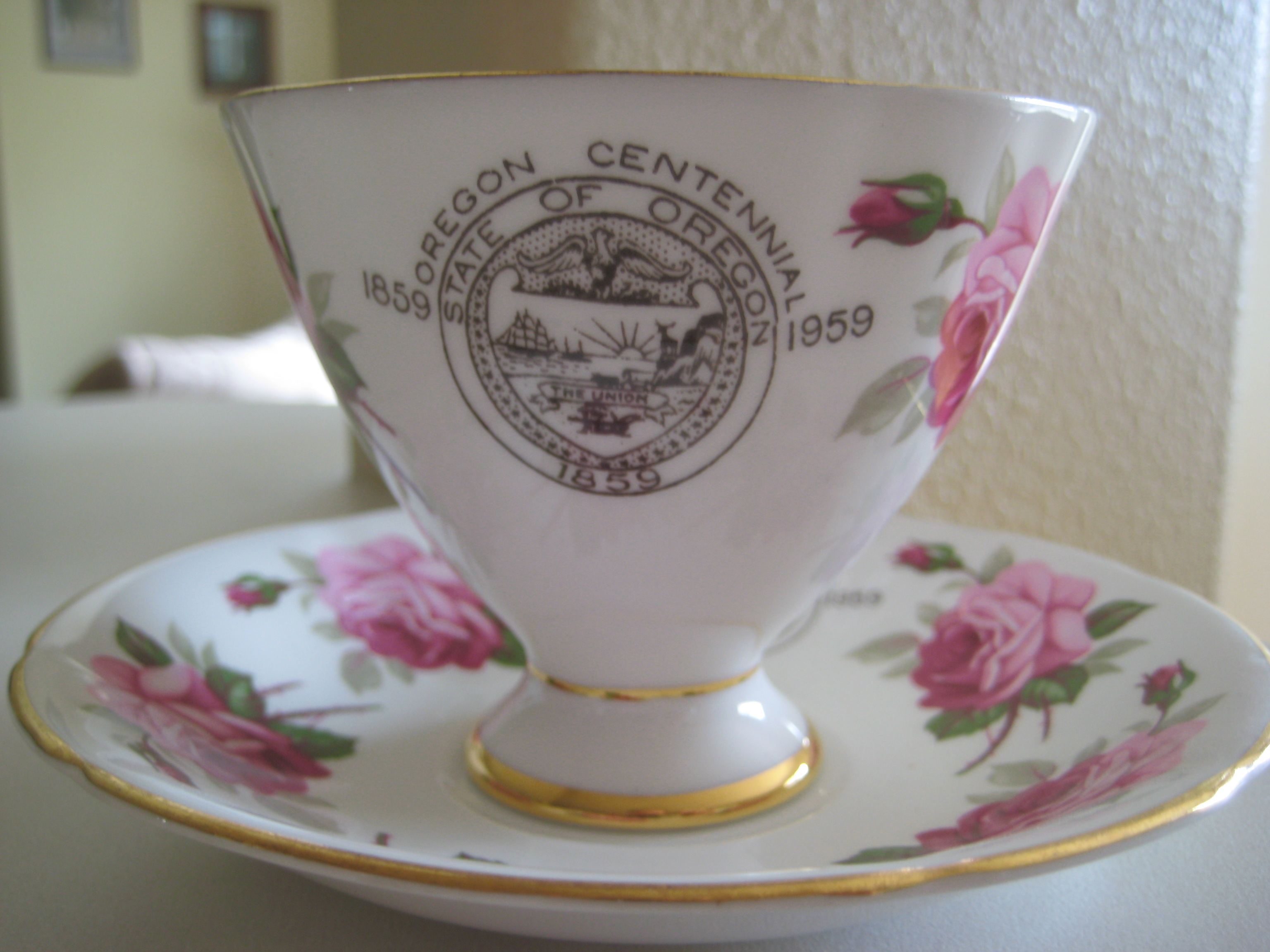 The cup and saucer have pink roses and have the Oregon Centennial design stamped on both. They also both have gold along the rims.