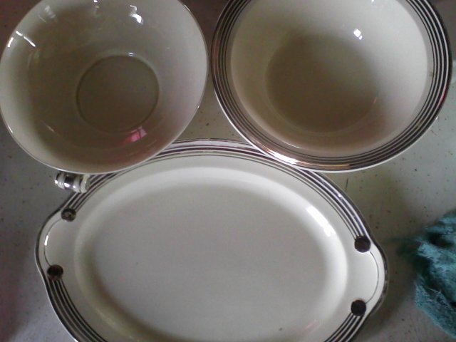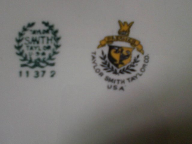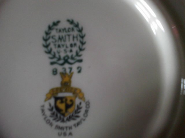 3 pieces of Premier Taylor Smith Taylor china. 1st a platter with the #'s11372 stamped in green white to cream color w/ 5 silver rings going around the rim of the platter. 2nd is a cereal or soup bowl w the #'s 8372 stamped in green on the back same design as the platter. 3rd a bowl shaped with little holders on the sides the 5 silver rings r on the out side ofthis dish and one at the bottom on back stamped in green #2375. The Platter and the cereal or soup bowl also have .6 stamped onthe back and the other one has a .2 on it they r all stamped 2x one in green the other in black and yellow the yellow part say premier the black says Taylor smithTaylor Co. U.S.A. The Green stamp says Taylor SMITH Taylor U.S.A.