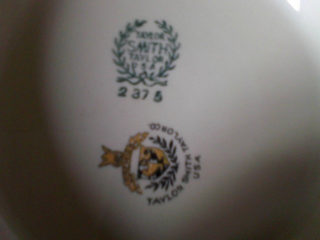 Distinguishing marks 5 silverr rings going around the dinnerware also stamped on back 2x w Taylor smith Taylor U.S.A the other stamps says Premier Taylor smith Taylor U.S.A. 2 ofthem have a # 6 on them the other has a #2 . All ofthem have #'s underneath the logo Of taylor smith Taylor. #'s 2375,8372and11372.