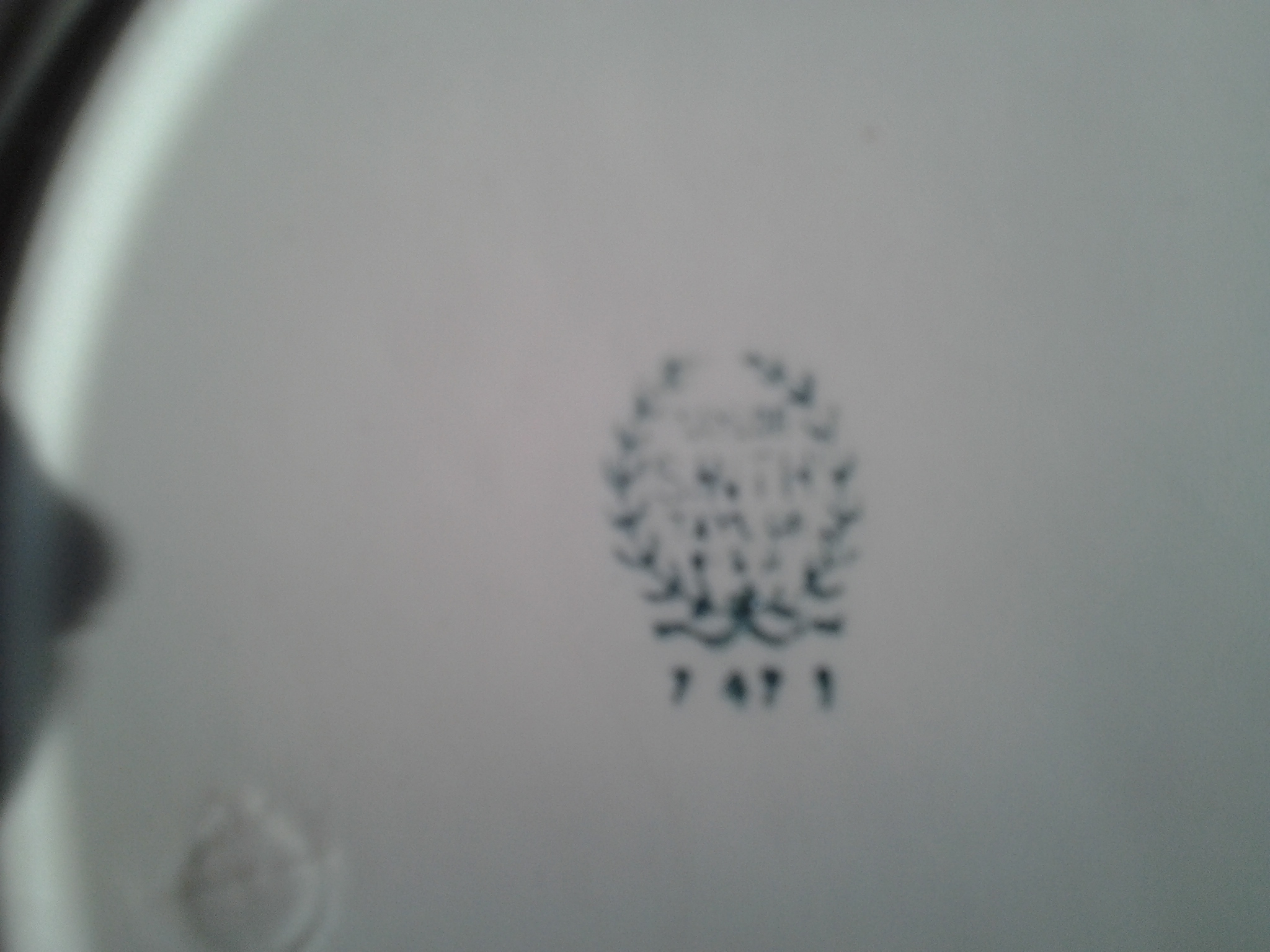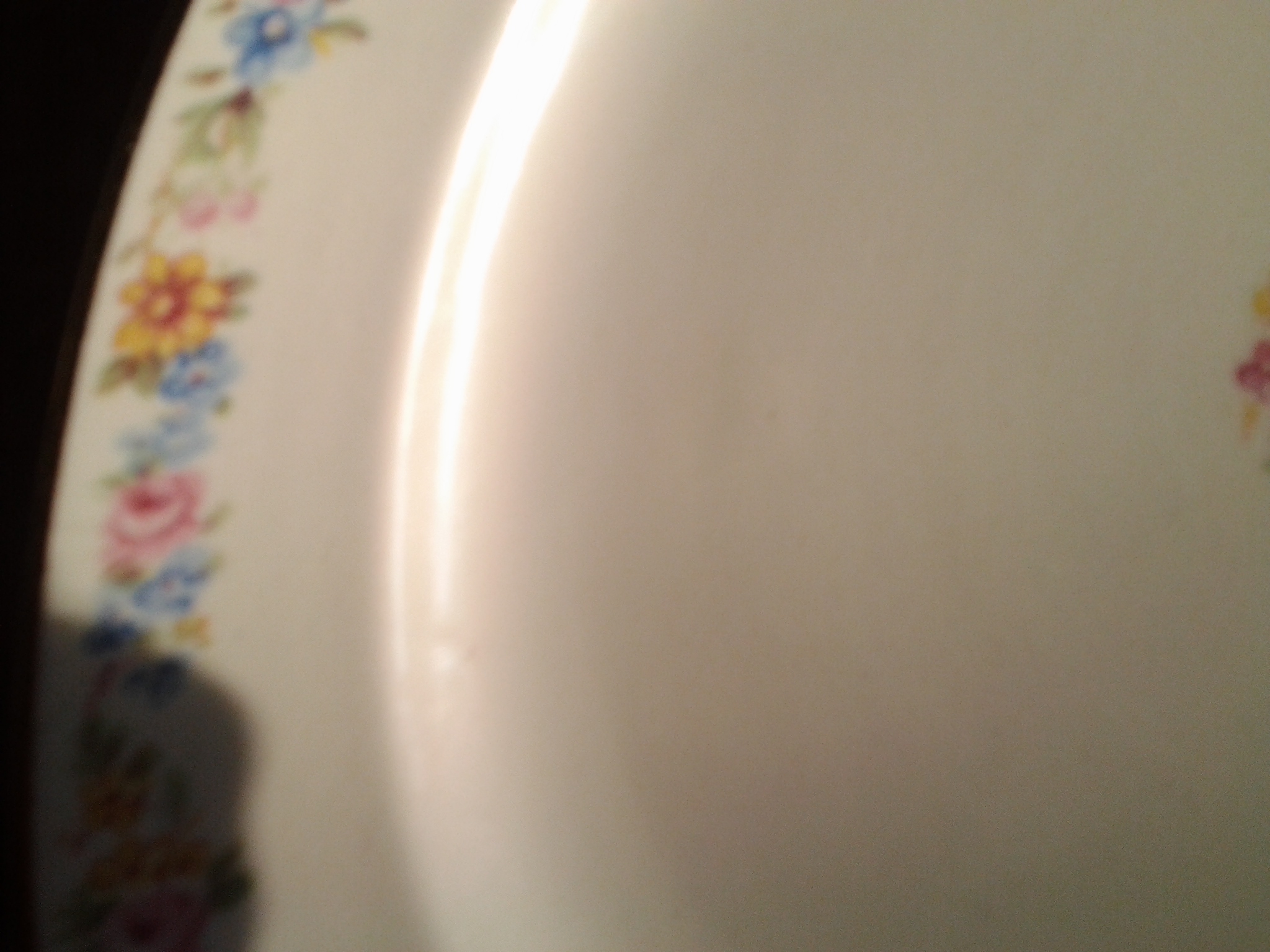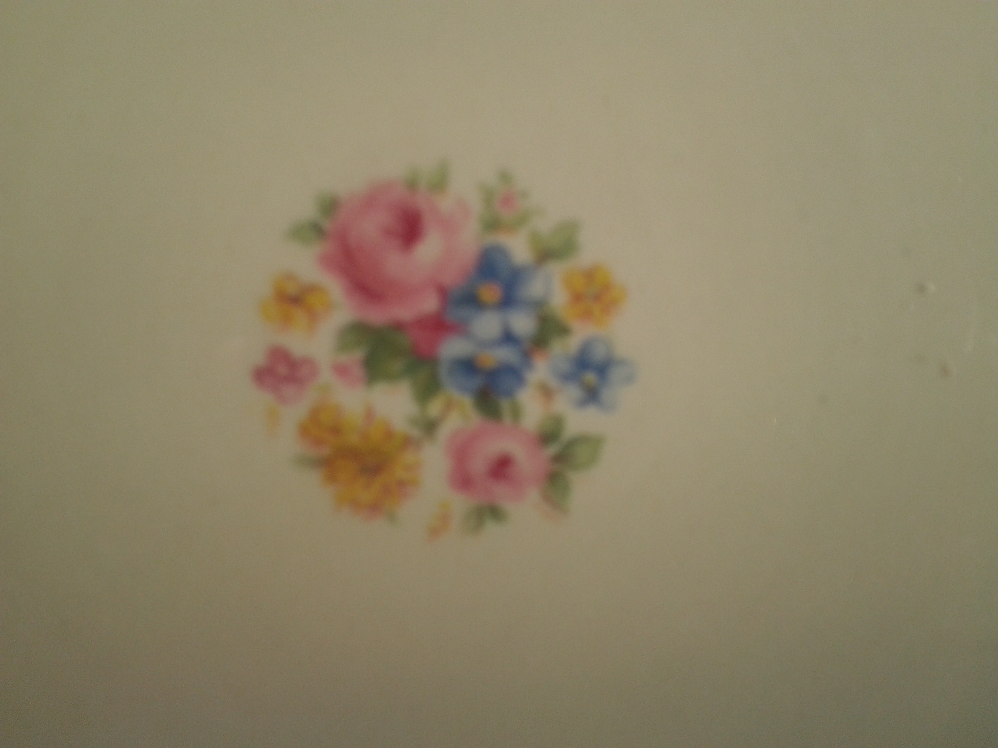 Taylor Smith Taylor gold rimmed, floral pattern. Design in center is two pink roses with three yellow and three blue flowers with green leaves. Edge pattern is same flowwers/greens that start at gold rim and go approx half way down towards bevel.